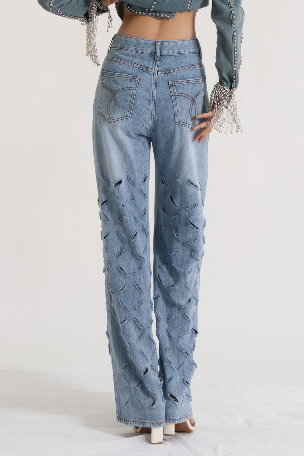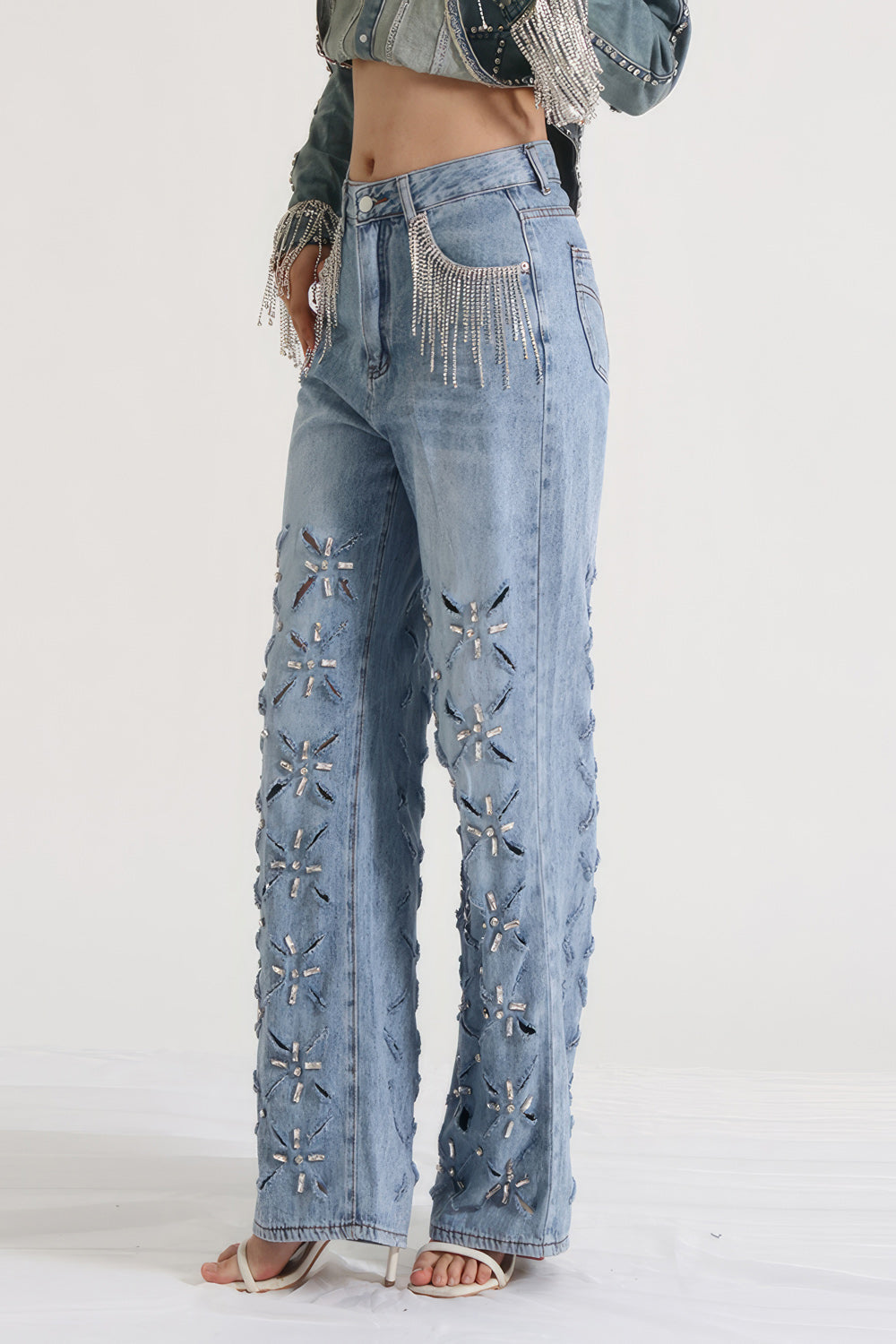 Look dazzling in our Jeans with Rhinestones! This stylish pair features a high waist. sparkly pockets. and rhinestones adorning the cuts and wide legs. Shine bright in these chic jeans!
