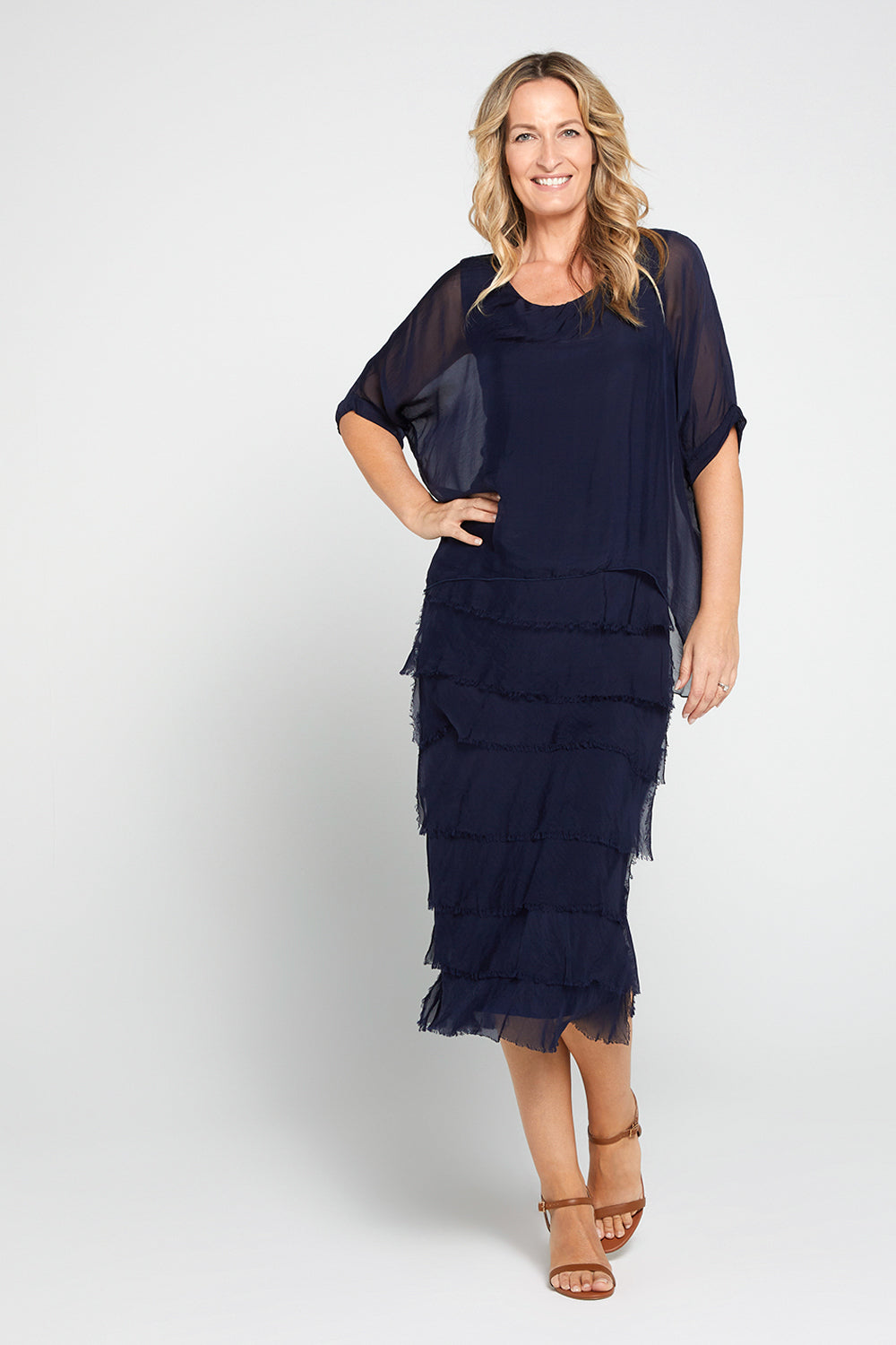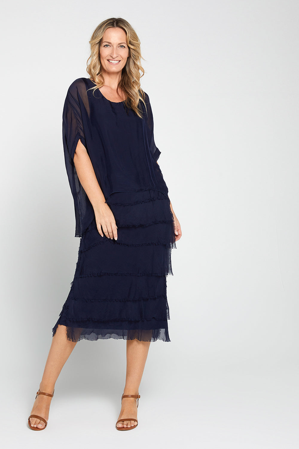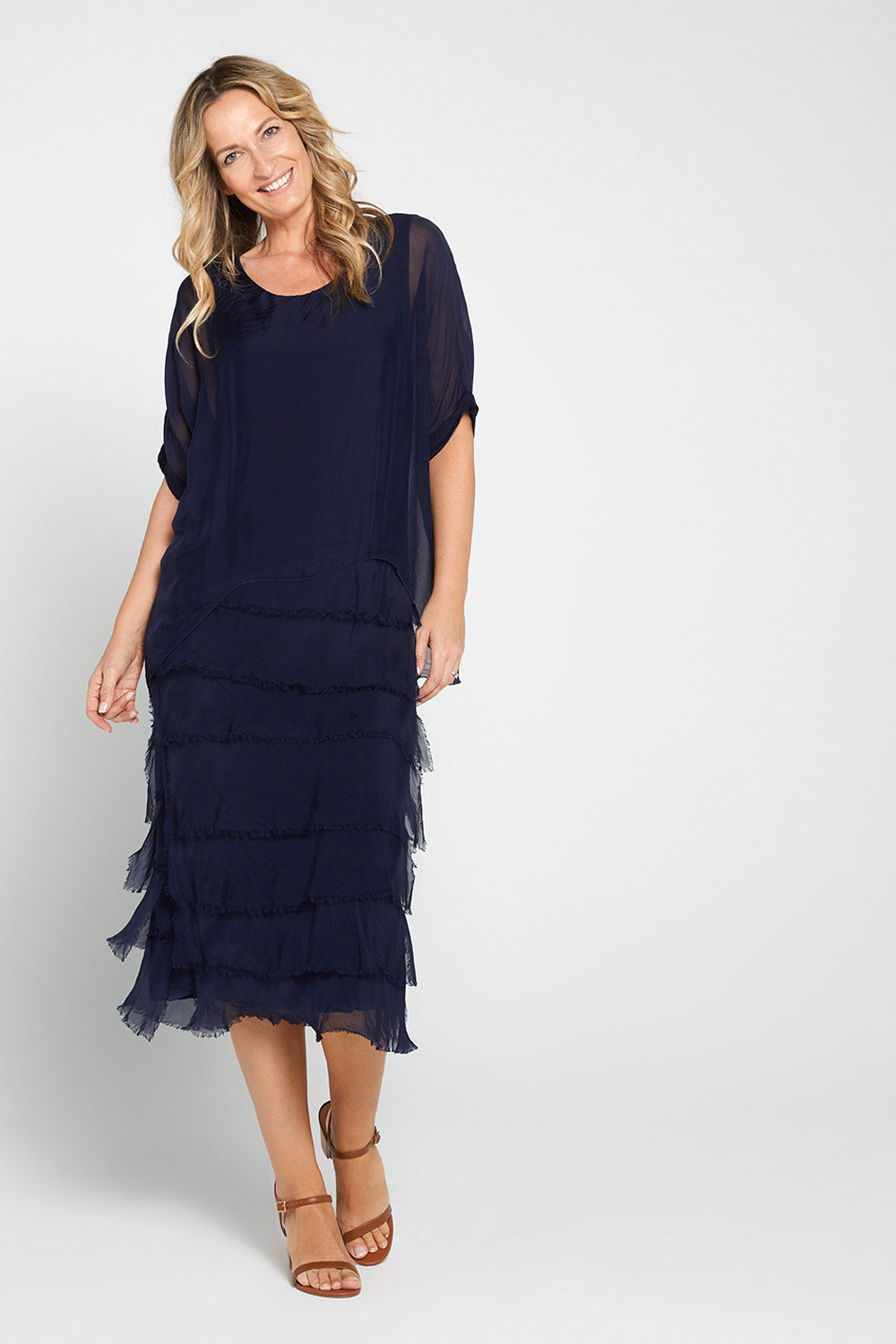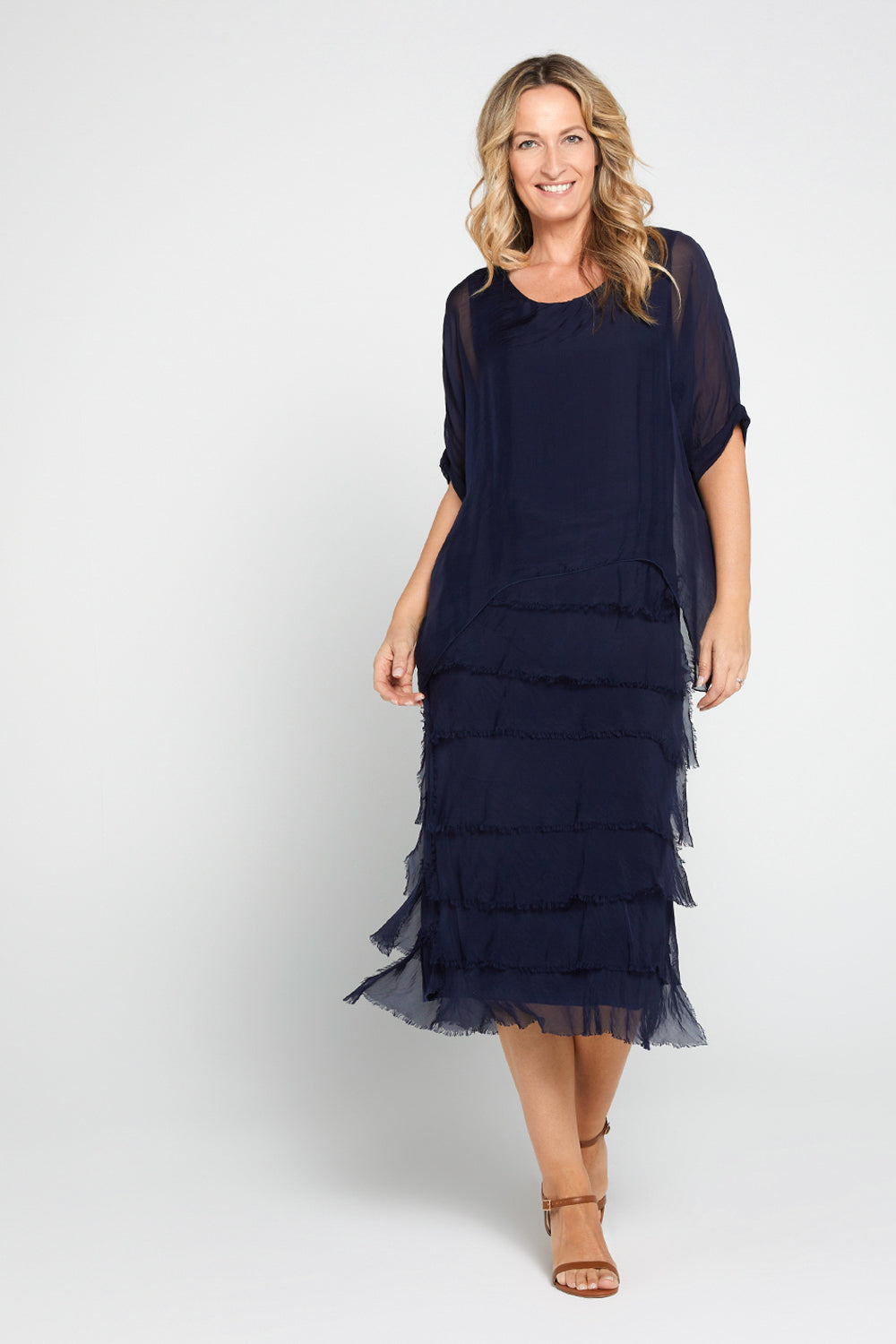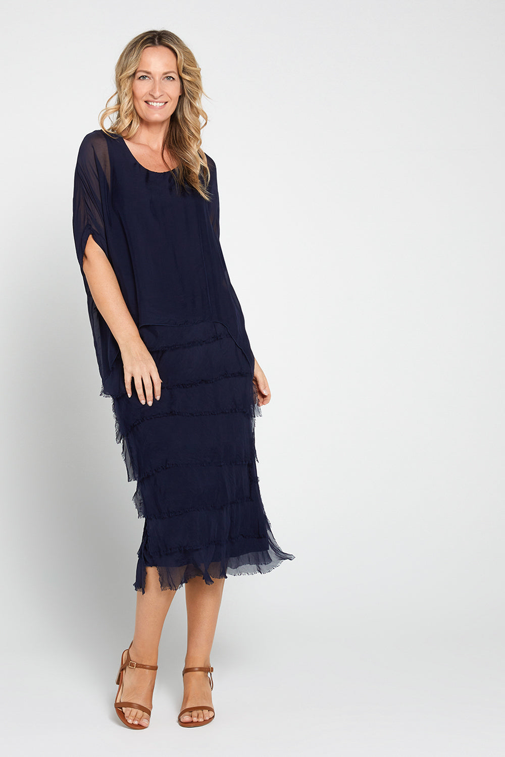 The Margo Silk Dress has been exceptionally popular, and it has just come back in our favourite deep navy blue for a classic lookTaking inspiration from the flapper dresses of the 1920s, this stunning silk blend dress features a ruffle layered skirt with raw edges for a natural fringed effect. Combined with the silky overlay and soft, supple jersey underlay, this is a dress that truly looks and feels luxurious.