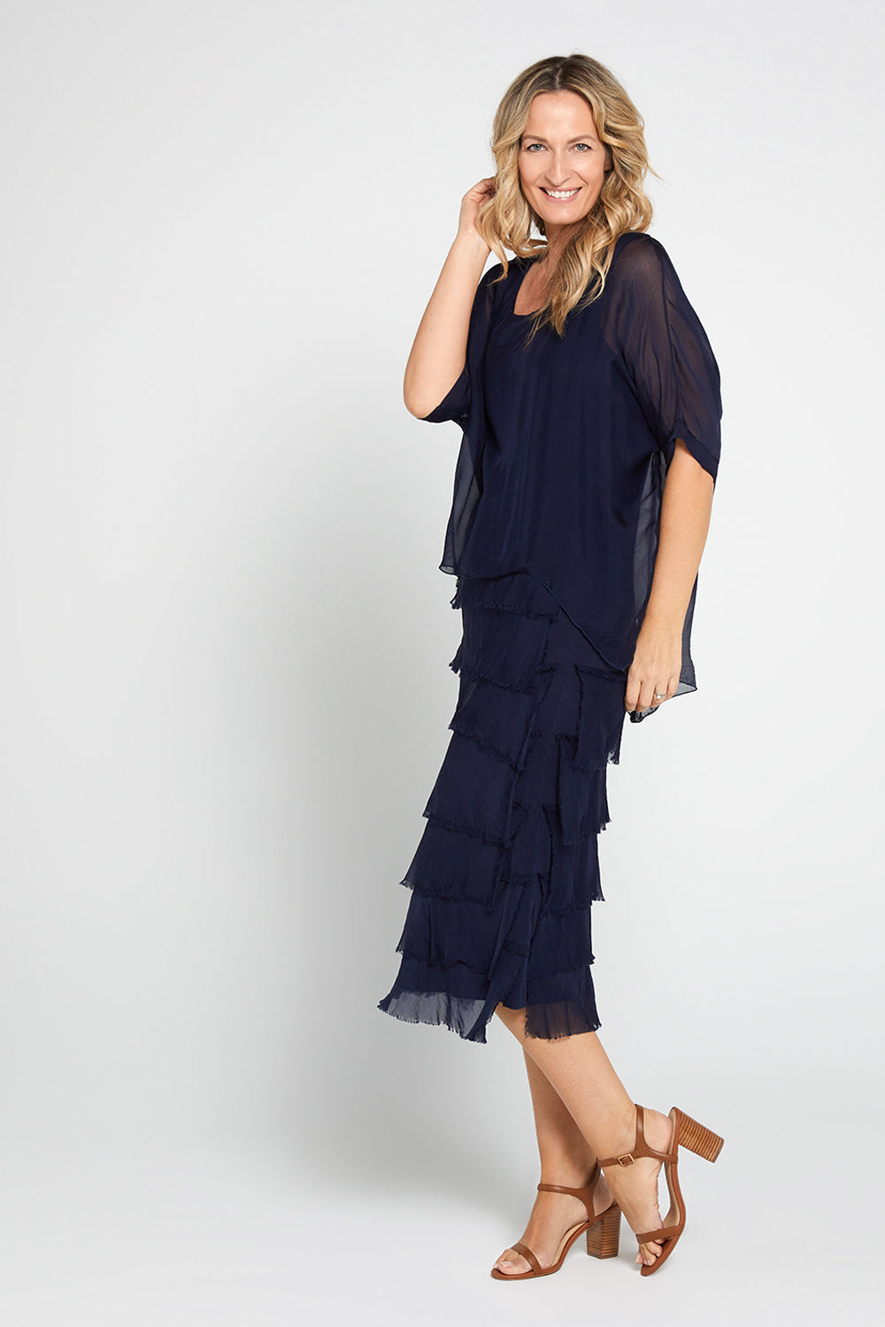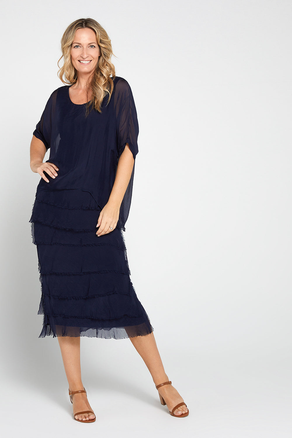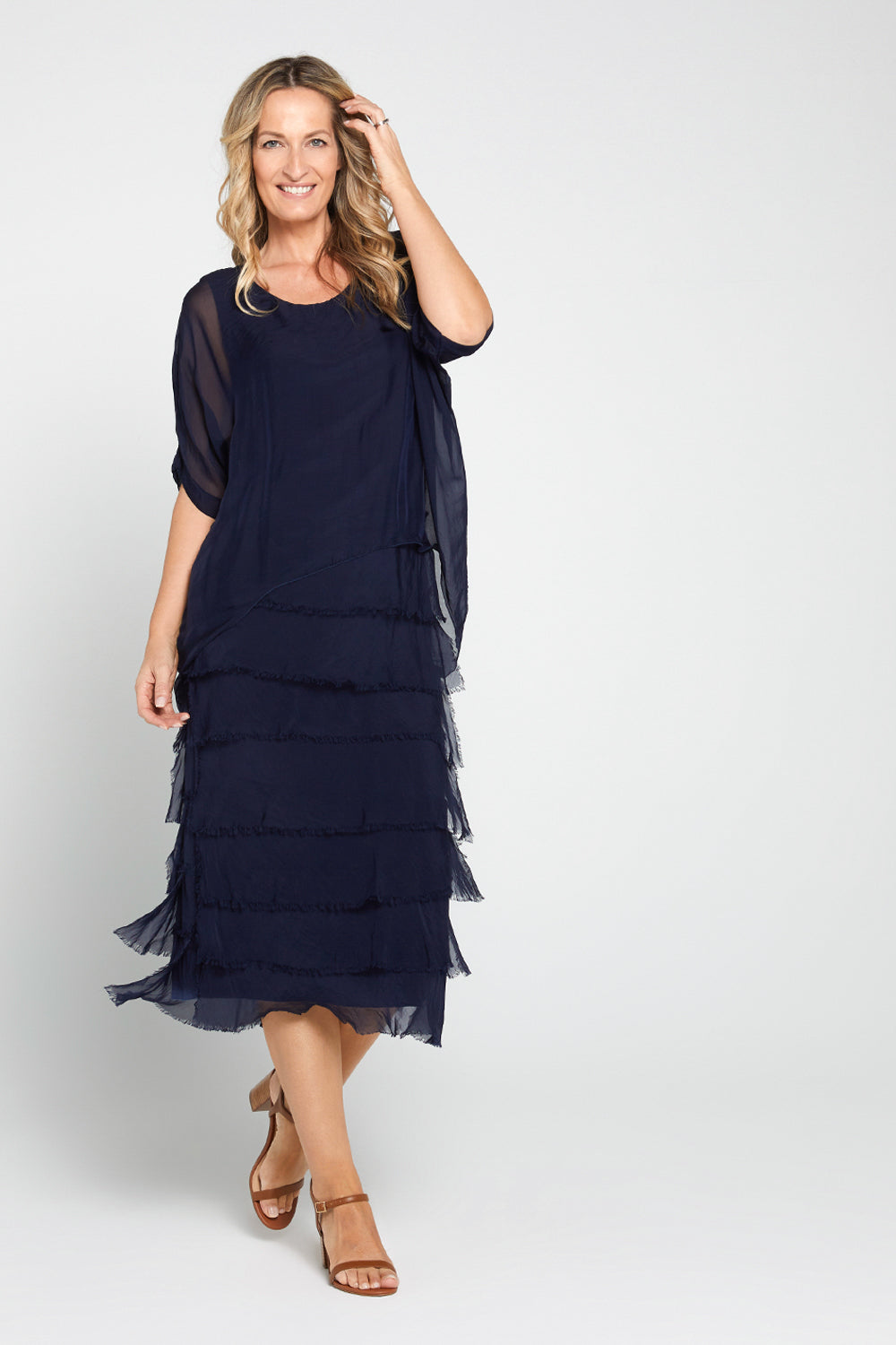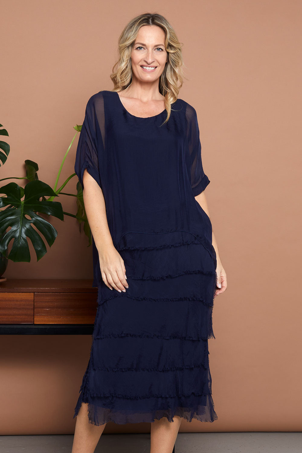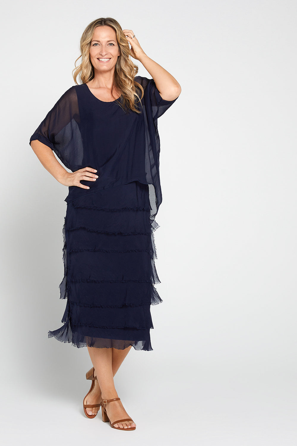 The Margo Silk Dress has been exceptionally popular, and it has just come back in our favourite deep navy blue for a classic lookTaking inspiration from the flapper dresses of the 1920s, this stunning silk blend dress features a ruffle layered skirt with raw edges for a natural fringed effect. Combined with the silky overlay and soft, supple jersey underlay, this is a dress that truly looks and feels luxurious.