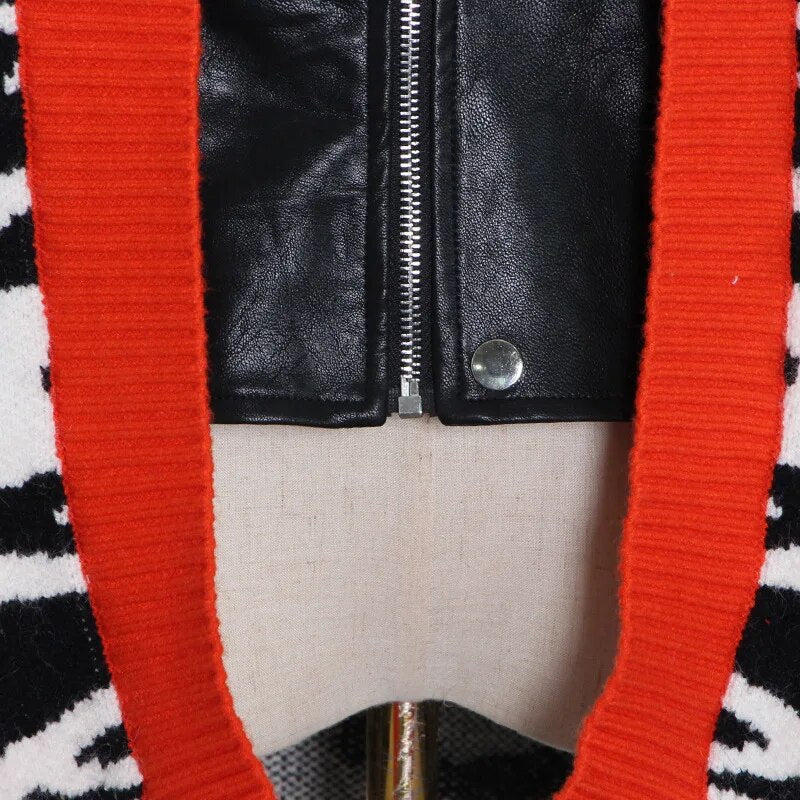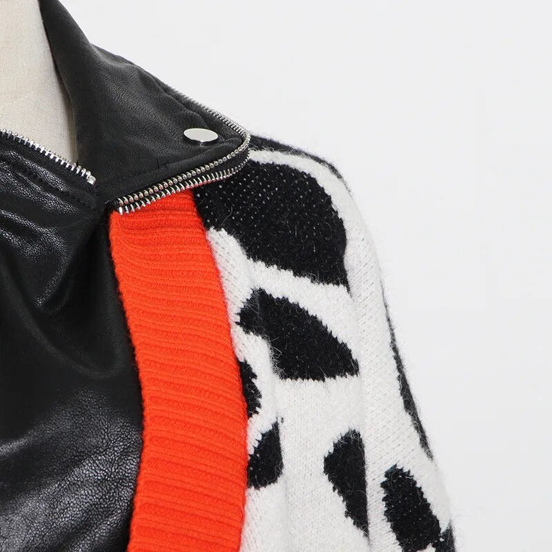 This jacket is crafted from faux leather, featuring spliced details, two pockets, and a zipper front closure. Perfect for wearing off the shoulder or zipped up for a more classic look.