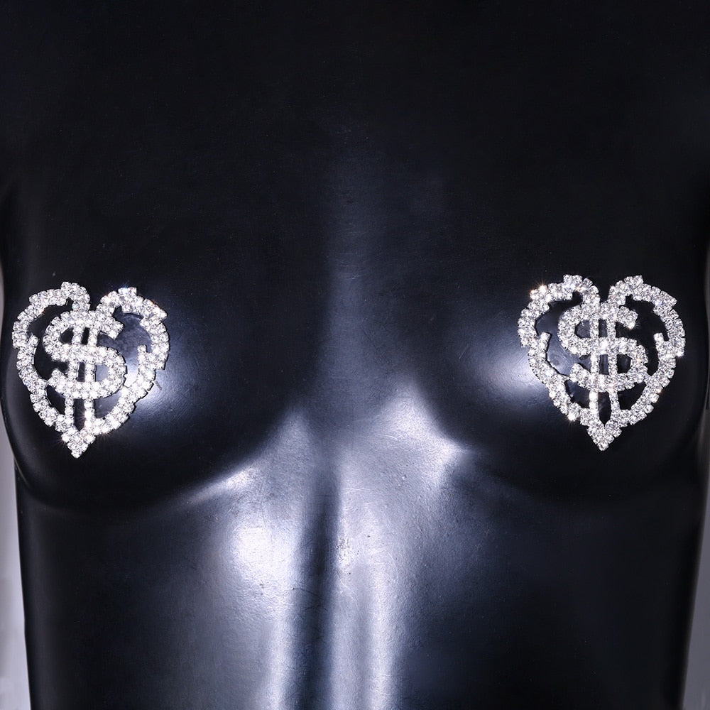 This unique design of unique jewelry covers the nipple of women. This is body jewelry and it is made of rhinestone and copper. It is available in gold and silver color and has a dollar design.