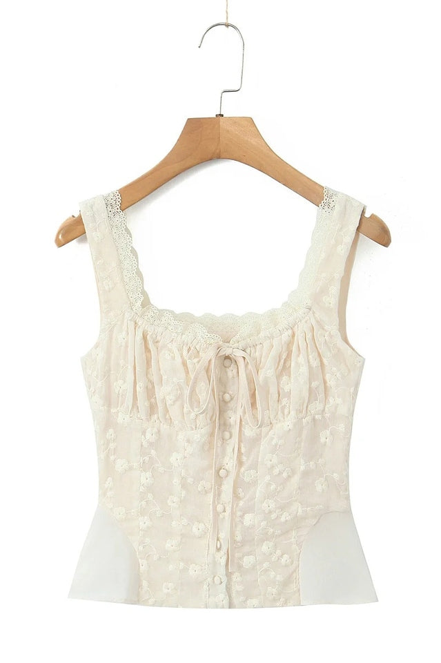 With romantic details, sophisticated tones, and beautiful pieces, Vintage Embroidery Ruffle Top & Skirt Set  is the perfect invitation to our collection. Cut from beautifully embroidered brocade, the 'Jean' exudes classic femininity and vintage feel with a fitted button front, sweetly nude bust, and a flowing tutu skirt.