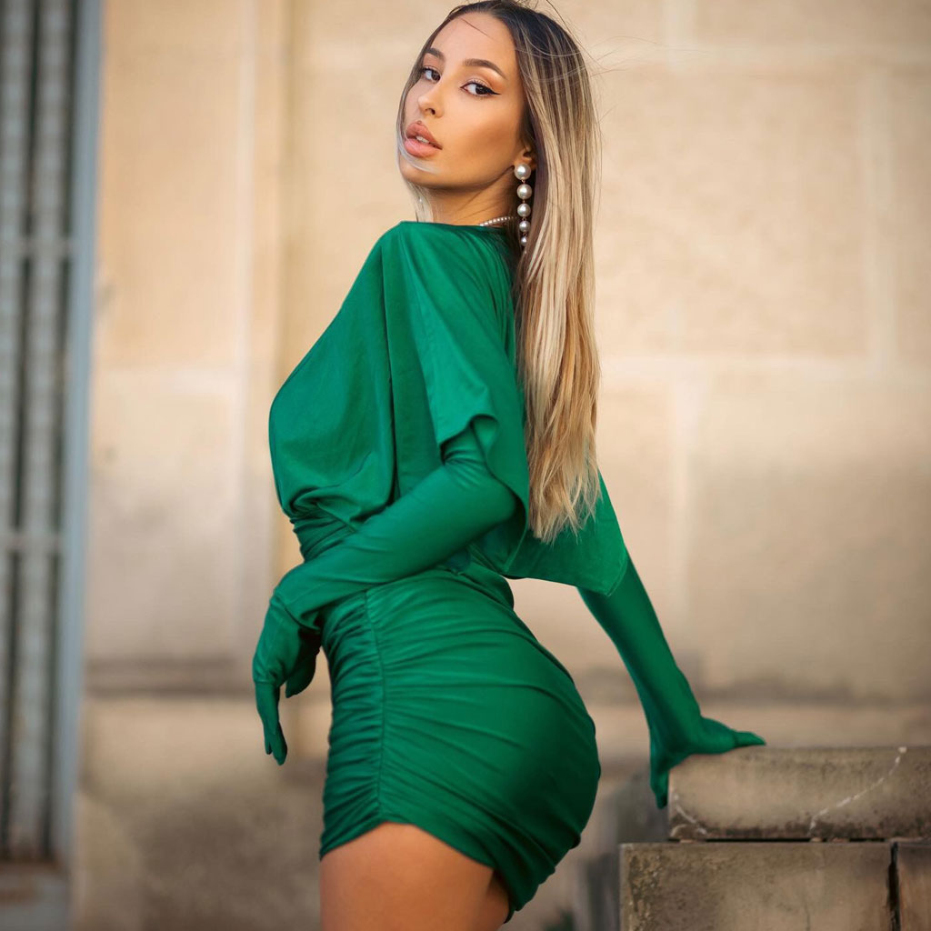 Elegant Draped Shoulder Pad Glove Sleeve V Back Ruched Bodycon Mini Dress