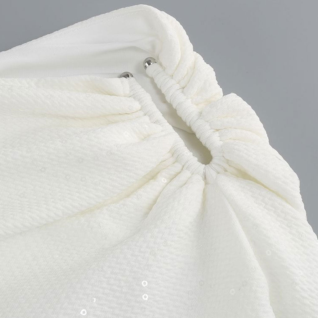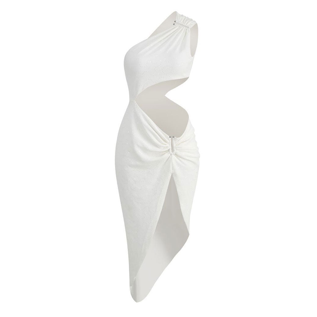 Textured Sequin Metal Decor One Shoulder CutOut Ruched Slit Midi Cocktail Dress
