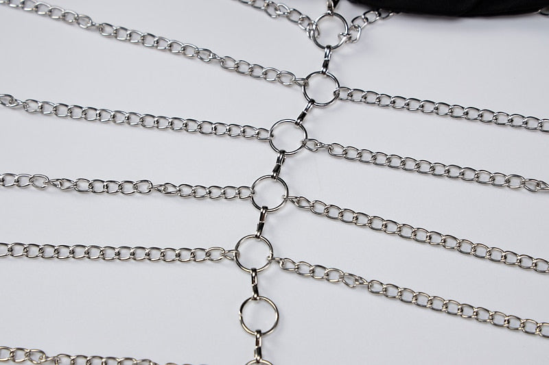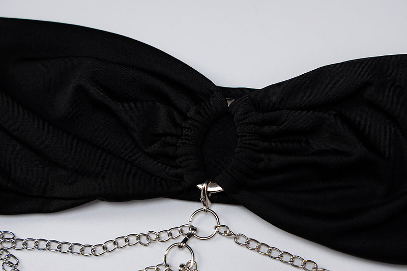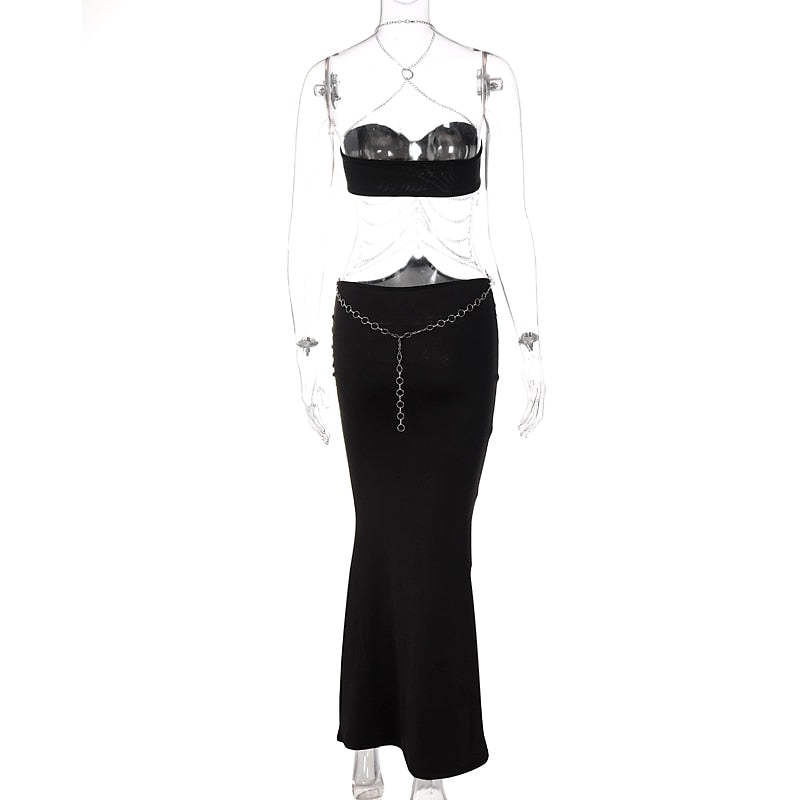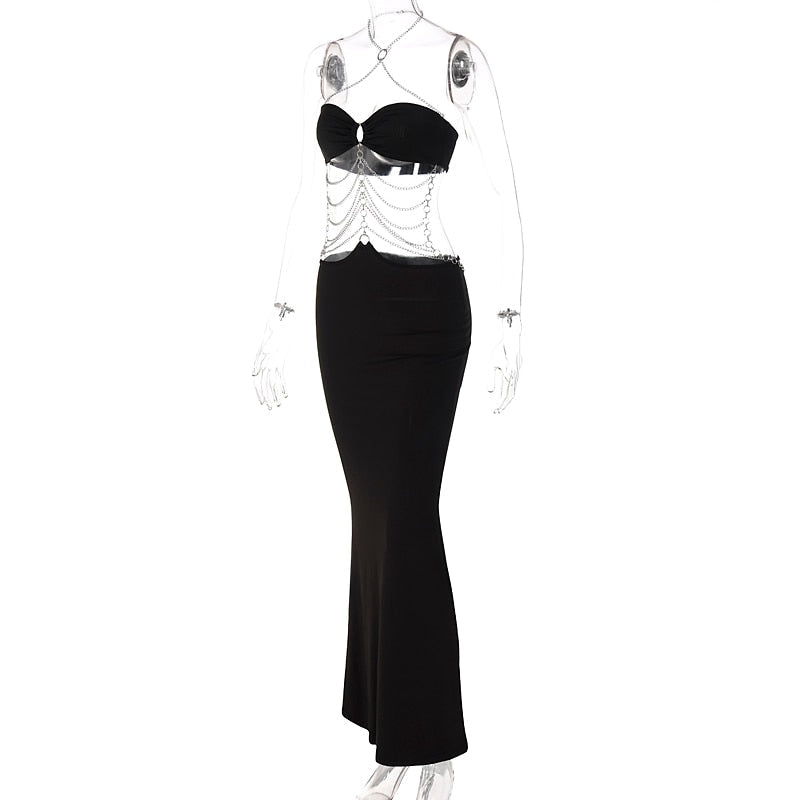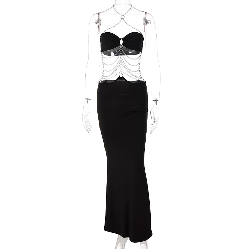 This long dress is made of polyester and has a hollow-out design and a solid black color. The dress has a chain decoration that adds a sexy touch to the dress. This dress is perfect for any occasion, whether it be formal or casual.