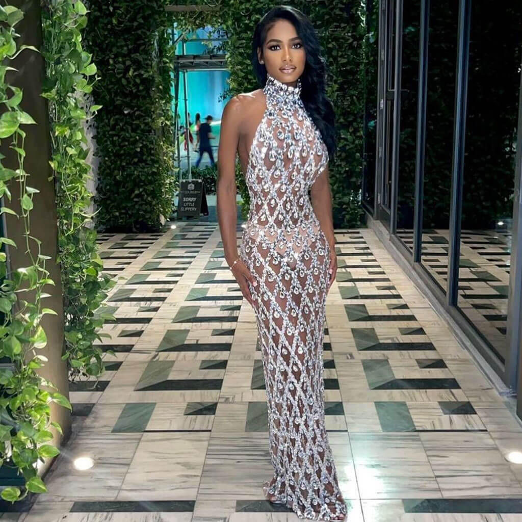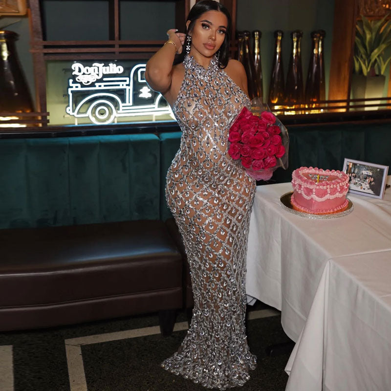 Luxury Rhinestone Embellished High Neck Bodycon Mesh Maxi Evening Dress