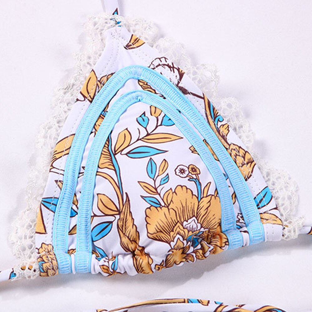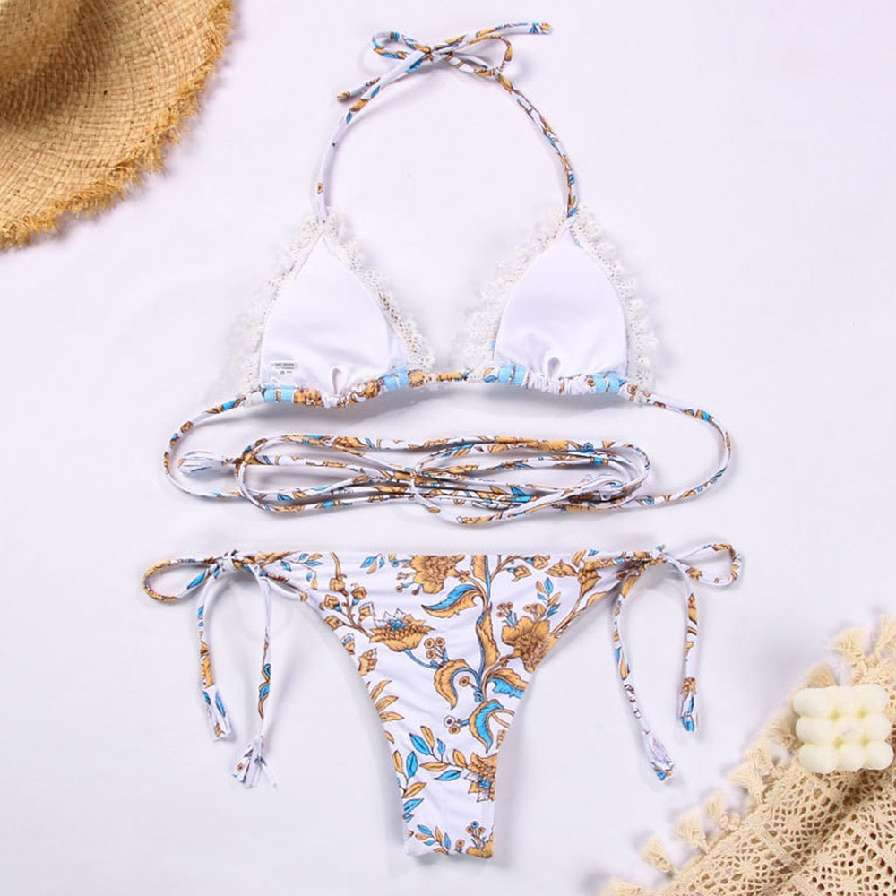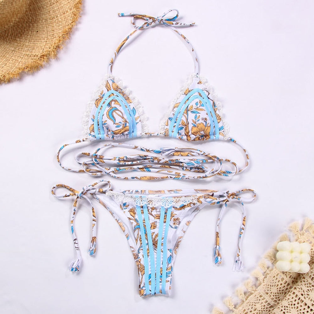 Our premium nylon two-piece bikini is perfect for any occasion. The low waist is wire-free and features a geometric printed pattern. The top has spaghetti straps with a back tie and the bottom has a cheeky cut.