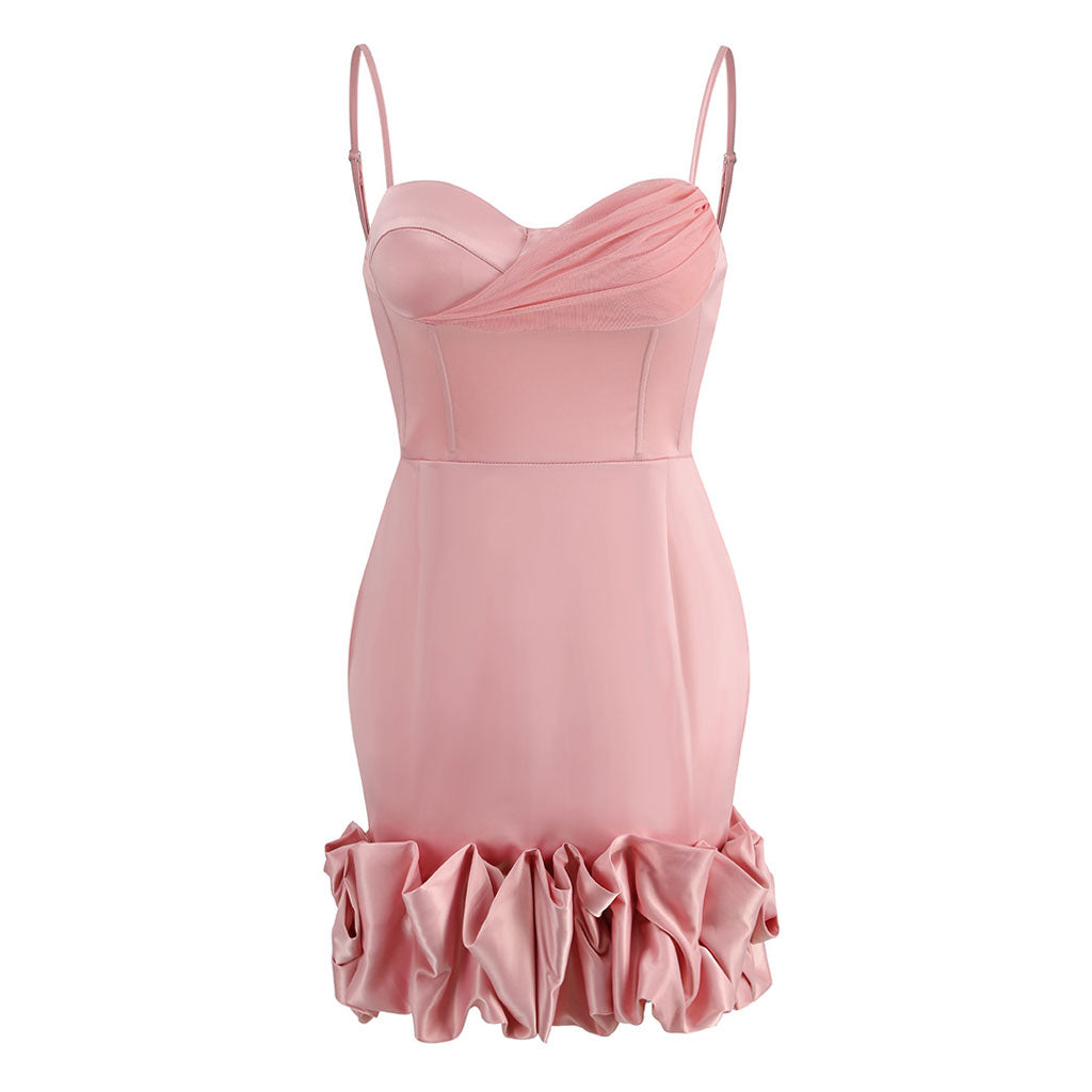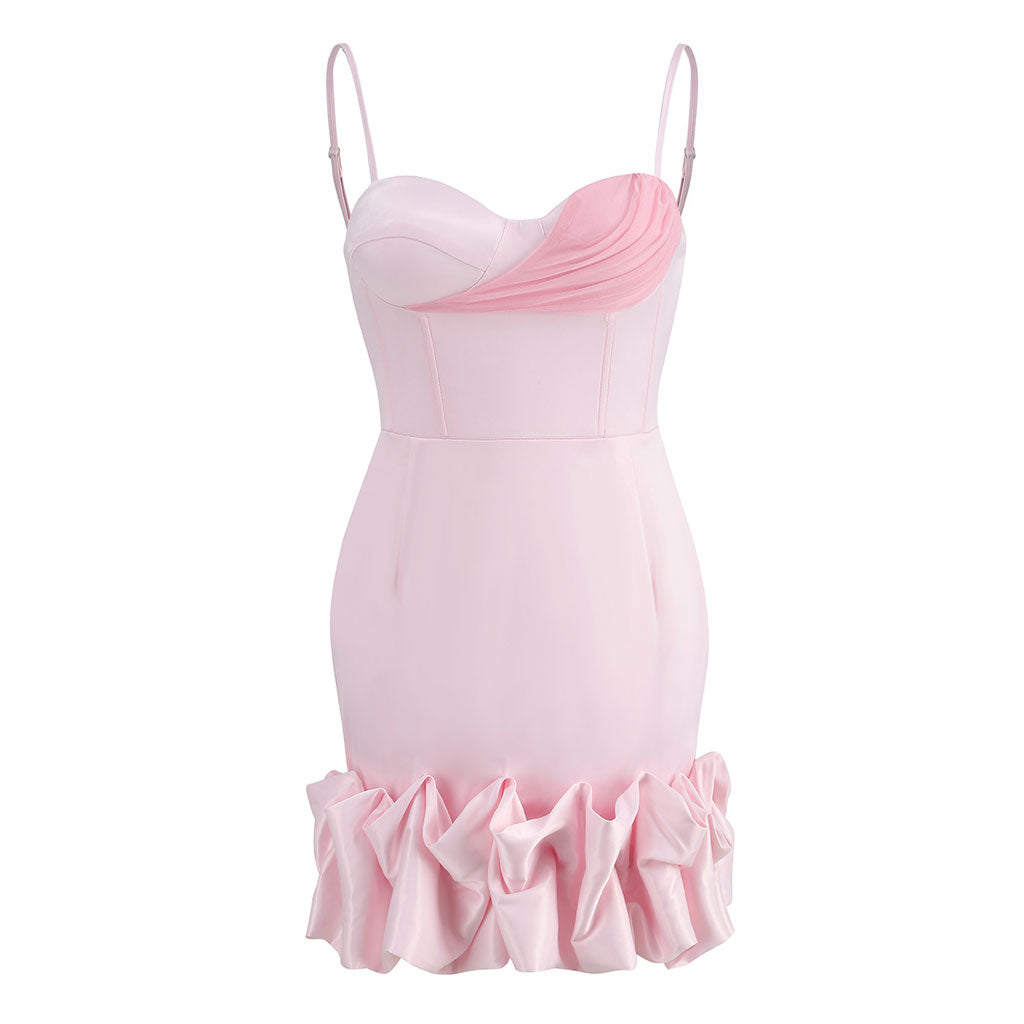 Flattering Ruched Mesh Panel Sweetheart Ruffle Cami Satin Bodycon Mini Party Dress