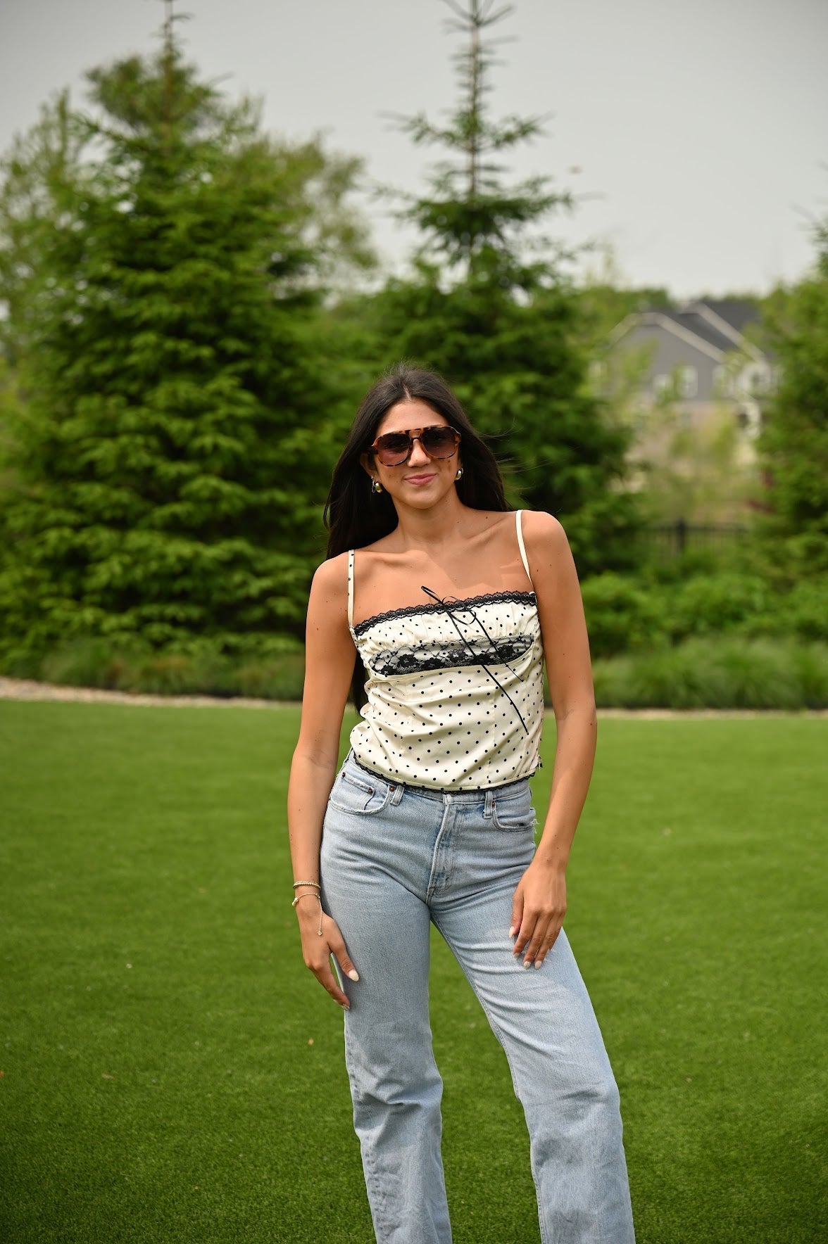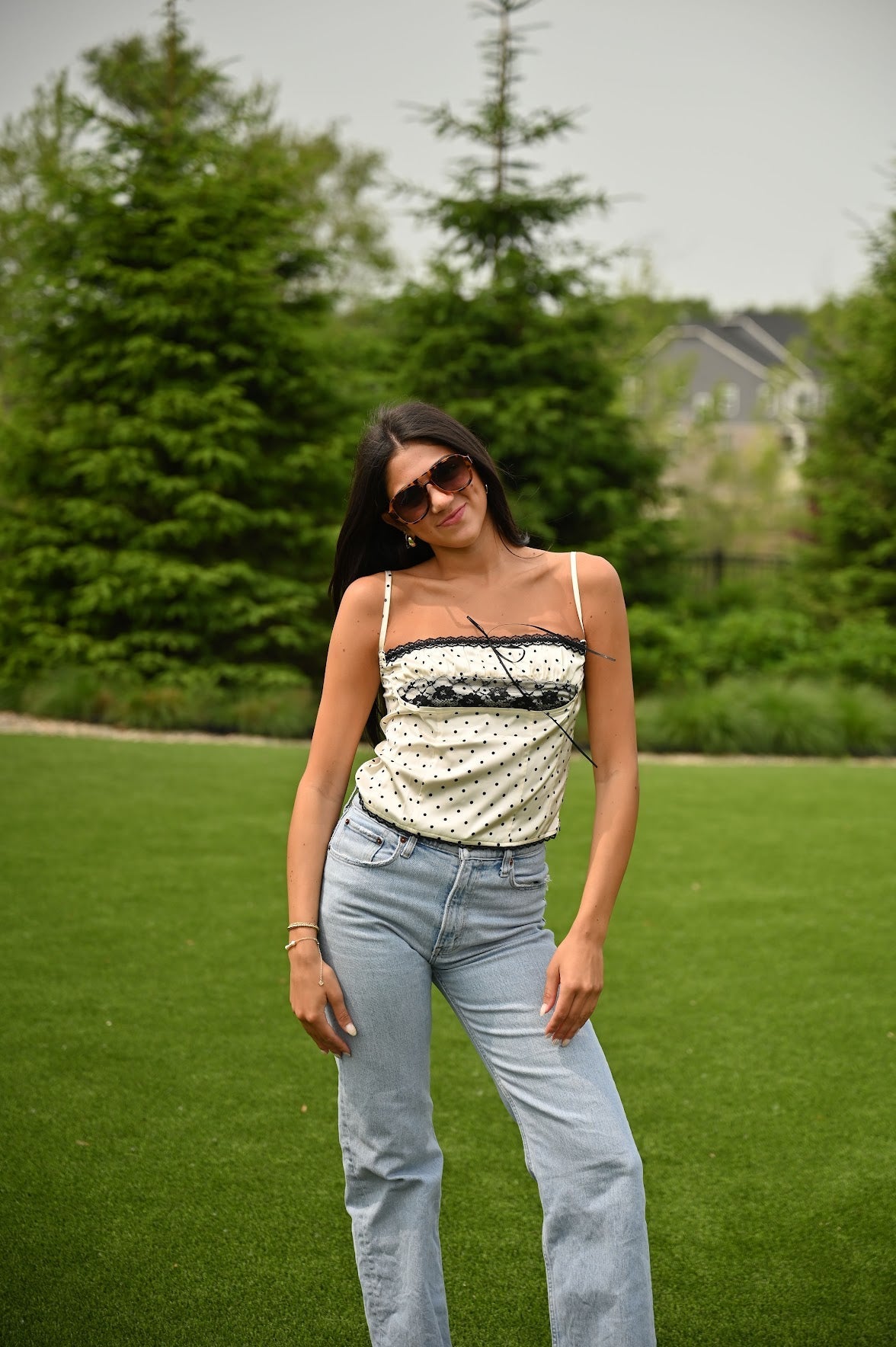 Unleash your inner fashionista with our 5th Ave Top! Featuring a sleek black-ivory polka dot print and delicate floral sheer lace, this cami top balances sophistication and playfulness. Perfect for adding a touch of elegance to any outfit. (Warning: may cause heads to turn with envy!)