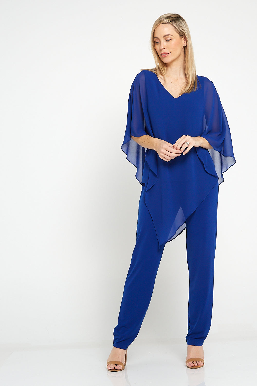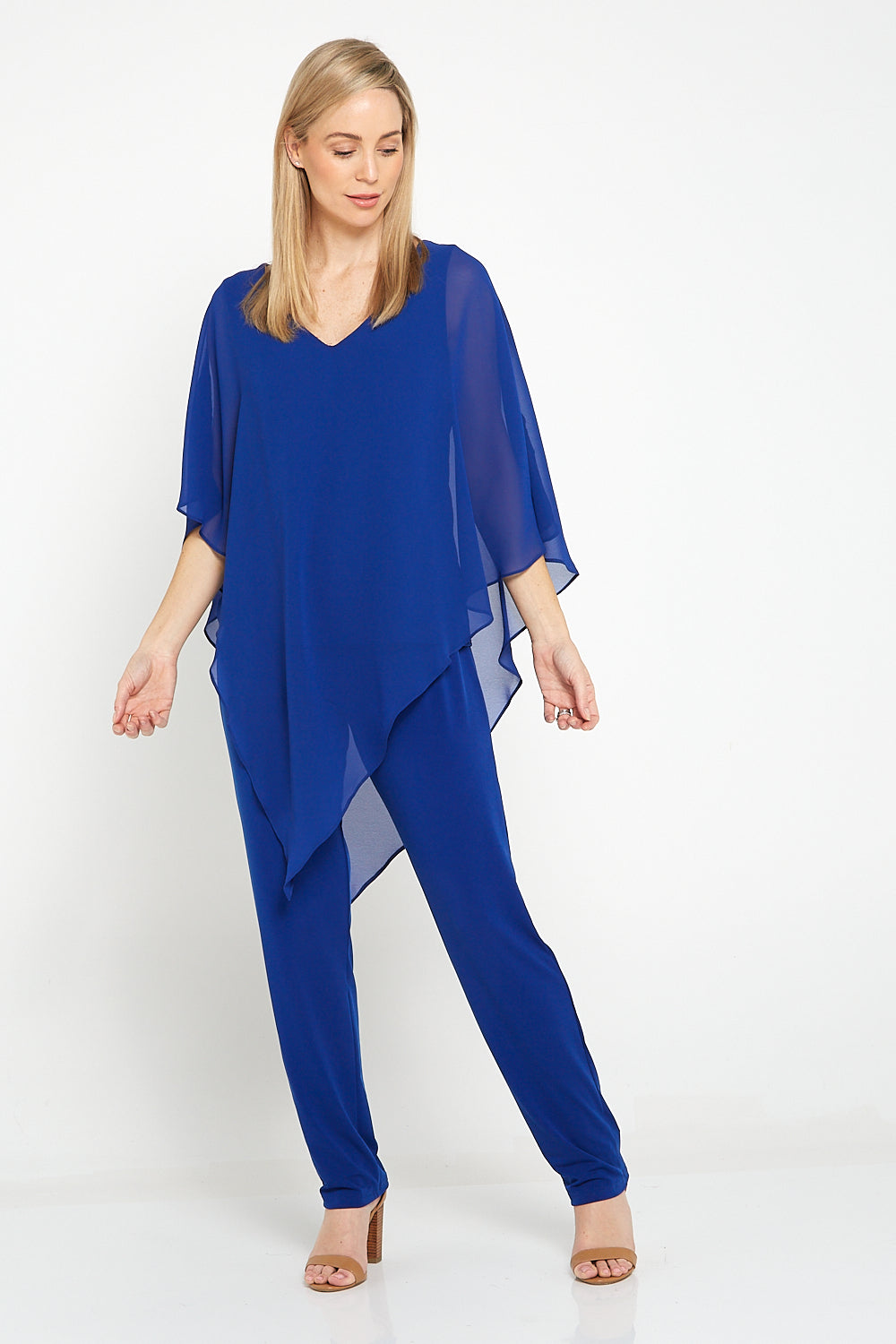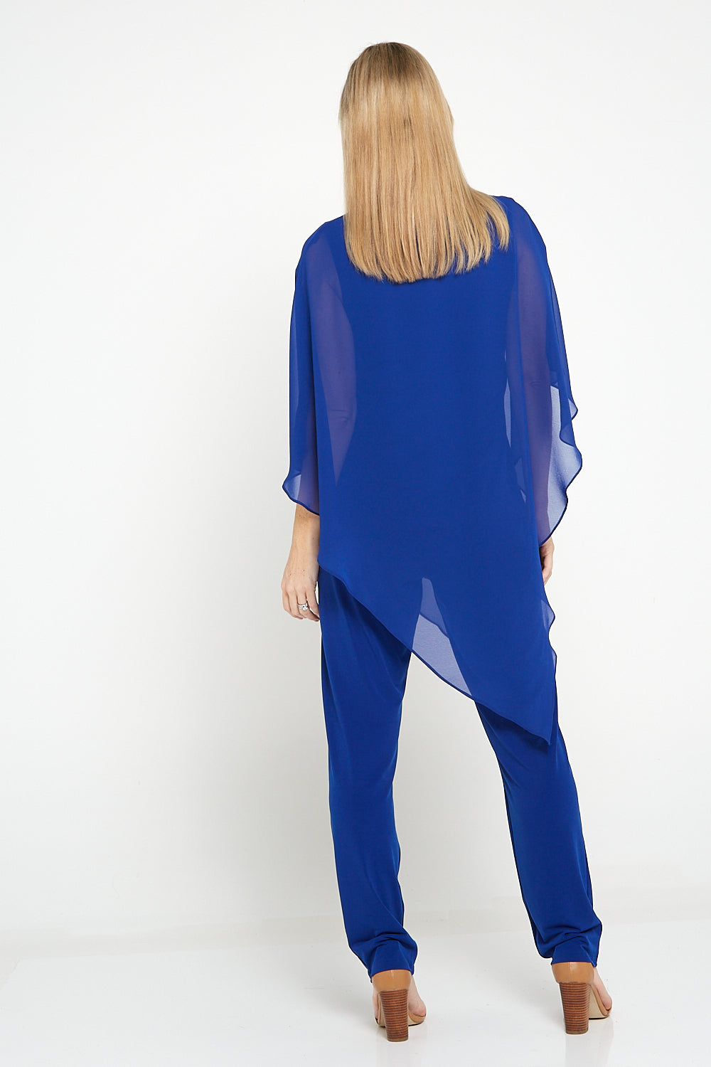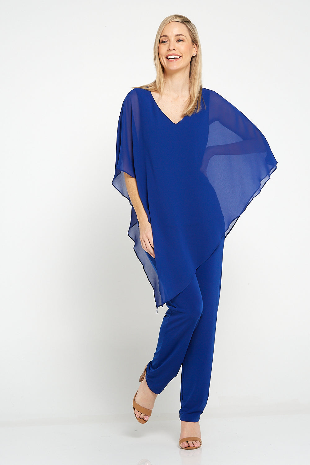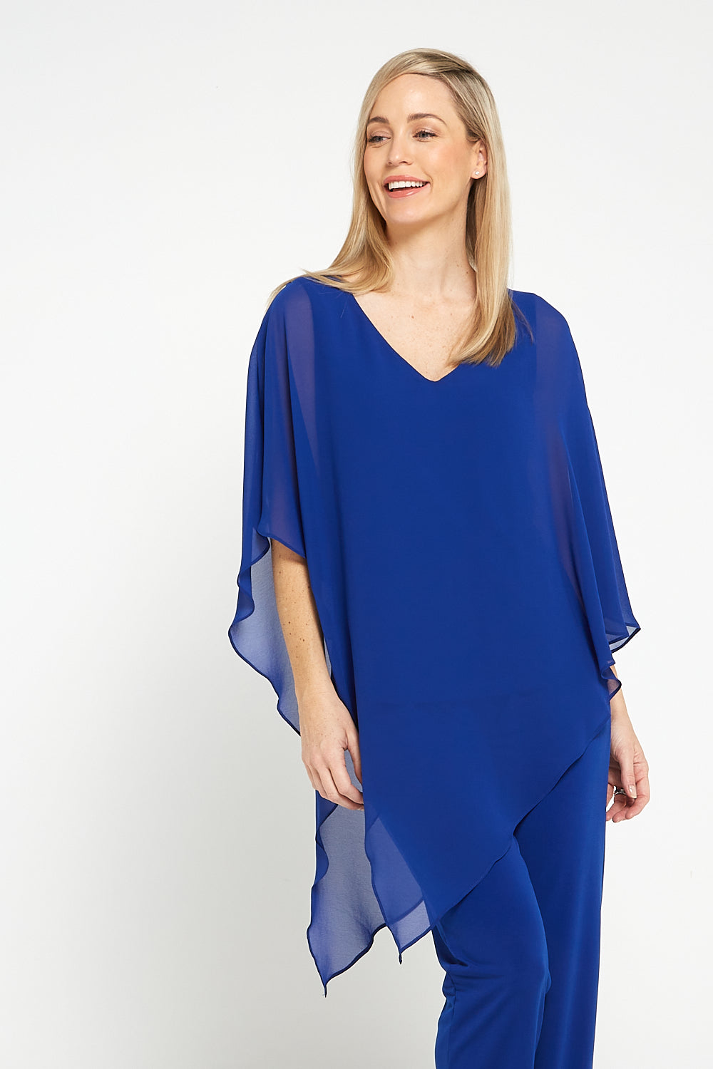 Exceptionally elegant, the Australian made Aubriella Top is perfect for the evening. Simple in its construction, it consists of a jersey underlay, with a floating chiffon overlay that drapes to a point to one side. This also allows you to tie the points together, to create a different look. The royal blue is always a beautifully bold and sophisticated colour option for special occasions. Such a stunning style for special occasions.