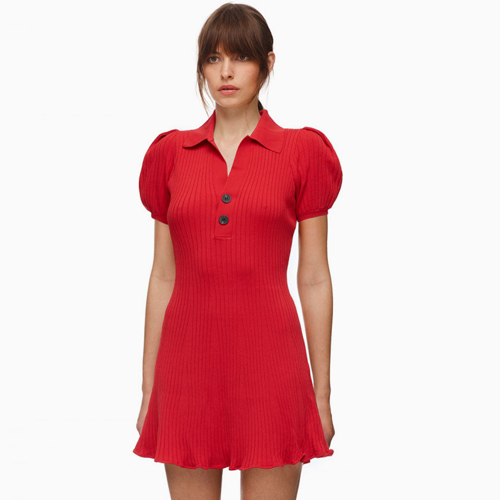 Swingy Collared Puff Sleeve A-Line Rib Knit Sweater Mini Dress - Red