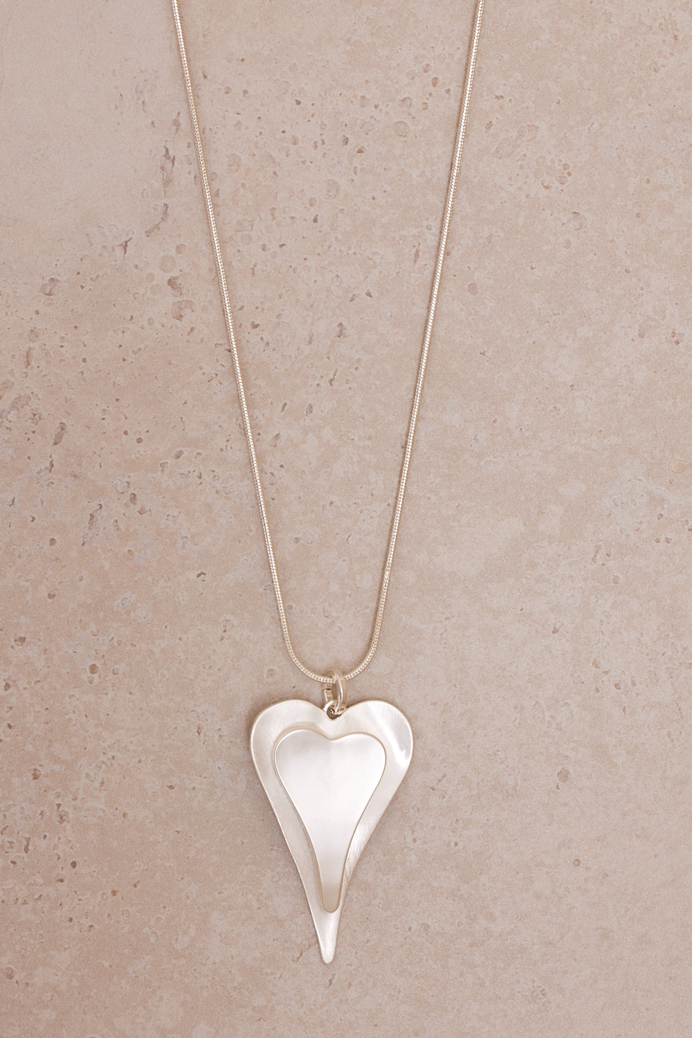 Express your love with this stunning silver-tone double heart pendant necklace. The sleek, layered heart design is suspended on a delicate snake chain, creating a modern and romantic look. Perfect for gifting or adding a touch of sentiment to your outfit, this versatile necklace is a must-have accessory for any occasion.