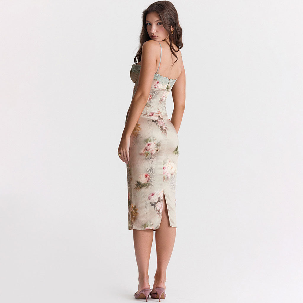 Luxury Lace Trim Bustier Spaghetti Strap Floral Print Bodycon Midi Satin Dress