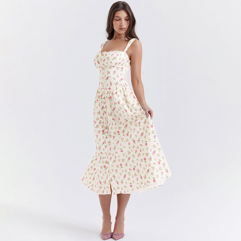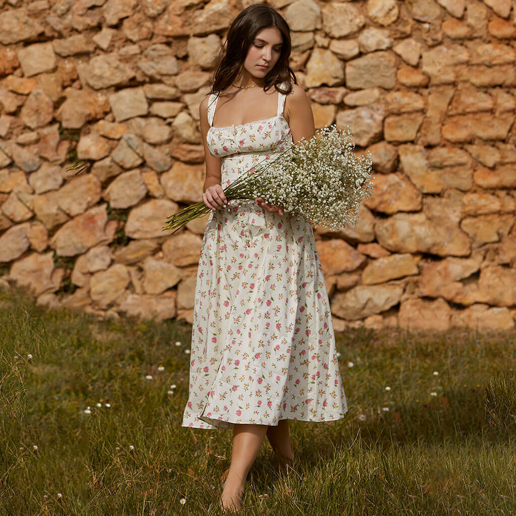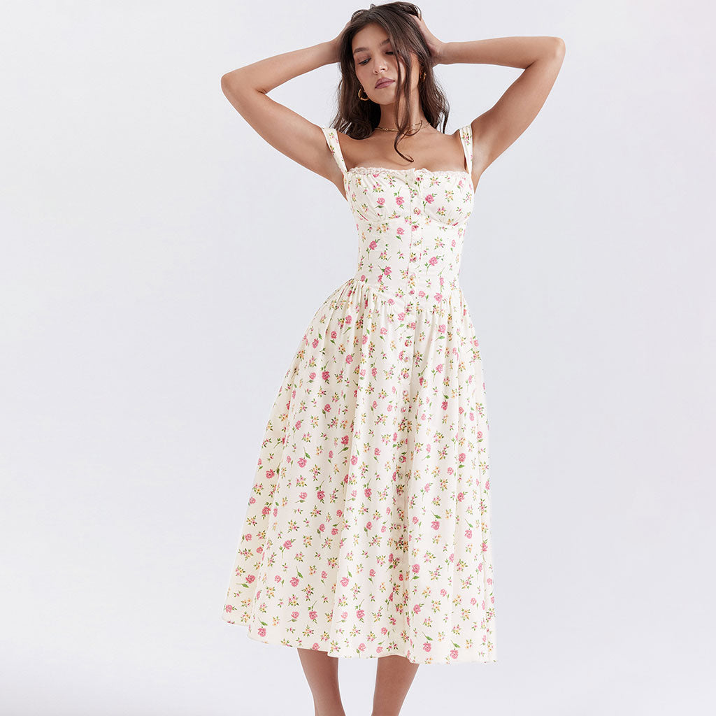 Prairie Style Square Neck Bustier Button Trim Drop Waist Side Pocket Midi SunDress