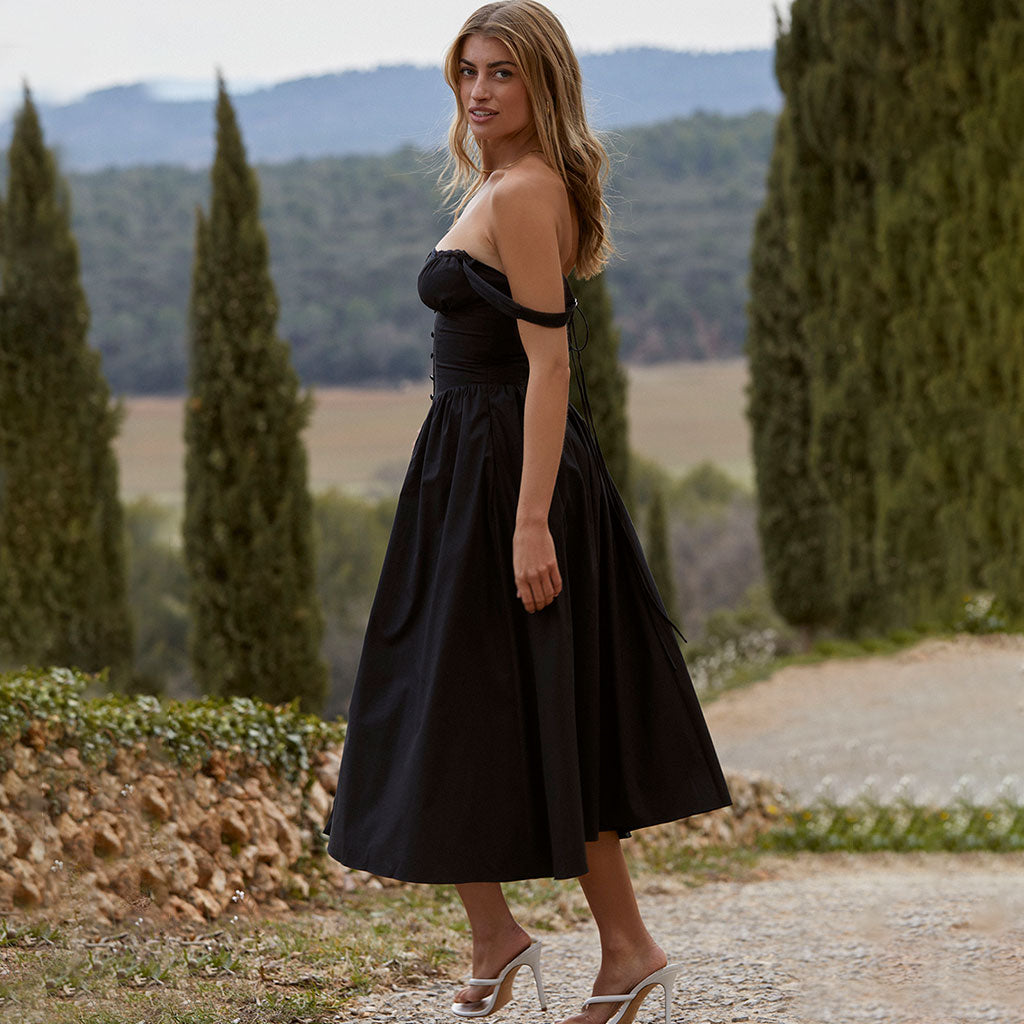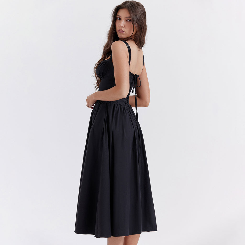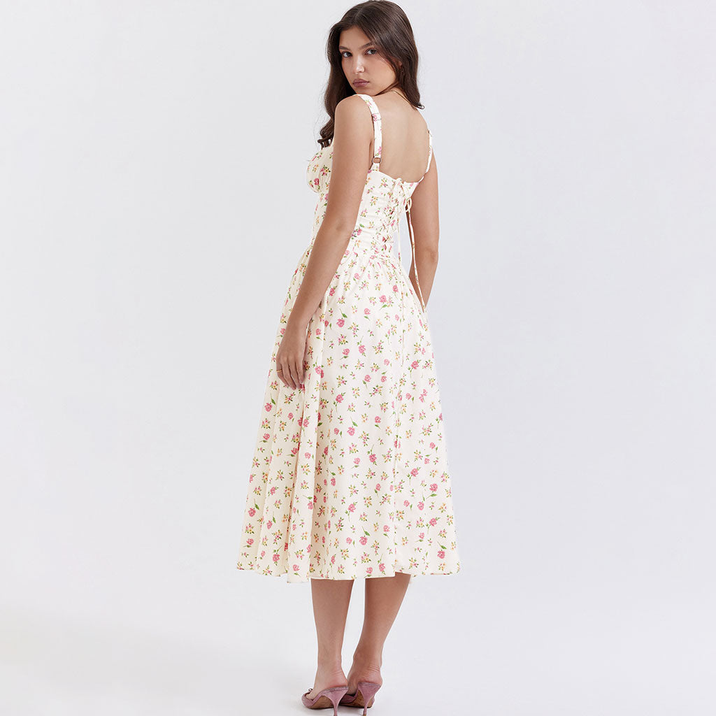 Prairie Style Square Neck Bustier Button Trim Drop Waist Side Pocket Midi SunDress