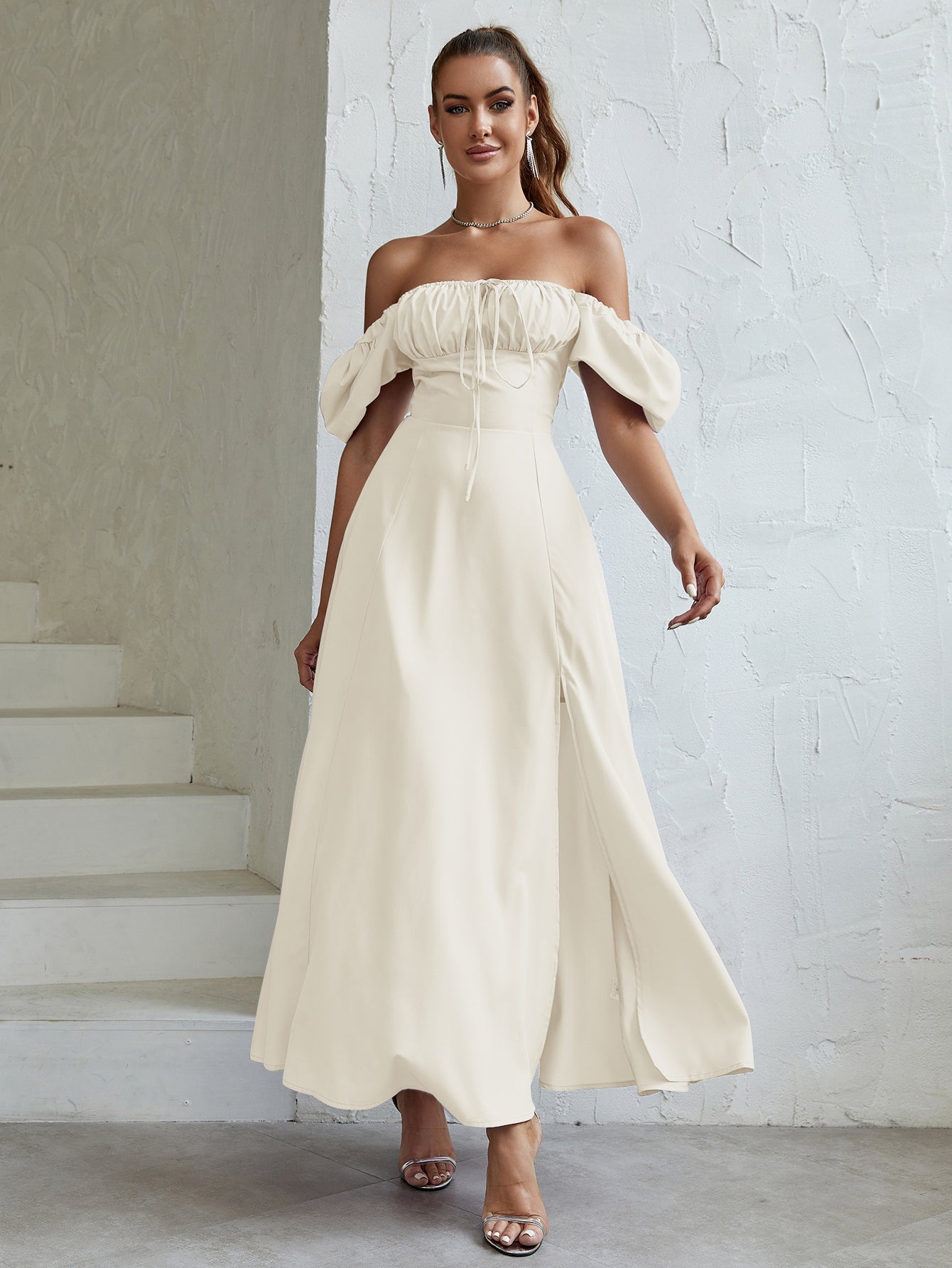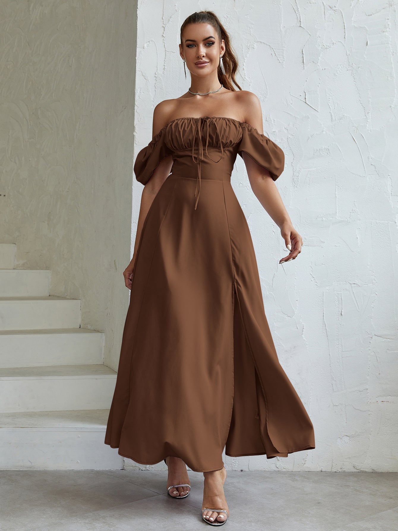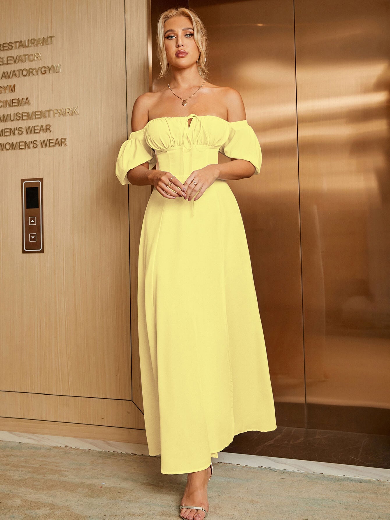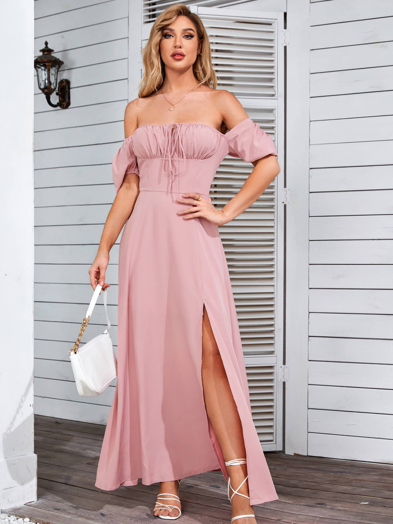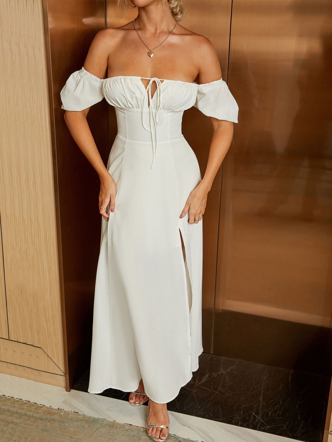 Puff Sleeve Tie Front Off Shoulder Slit Thigh Dress