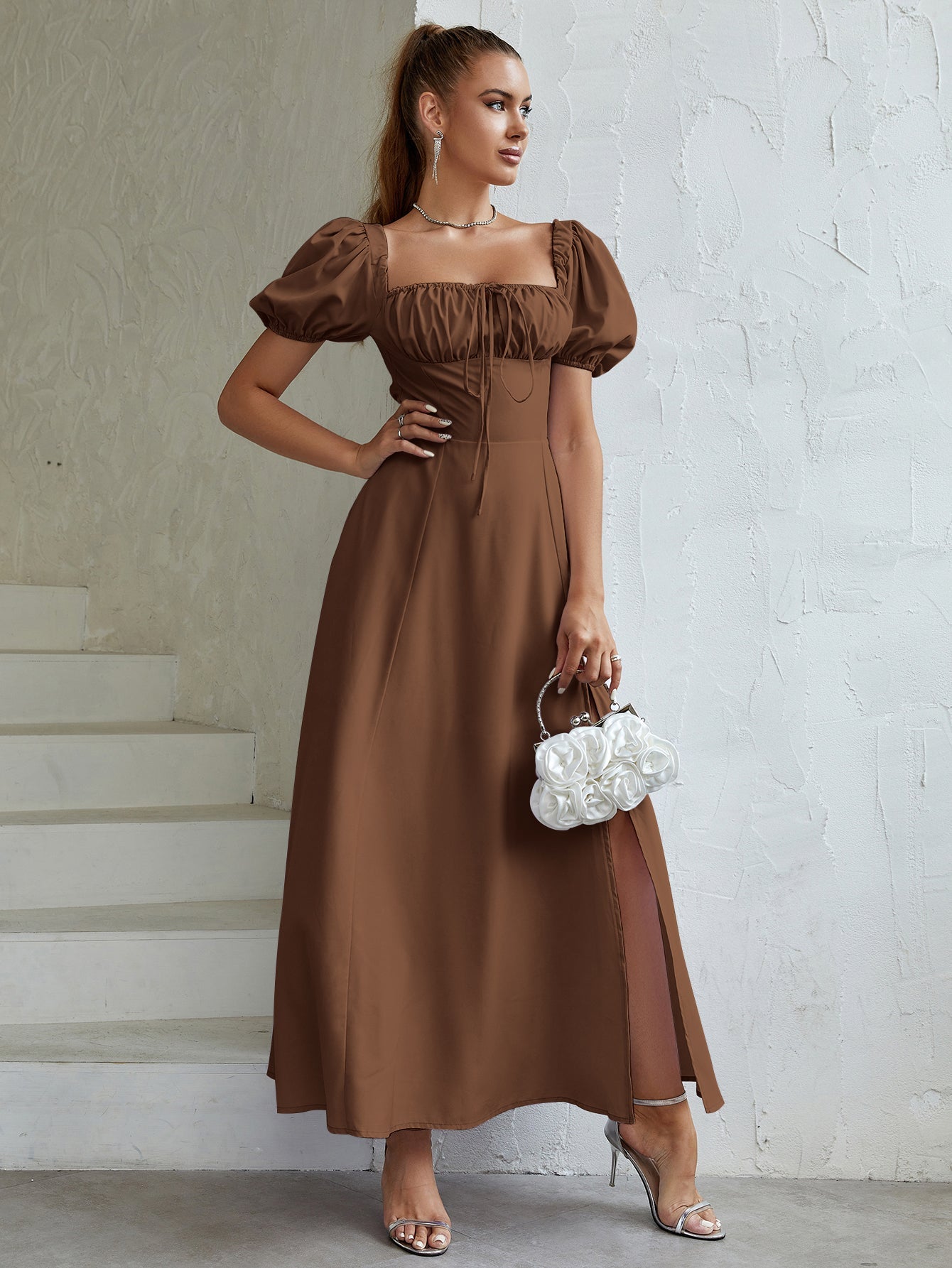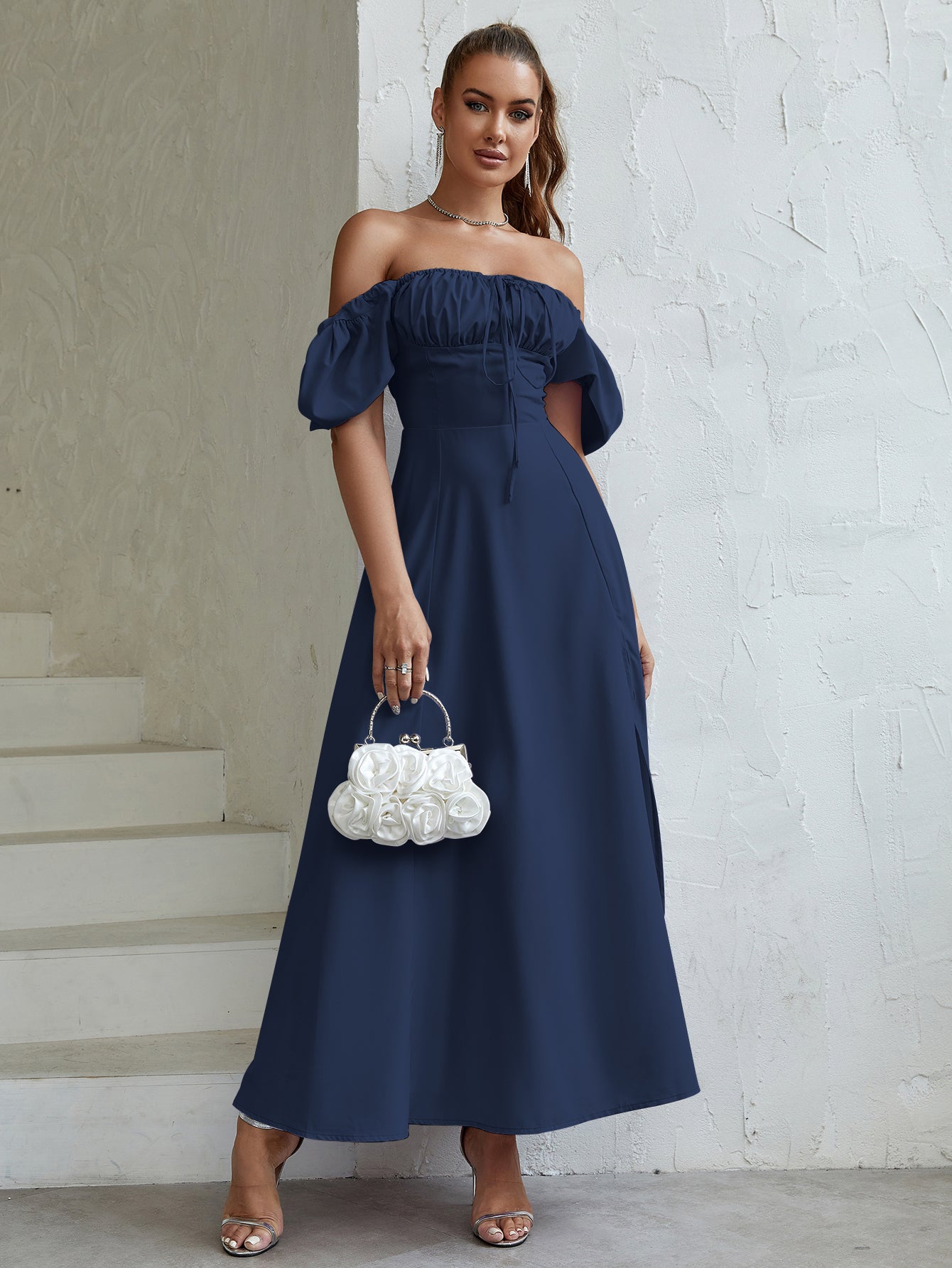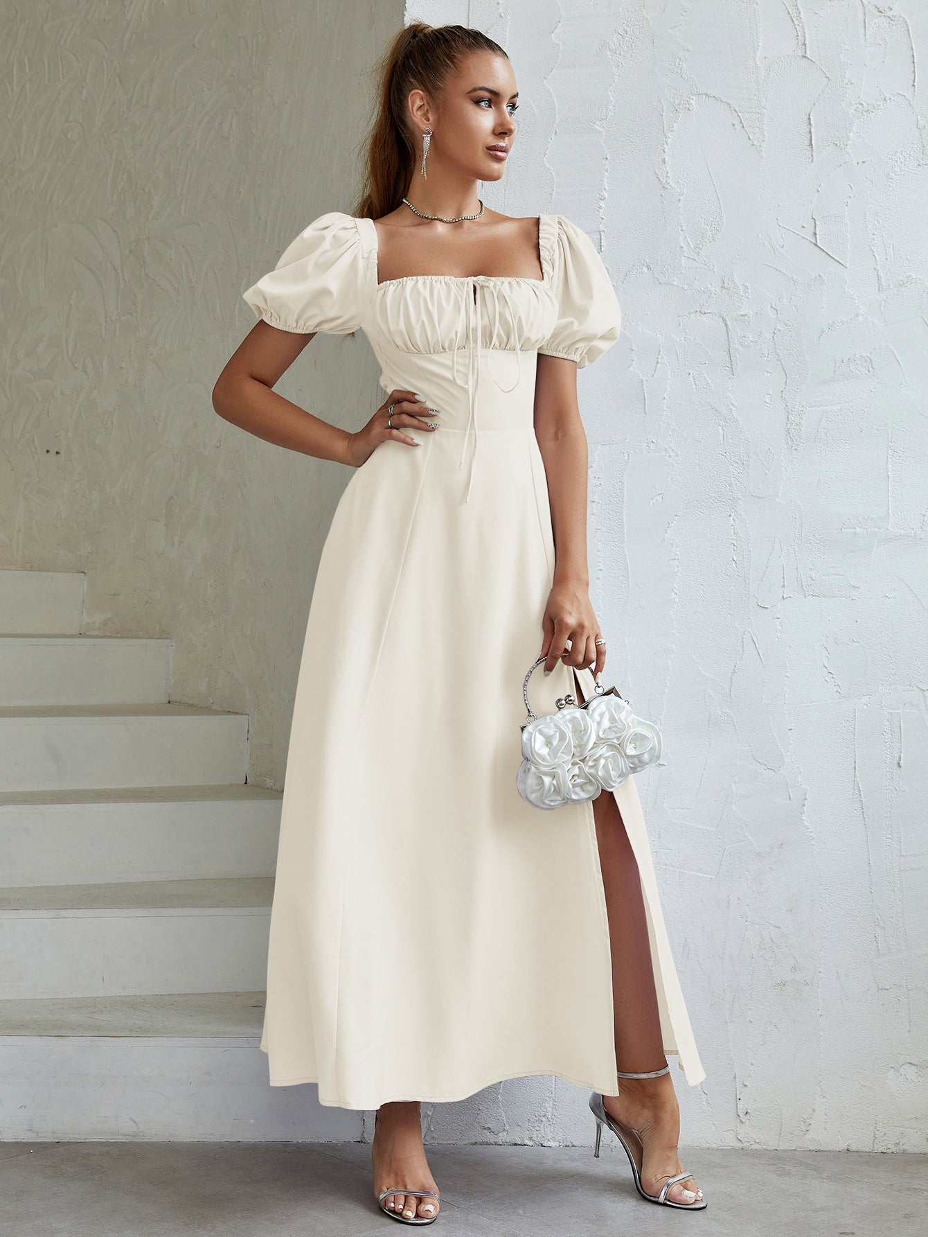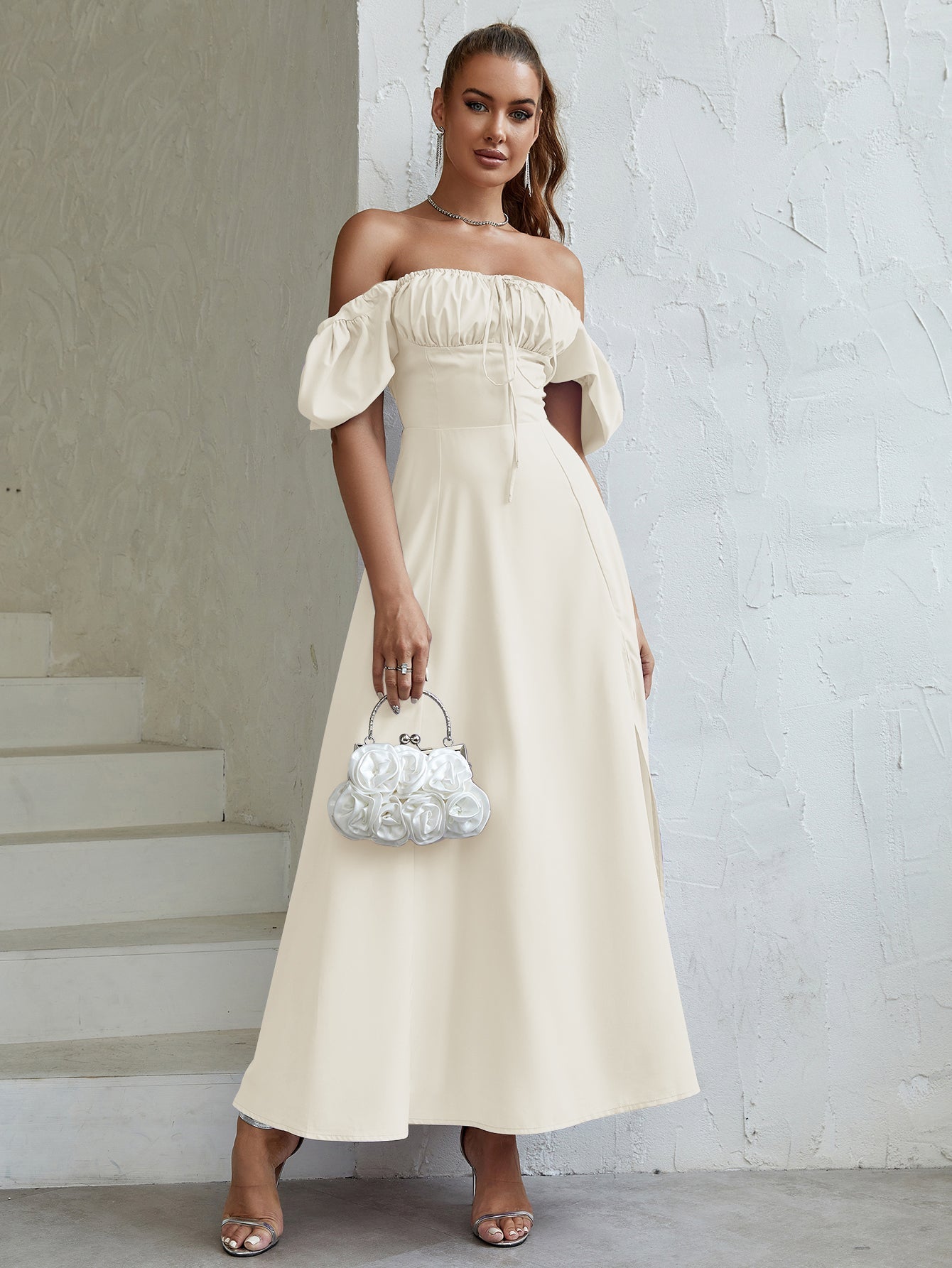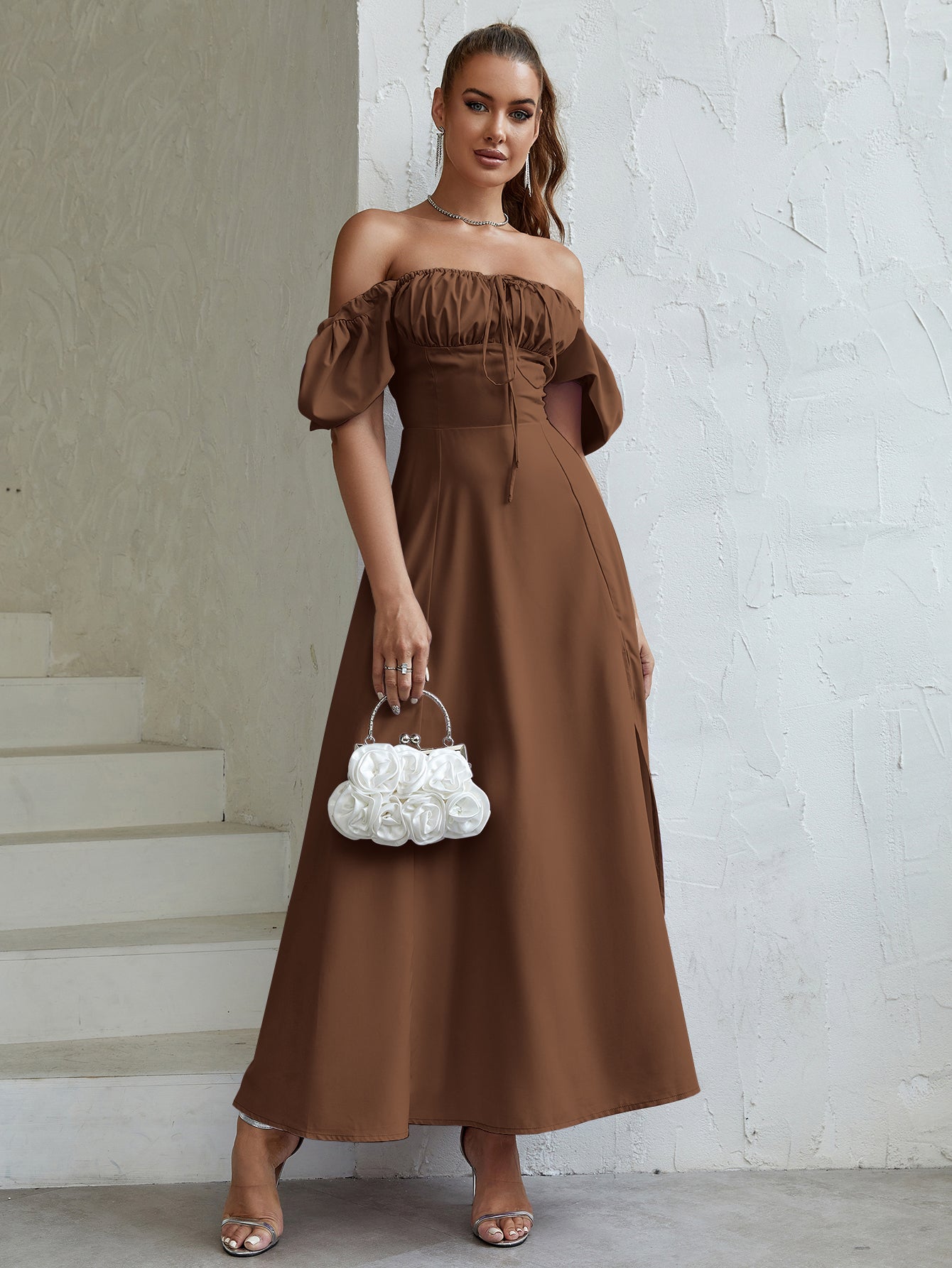Puff Sleeve Tie Front Off Shoulder Slit Thigh Dress
