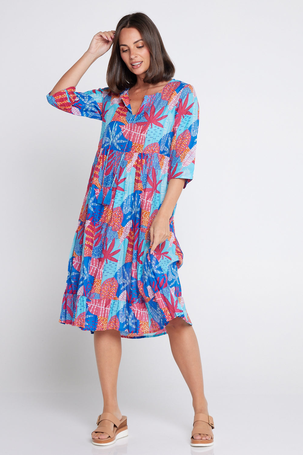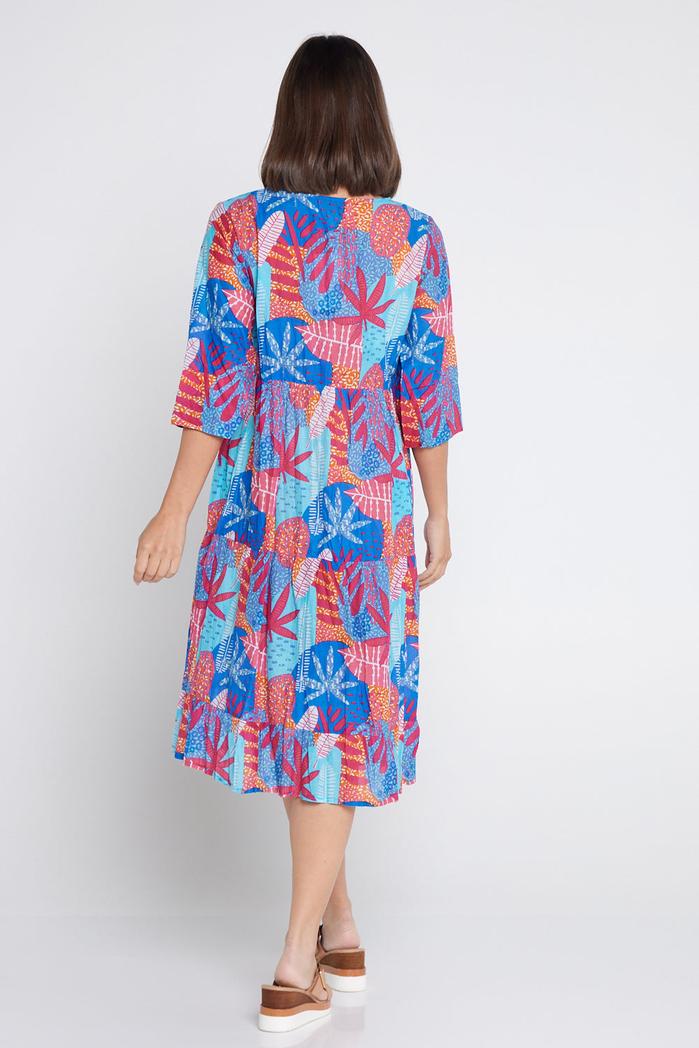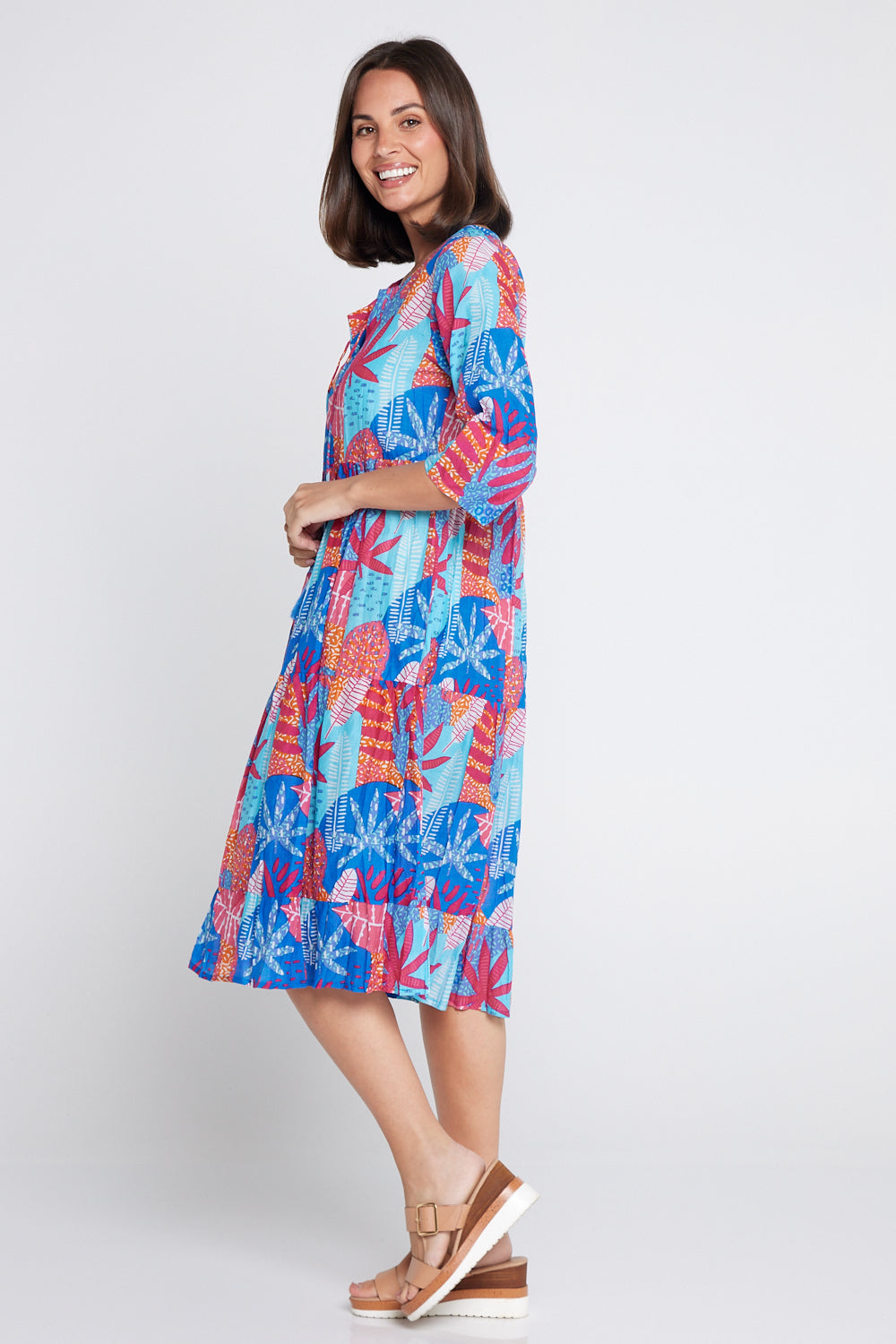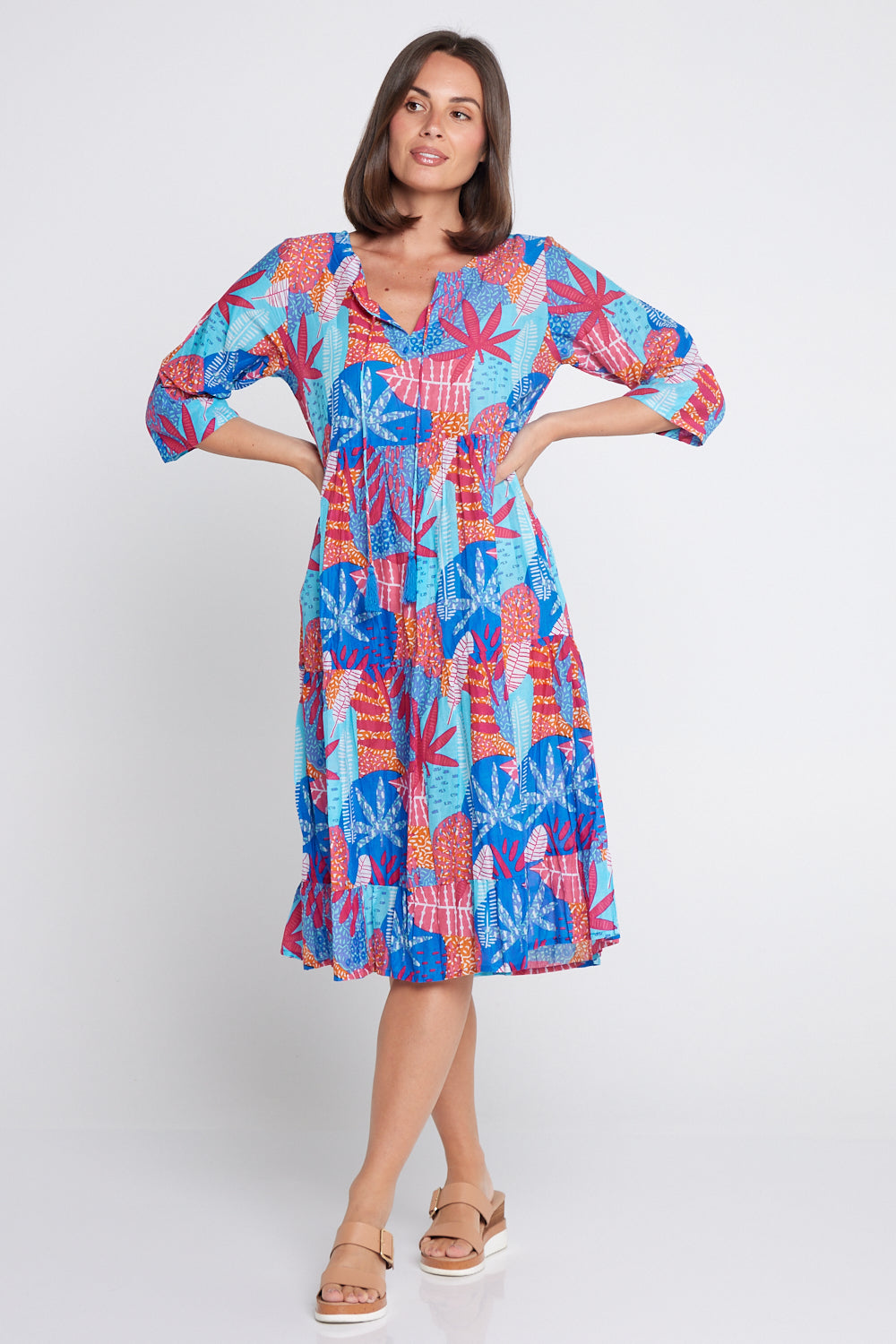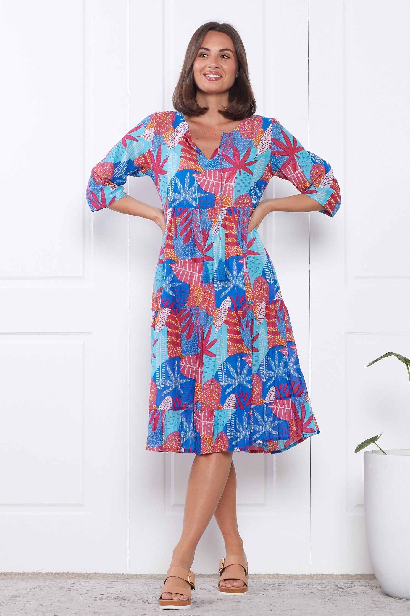 Experience timeless charm with the stunning Rebecca Tie Neck Dress from the One Summer collection by Orientique. Its round neck, complete with a split and tassel ties, exudes a touch of bohemian chic. With three-quarter sleeves and a tiered skirt, it effortlessly blends comfort and style in a knee to midi length. Made from a light and airy, non-stretch pure cotton weave, this dress promises ultimate breathability on hot days. Fall in love with the magic of summer in this enchanting piece, embodying the beauty and grace of the season.