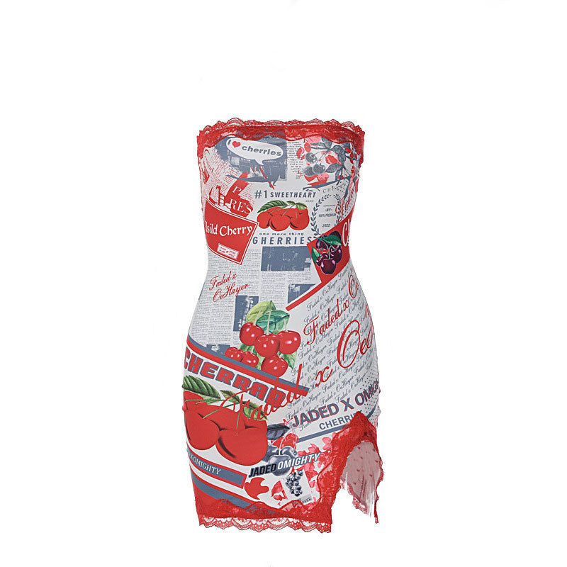 Retro Cherry Print Lace Trim Split Strapless Bodycon Mini Dress - Red