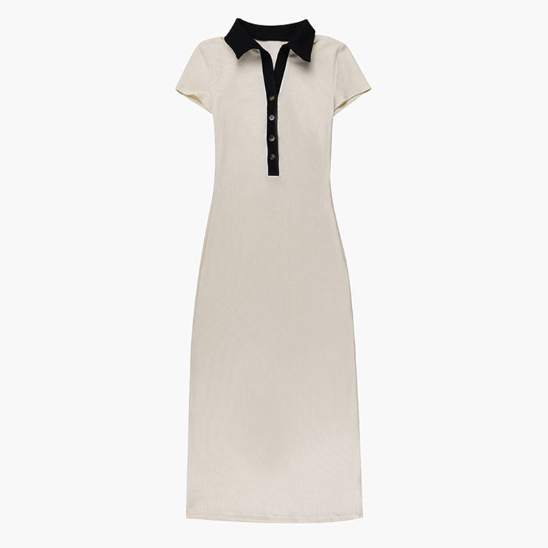 Ribbed Contrast Collar Short Sleeve Button Front Bodycon Maxi Dress - Apricot