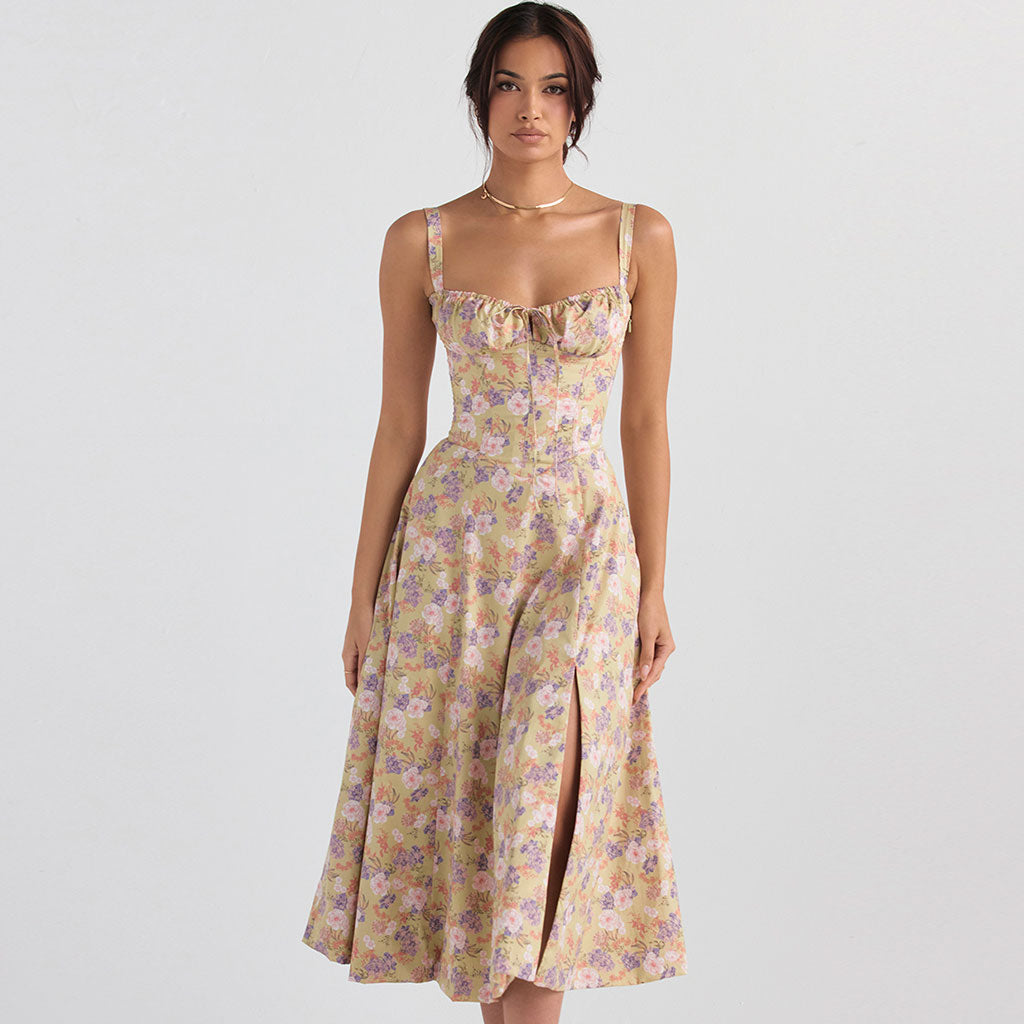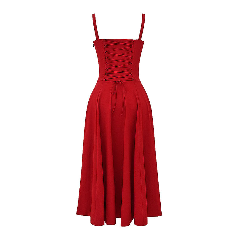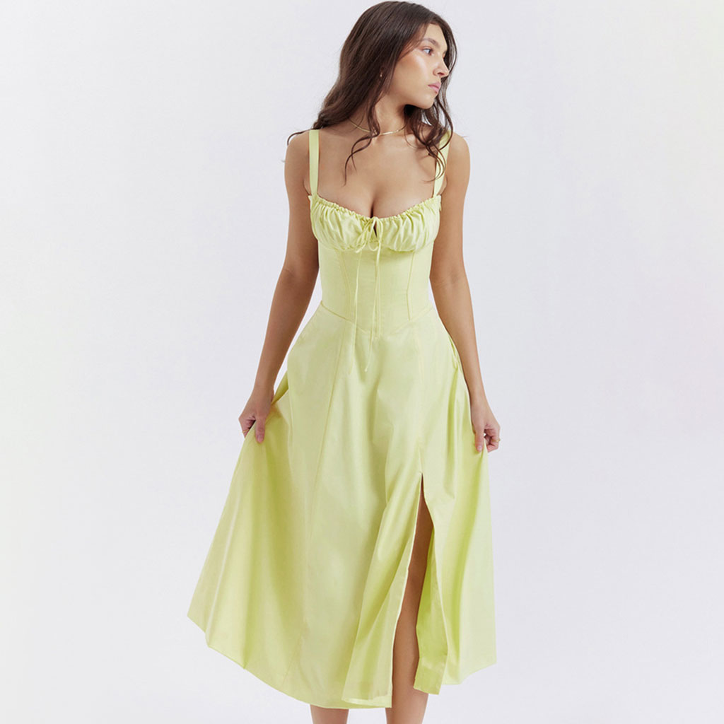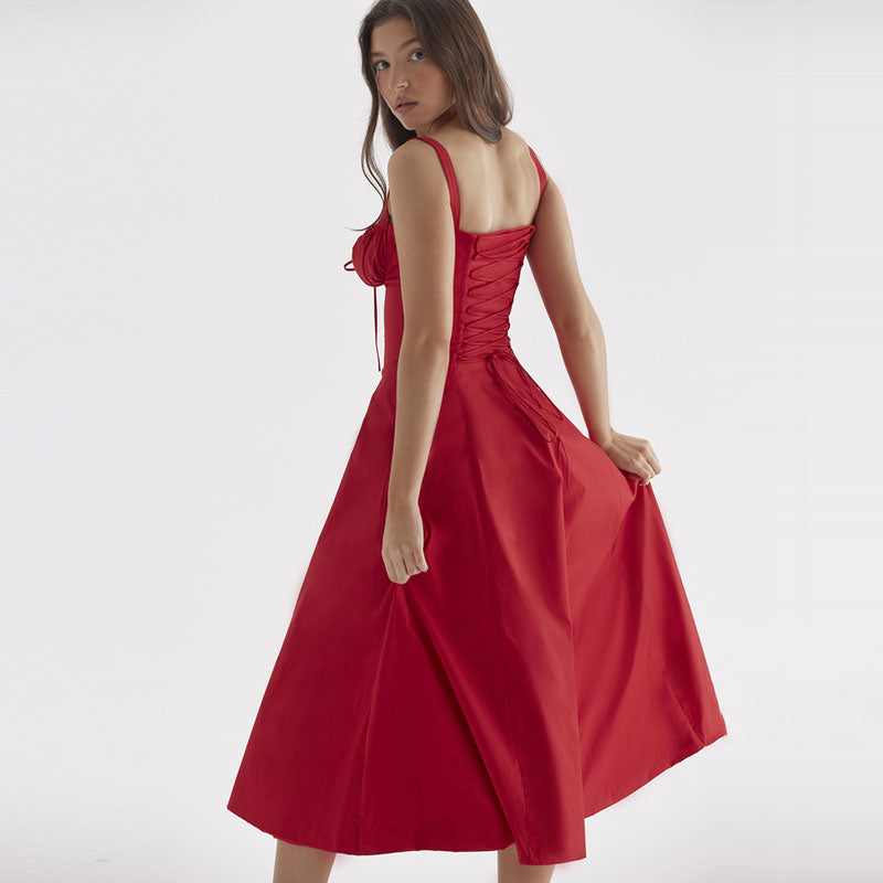 Romantic Tie Front Lace Up Suspender Strap Ruched Bustier Midi SunDress