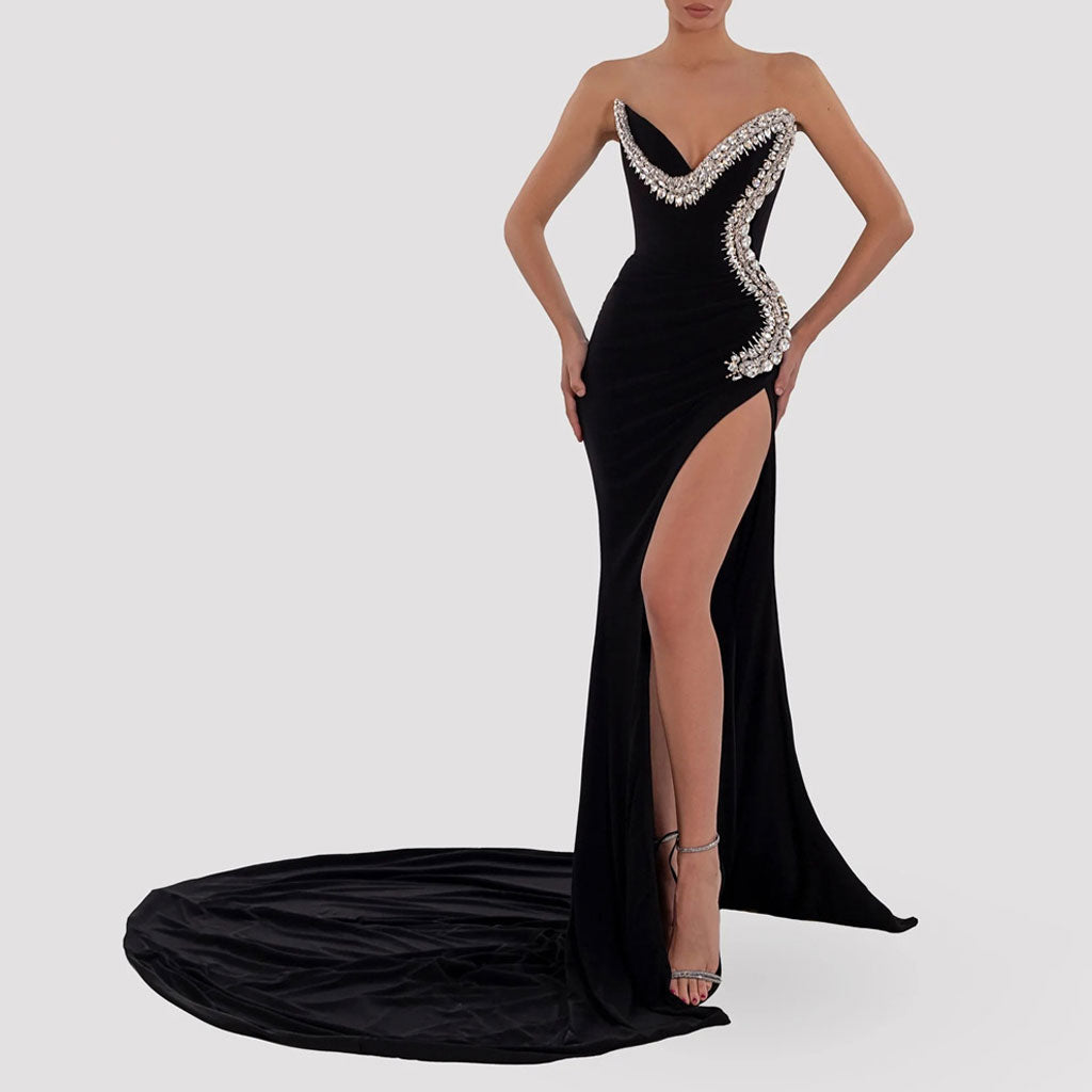 Exude 100% of powerful self-confidence: You deserve it! Elevate your evening attire with our rhinestone embellished gown! This exquisite designer dress exudes sensuality and sophistication. The maxi dress features a deep V neckline that highlights your curves and adds a touch of allure. Adorned with silver-tone crystal trim. it sparkles and catches the light. creating a mesmerizing effect. Strapless and crafted from luxurious velvet fabric. this tube maxi offers a sleek and glamorous look. The thigh high split and floor-length long train add a seductive element. allowing you to confidently show off your legs. Perfect for special occasions and formal events. this formal maxi dress combines elegance and sexiness in a stunning ensemble. Make a memorable entrance and leave a lasting impression with this captivating dress.