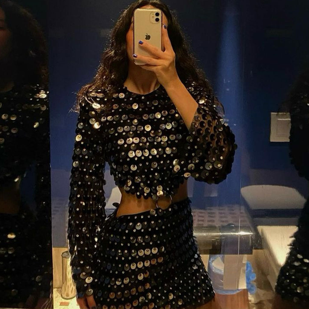 Shimmer Sequin Mesh Embellished O Ring CutOut Bell Sleeve Mini Club Dress