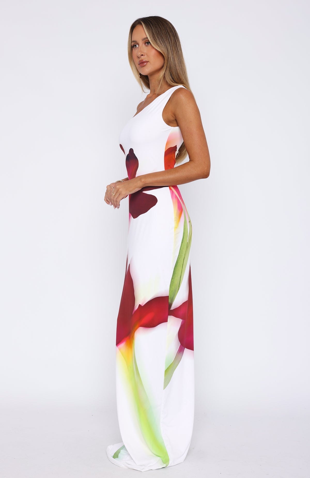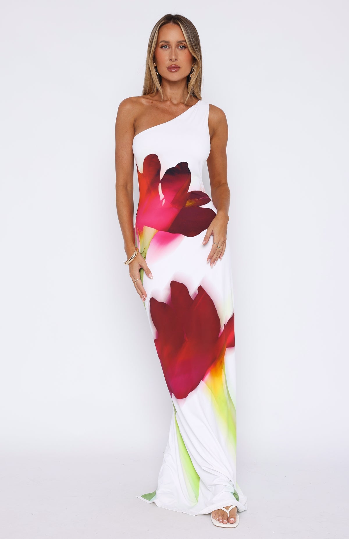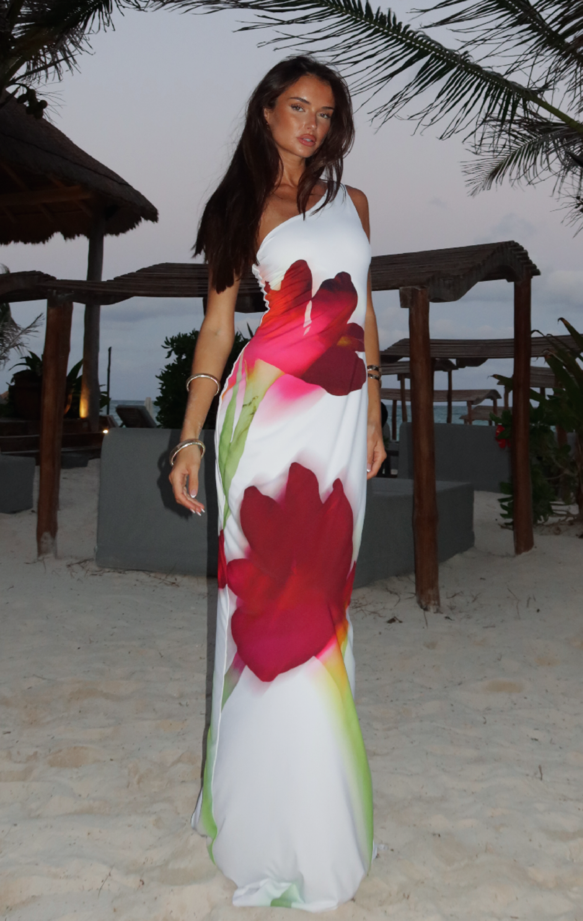 Take resort to a whole new level in the Skyline Maxi Dress Vanilla Blossom. Features a one shoulder design, lined fabric, silky and soft fabric, stretch for an easy slip design, maxi length and gorgeous printed fabric. Pair it with thong kitten heels and gold accessories for a fit' worthy of your next sunset event!
