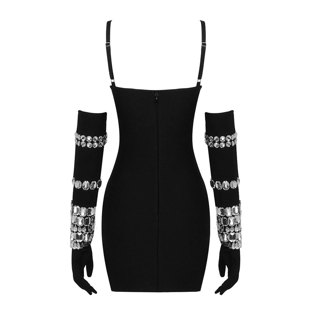 Sparkle now with this designer bandage minidress! This high-end little black dress showcases sparkly big diamante accents on the front. adding a touch of opulence and luxury. The fitted shape accentuates your curves. while the adjustable spaghetti shoulder straps ensure a perfect fit. The daring sweetheart neckline exudes femininity. and the thigh-high hemline adds a hint of allure. Complete the ensemble with crystal-trimmed gloves. adding a touch of sophistication and glamour. Step into the limelight with this sexy bandage minidress. accompanied by the perfect accessory - opera gloves.
