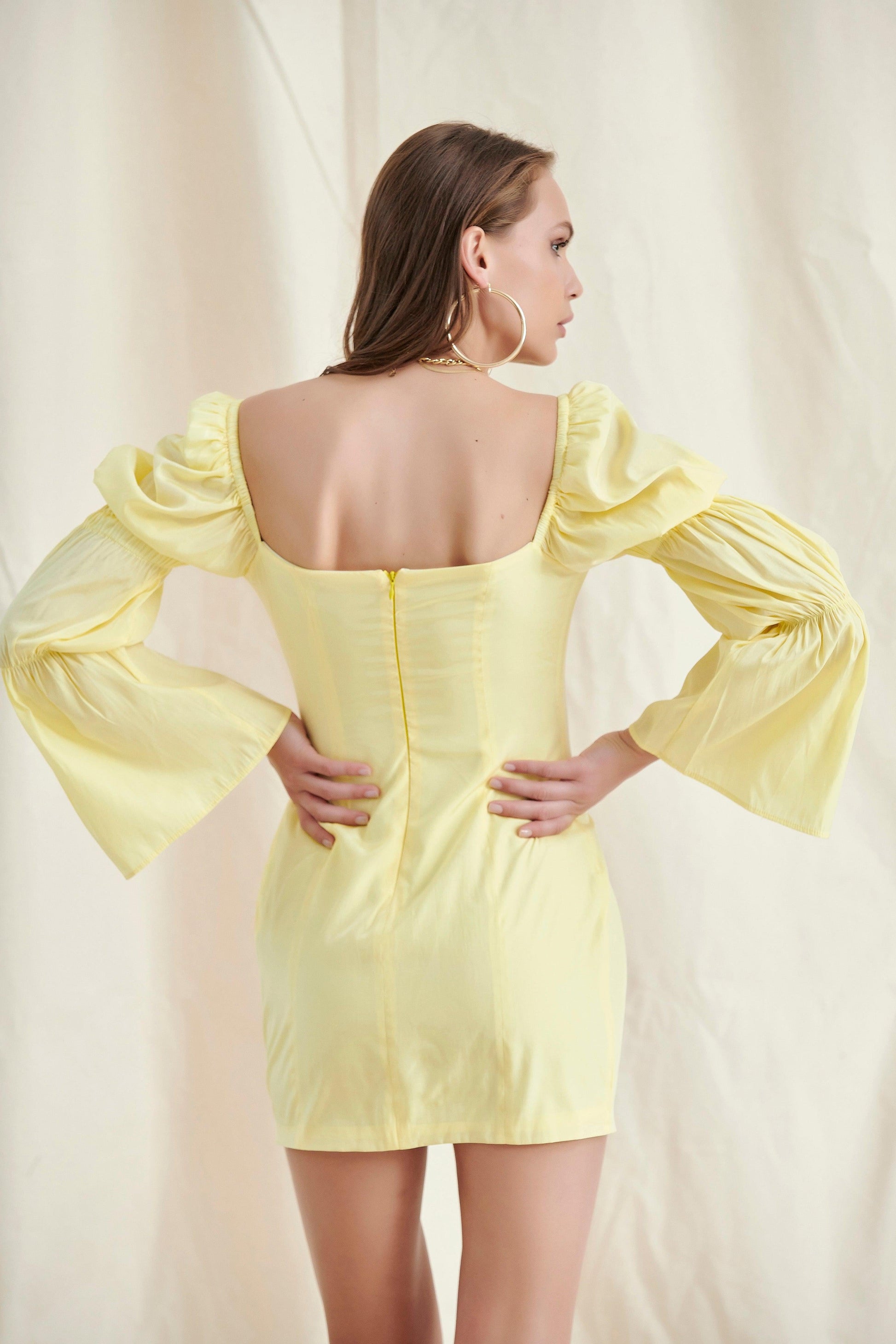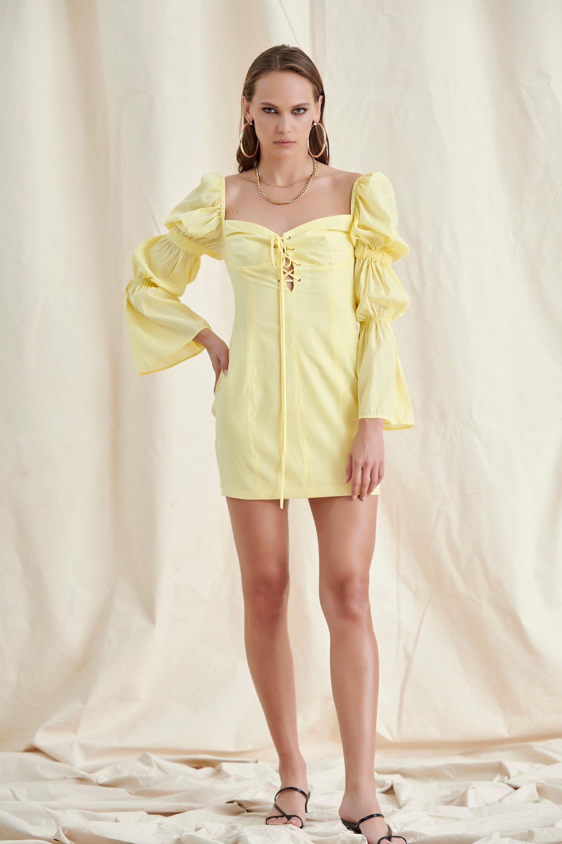 Yellow Lace UP Puff Sleeve Mini Dress