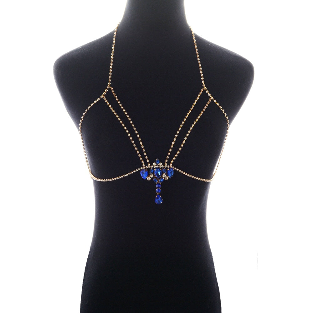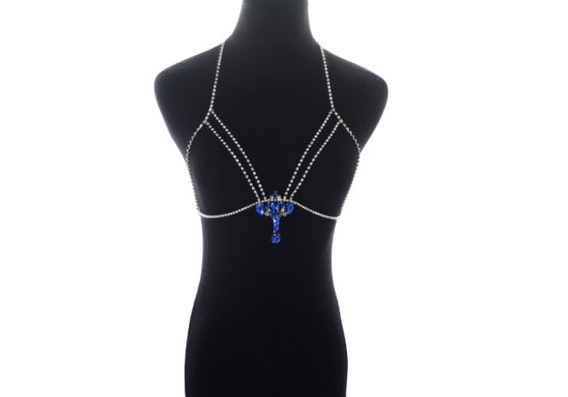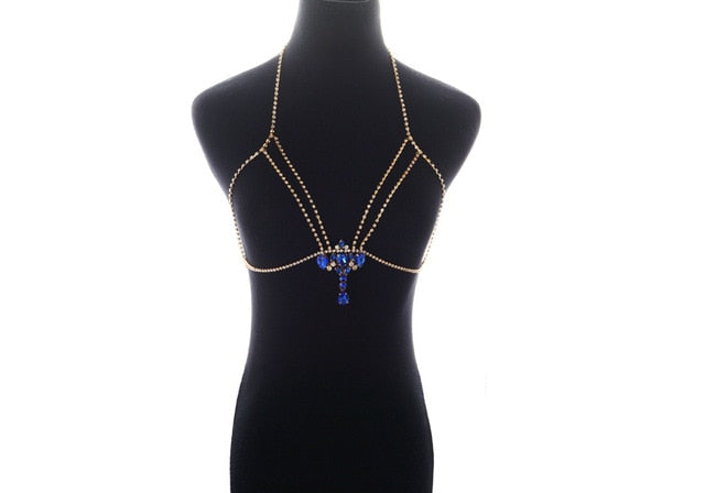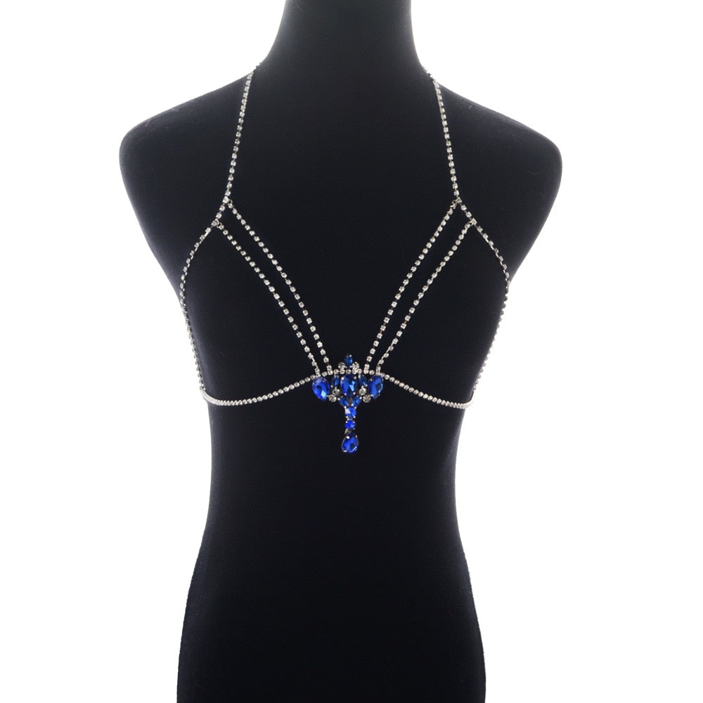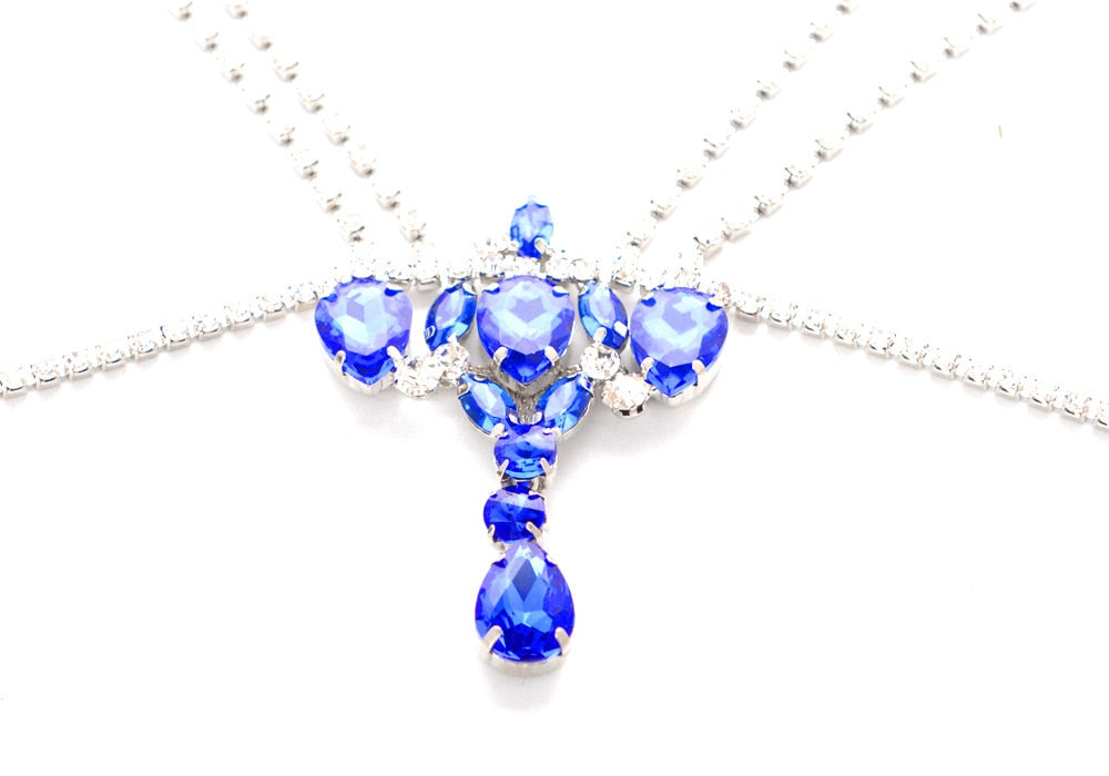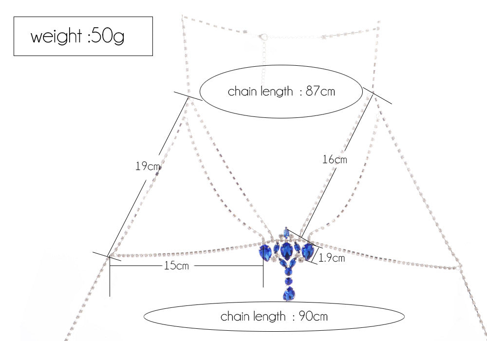 No matter the occasion, there is always a reason to wear this sexy and chic piece of jewelry. A delicate and eye-catching chain-style body jewelry. This piece is made of high-quality copper and adorned with royal blue rhinestones.