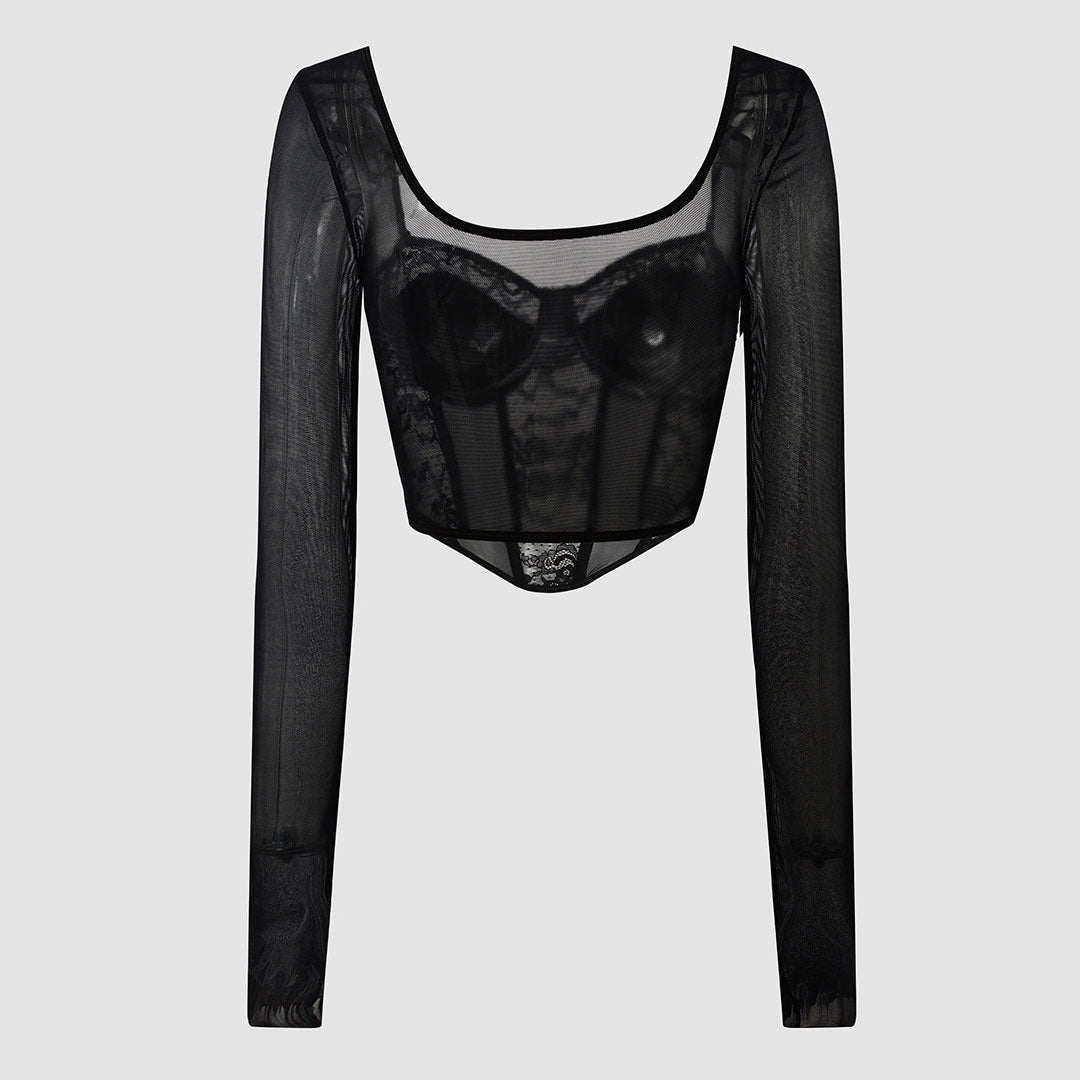 Sweetheart Long Sleeve Floral Lace Sheer Mesh Corset - Black