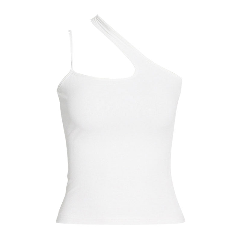 A not so basic. basic! This designer tank is ribbed with stretch knit fabric for a fitted comfortable feel. Made in the classic black and white shades. the cropped top shapes with a one-shoulder neckline that's supported by a wide strap and a slender strap. It's perfect to be worn on its own or layered under outerwear. Style with your favorite denim jeans or shorts for a unique chic look.