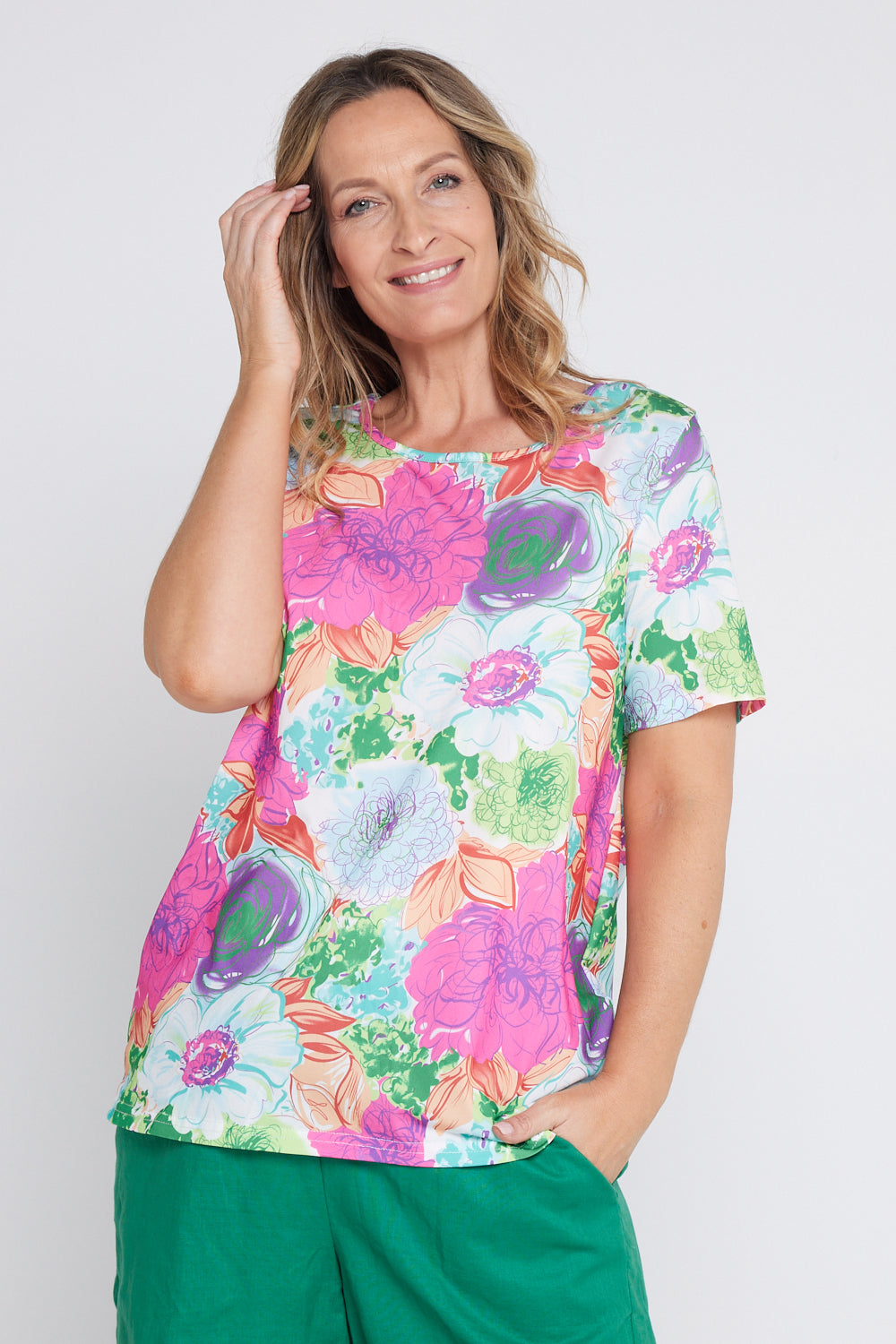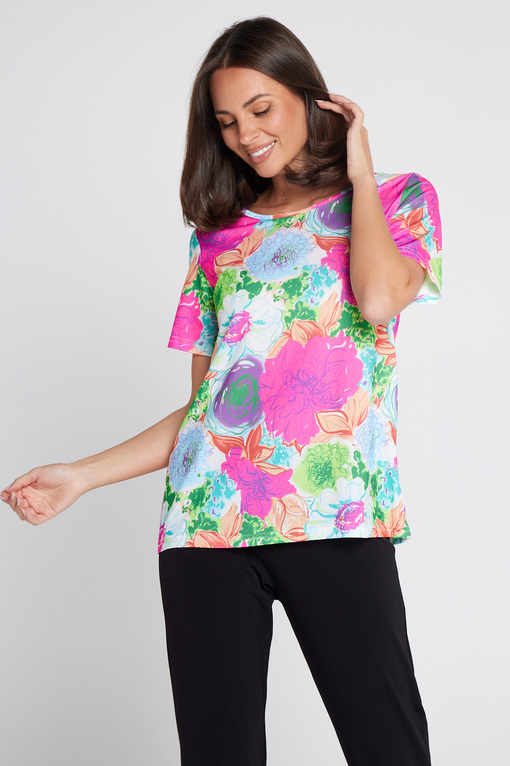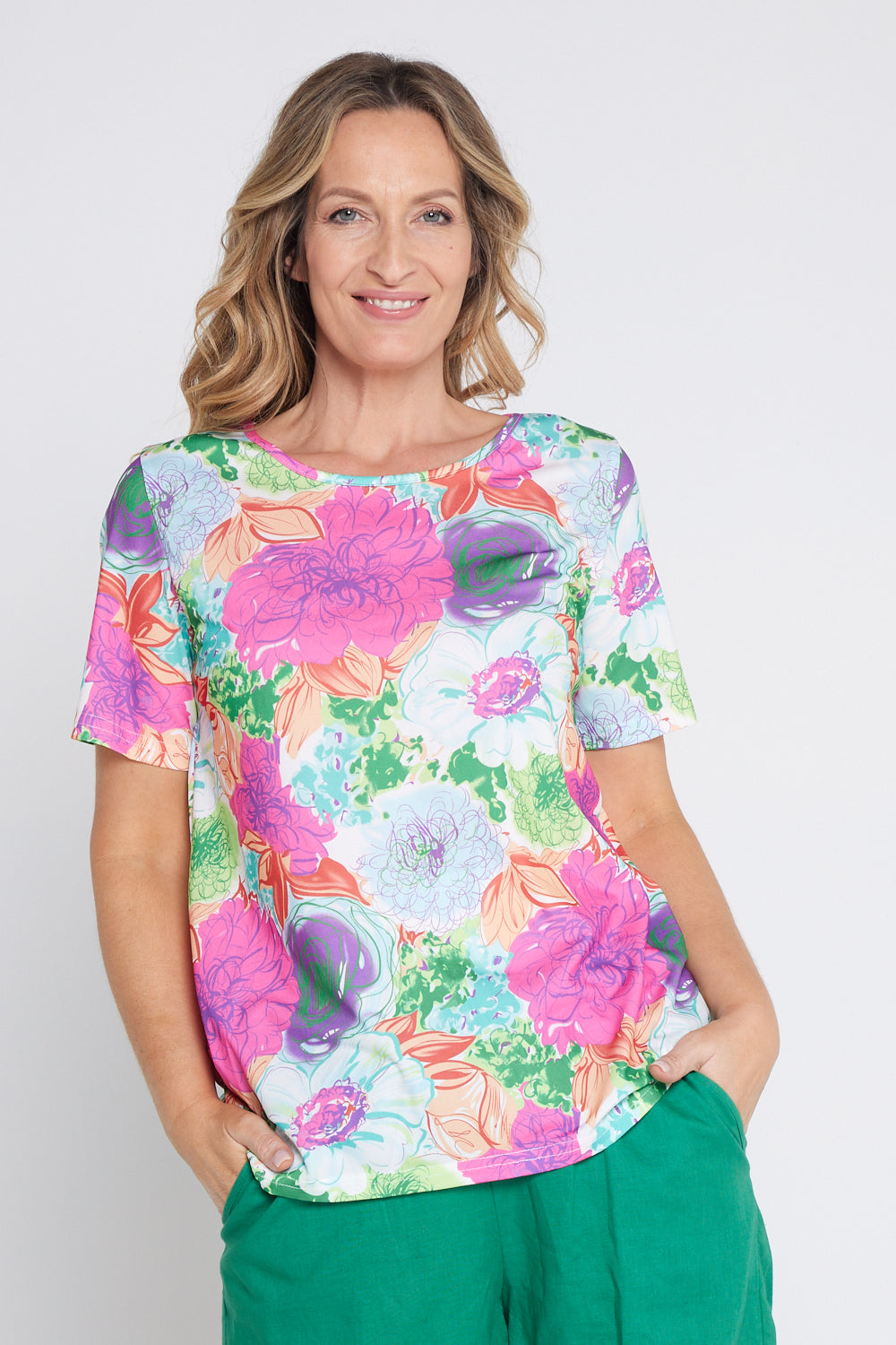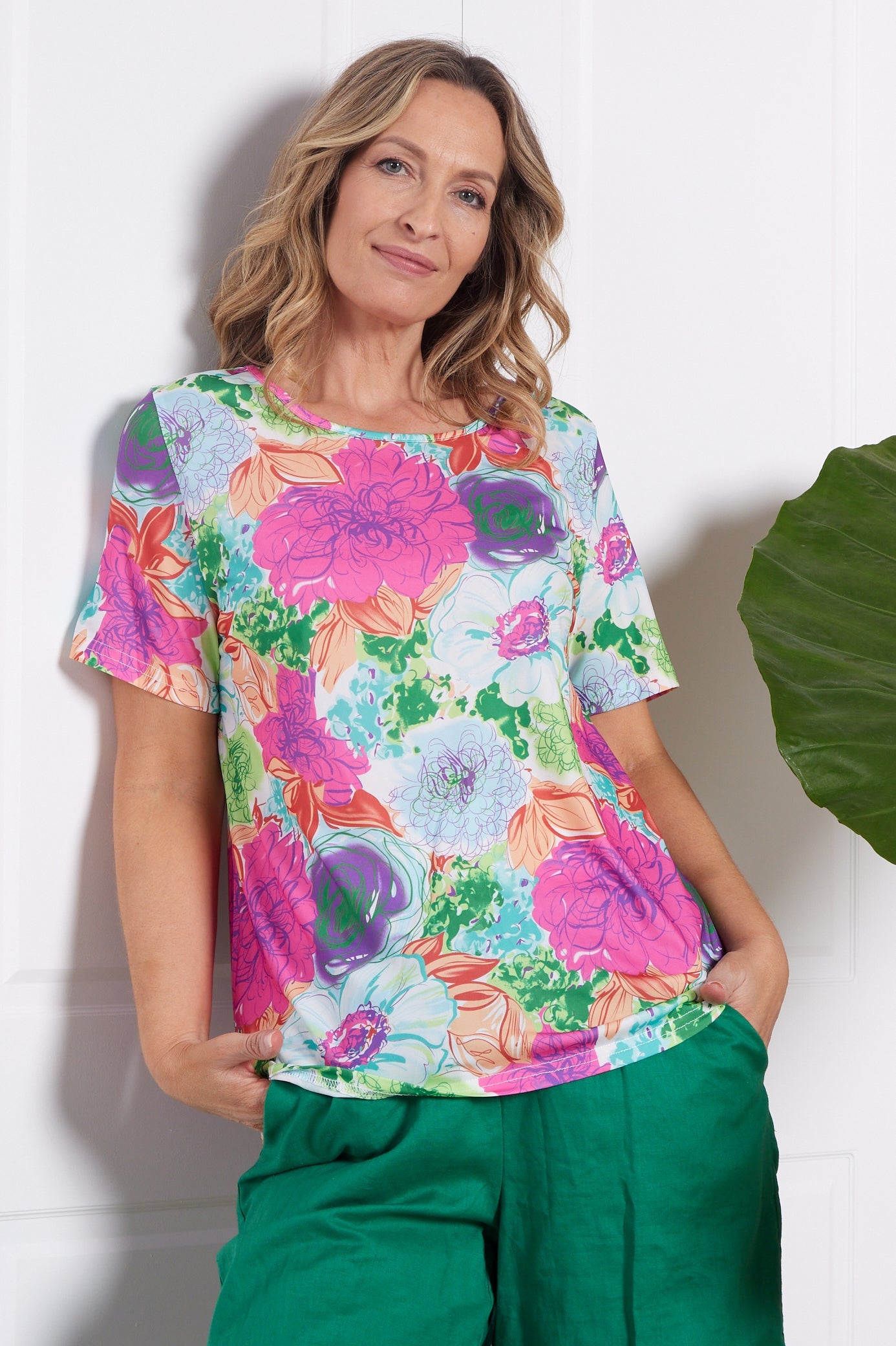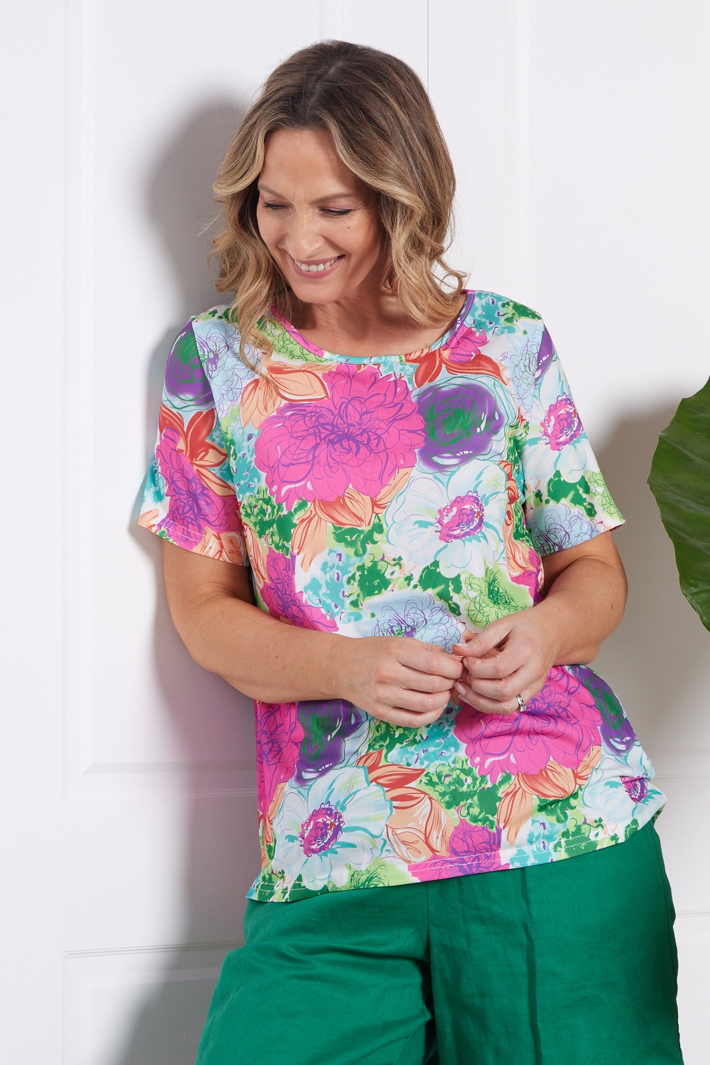 Indulge in the vibrant allure of the Avalon Aubrey Top in Spring Bouquet. The stunning floral print features large blossoming flowers in bright shades of orange, pink and purple, complimented by verdant greens and crisp white. The scoop neck, extended short sleeves, and small side splits offer a chic silhouette. Crafted from a luxurious and wrinkle-resistant polyester-cotton blend, this exclusive piece ensures an easy fit with a smooth, almost silky texture. Embrace the trend effortlessly, as this distinctive top is available only at TULIO.