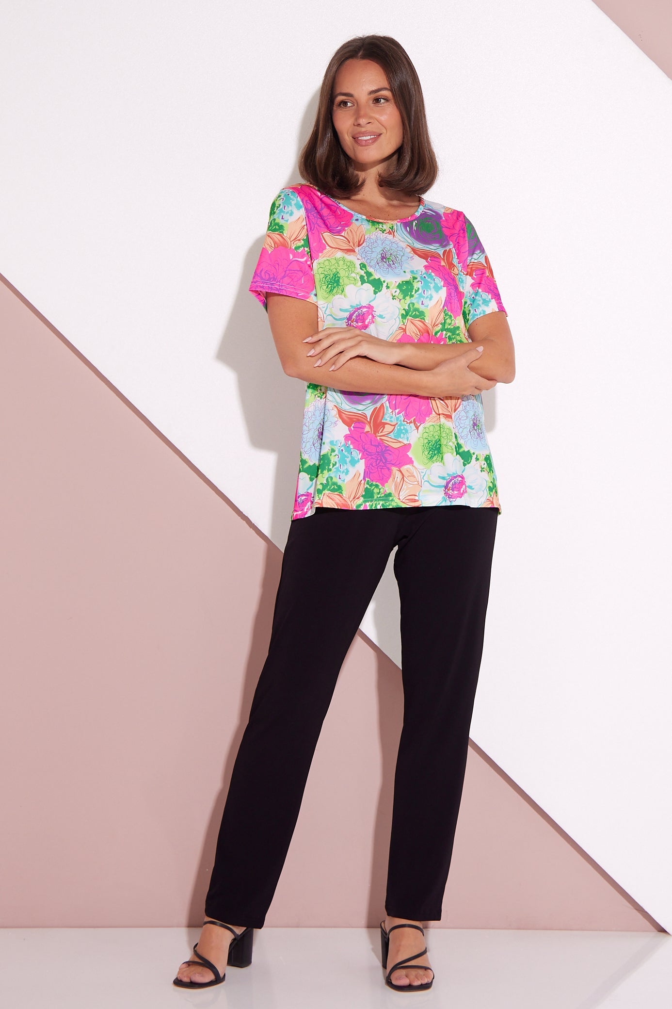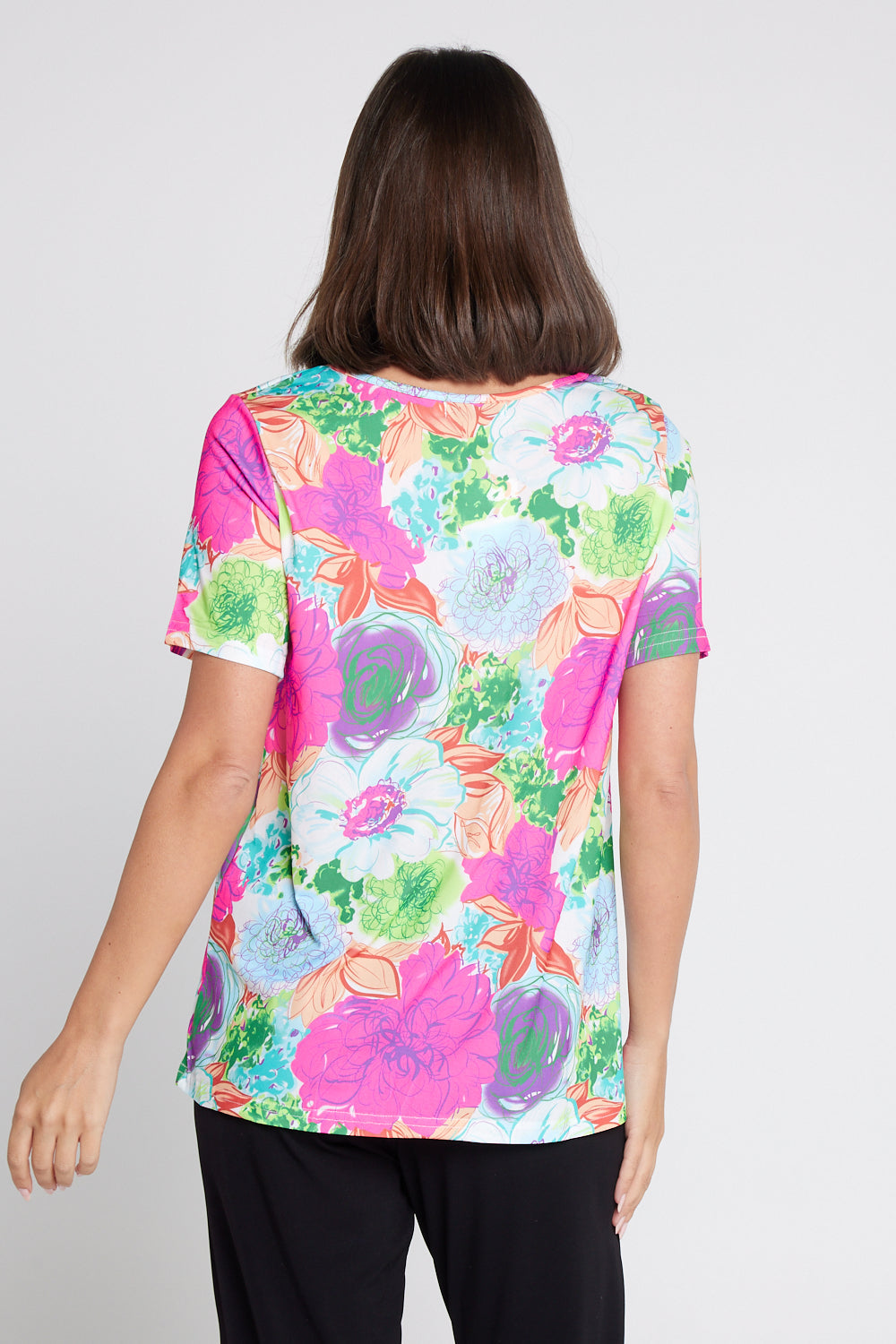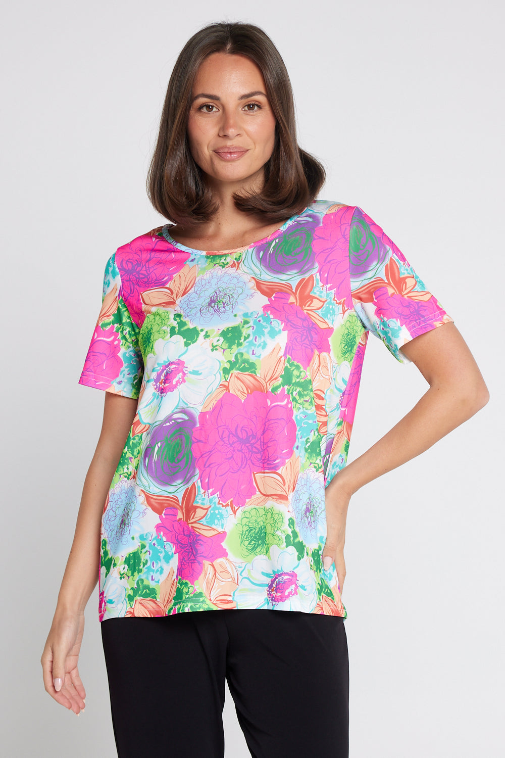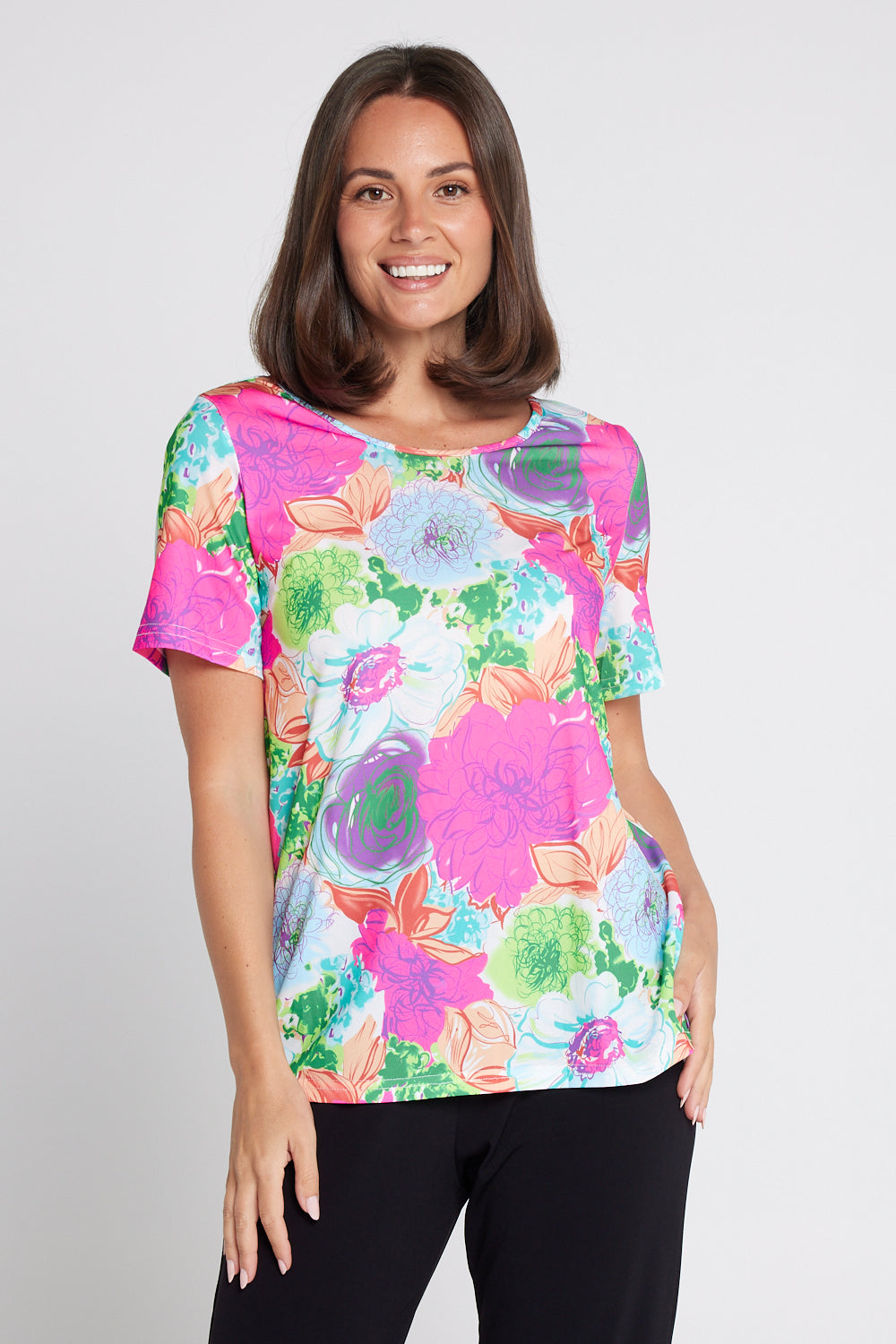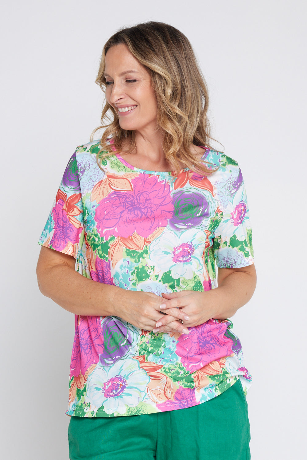Indulge in the vibrant allure of the Avalon Aubrey Top in Spring Bouquet. The stunning floral print features large blossoming flowers in bright shades of orange, pink and purple, complimented by verdant greens and crisp white. The scoop neck, extended short sleeves, and small side splits offer a chic silhouette. Crafted from a luxurious and wrinkle-resistant polyester-cotton blend, this exclusive piece ensures an easy fit with a smooth, almost silky texture. Embrace the trend effortlessly, as this distinctive top is available only at TULIO.