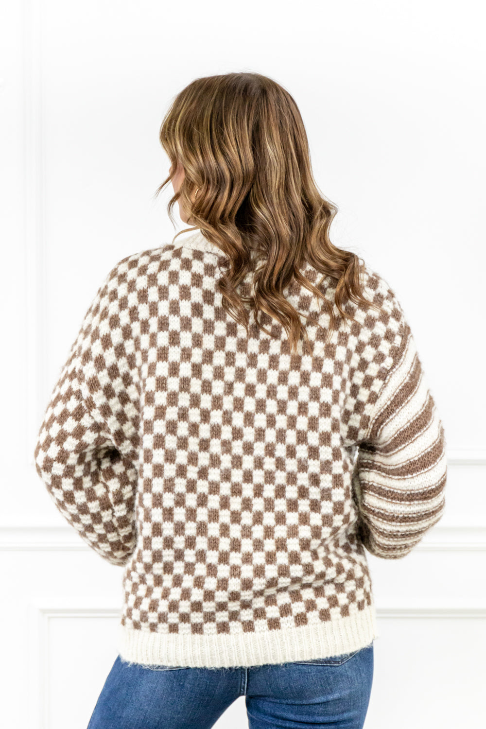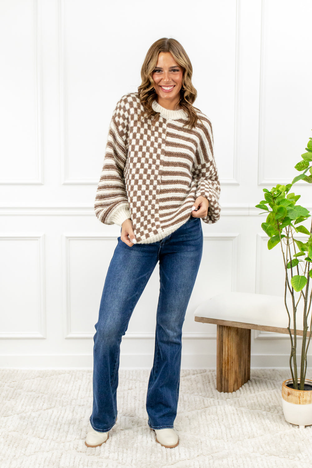 The Autumn Embrace Sweater brings a playful twist to your warm weather wardrobe with its unique blend of checkered and stripe patterns. The cozy, long-sleeve design and ribbed hem offer just the right amount of warmth and structure. Pair it with your favorite jeans or layer it over a collared shirt for an effortlessly stylish look.