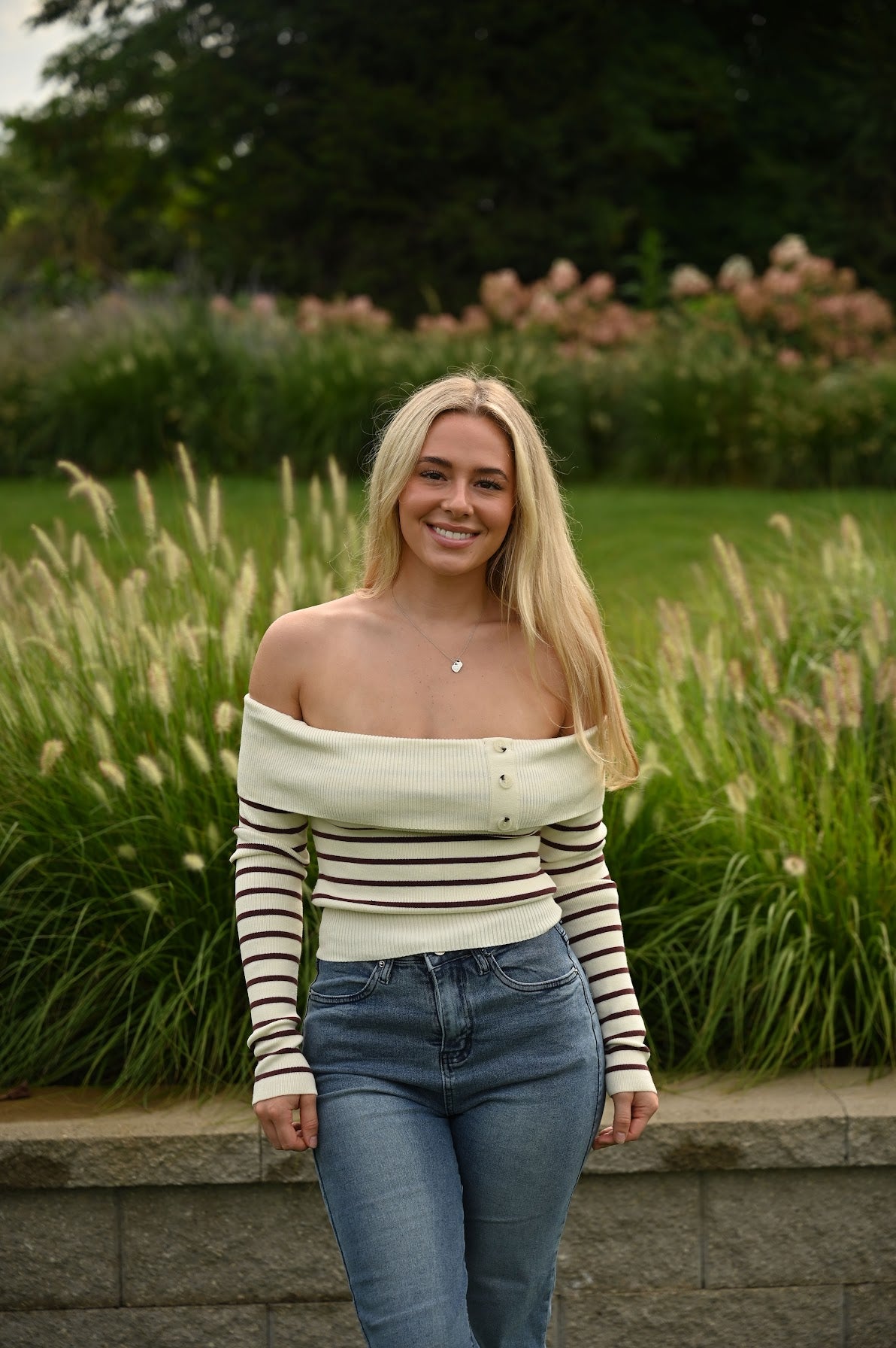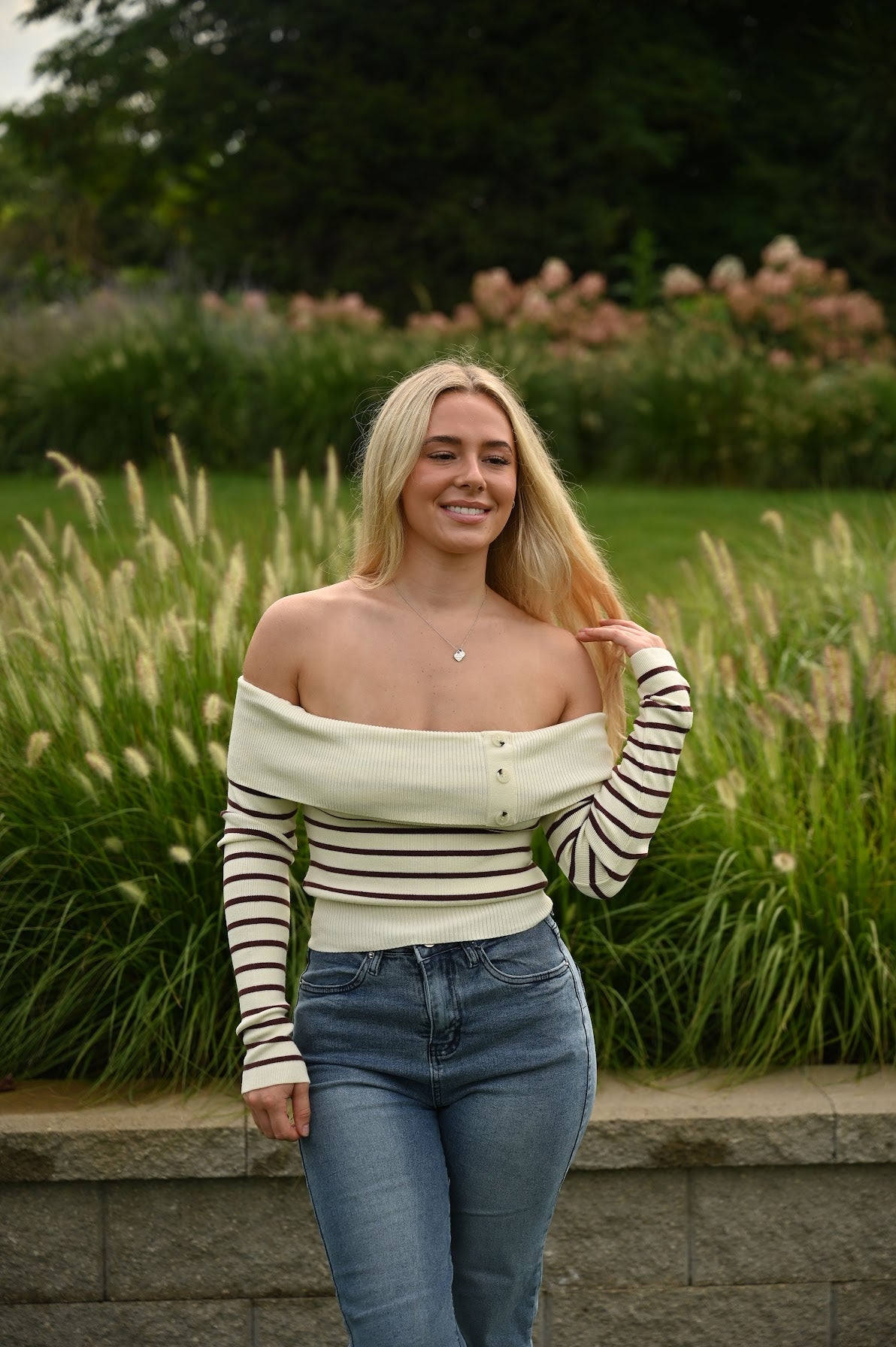 Bring a flirty twist to your cozy days with the Side Glance Sweater. Featuring playful off-the-shoulder stripes, this sweater lets you show just a hint of skin while keeping warm. Its soft knit and relaxed fit make it perfect for layering or wearing solo on casual outings. Effortlessly chic and comfy, it’s your new go-to for turning heads with a subtle, stylish flair.