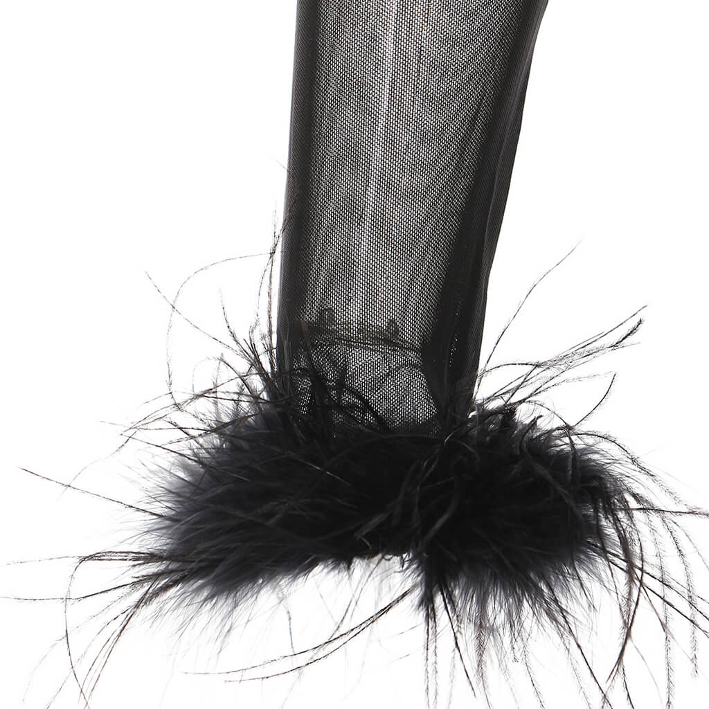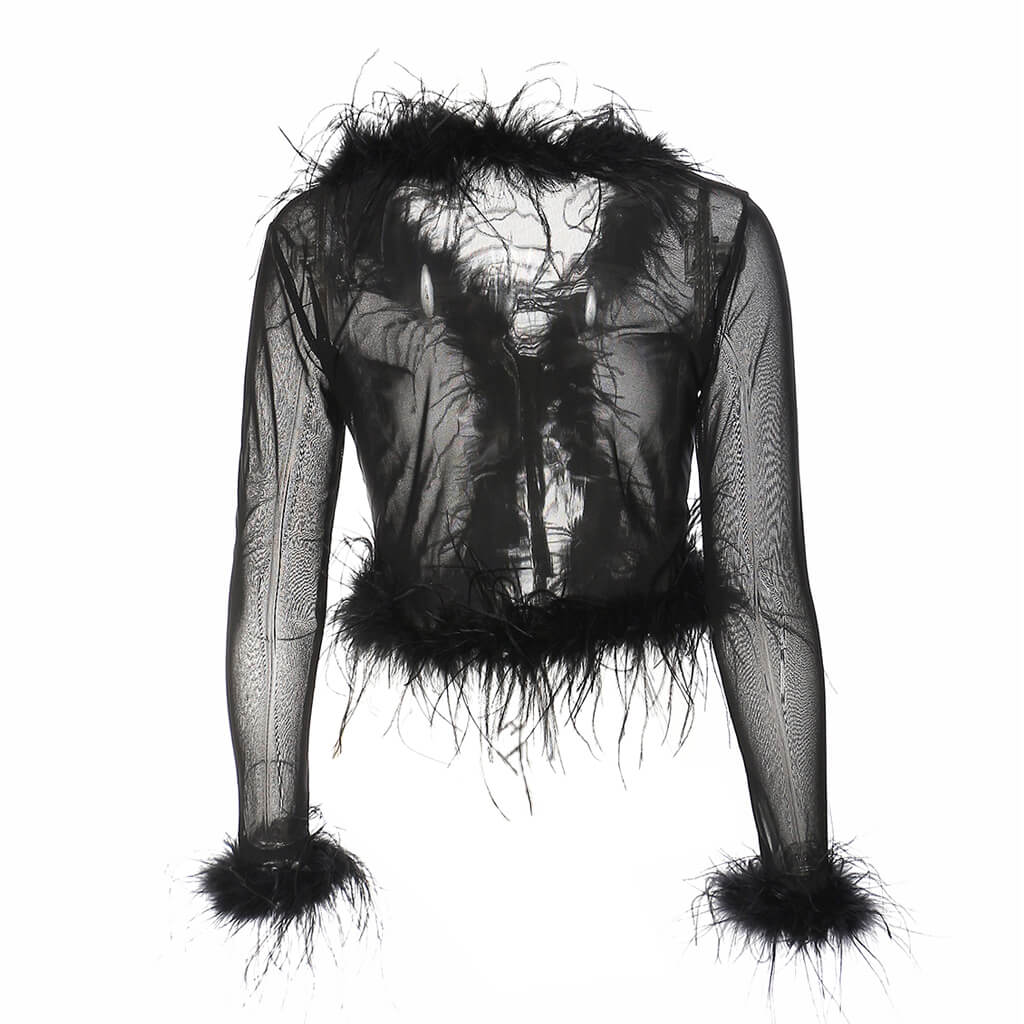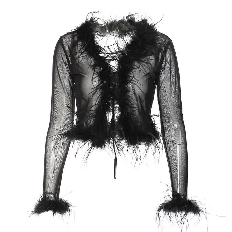Sexy Faux Feather Trim Long Sleeve Tie Front Cropped Mesh Cardigan