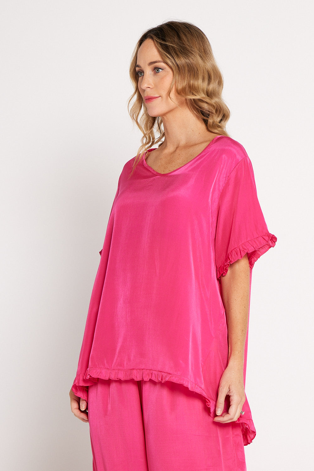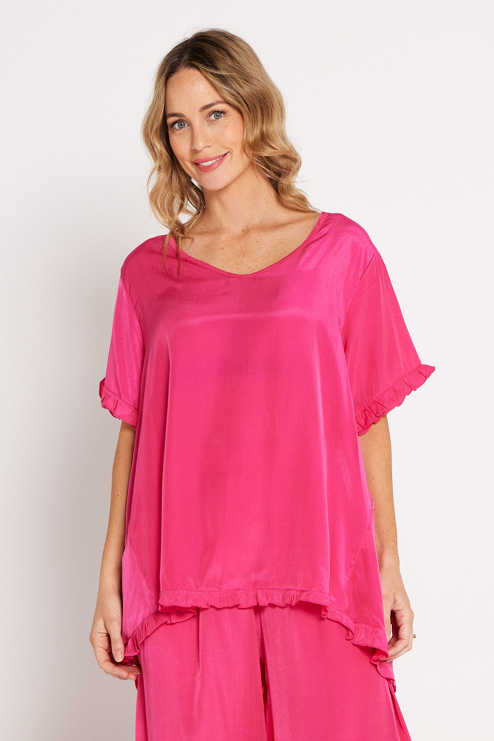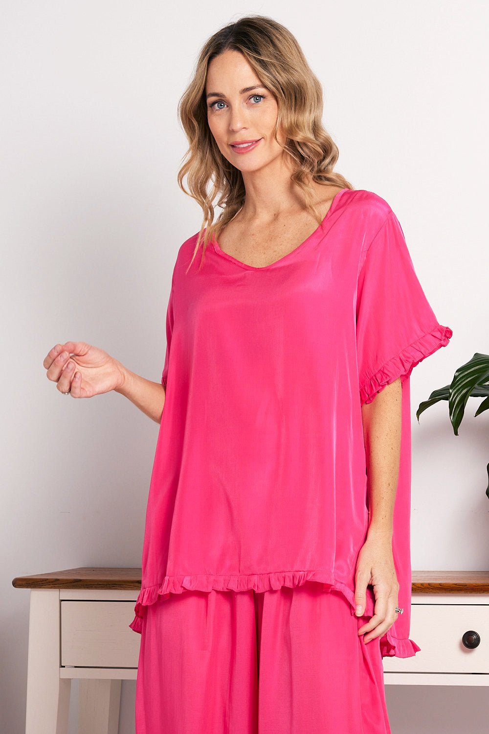 This silhouette is always a popular one, and Cotton Village has just created their own take on it. In a silky hot pink, we love this one paired with the matching pants for a statement special occasion look.