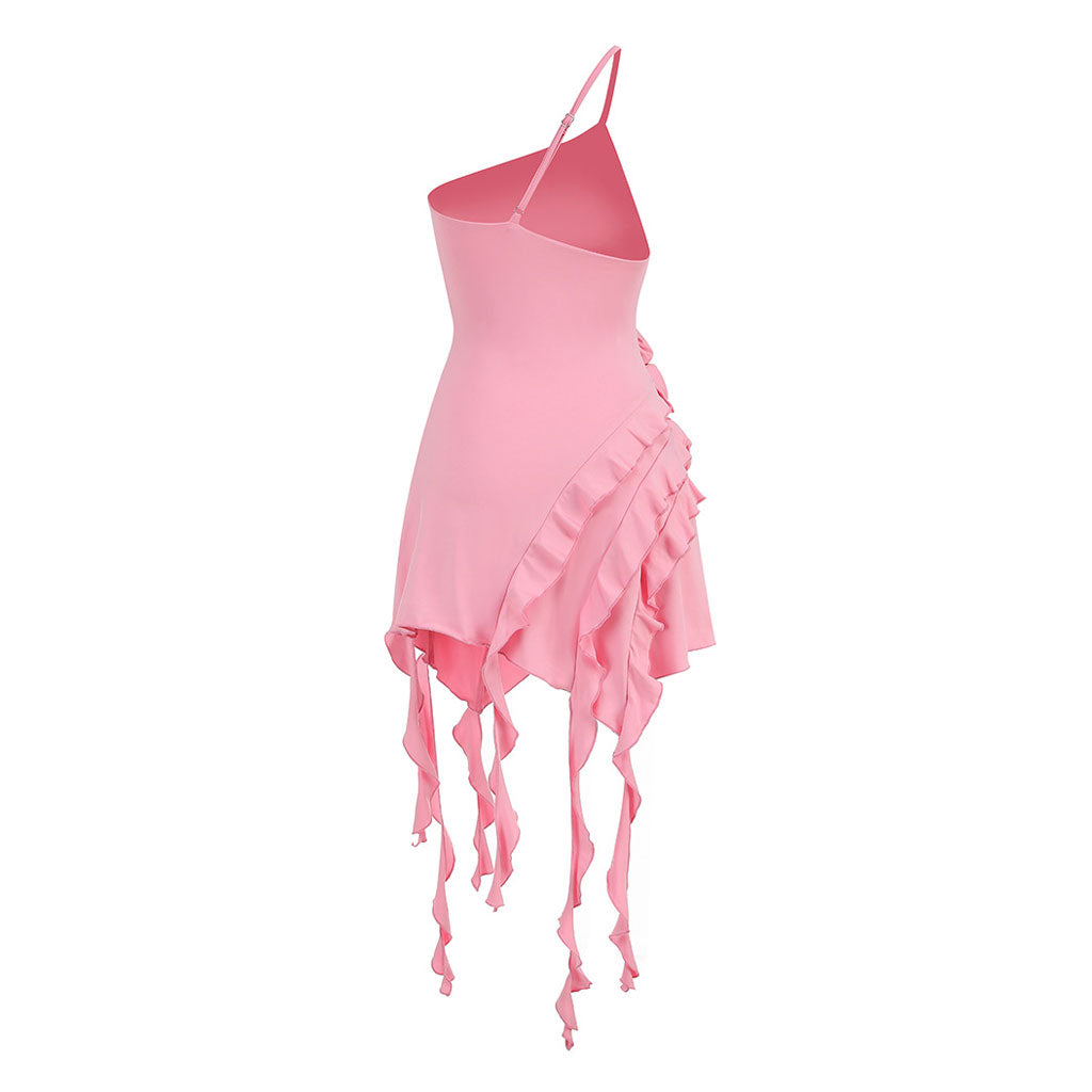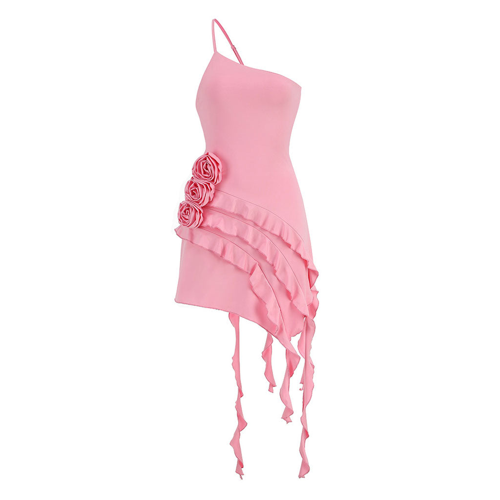 Asymmetric Ruffled One Shoulder Sleeveless Rosette Trim Mini Party Dress