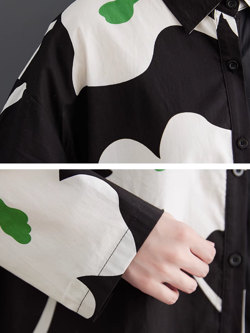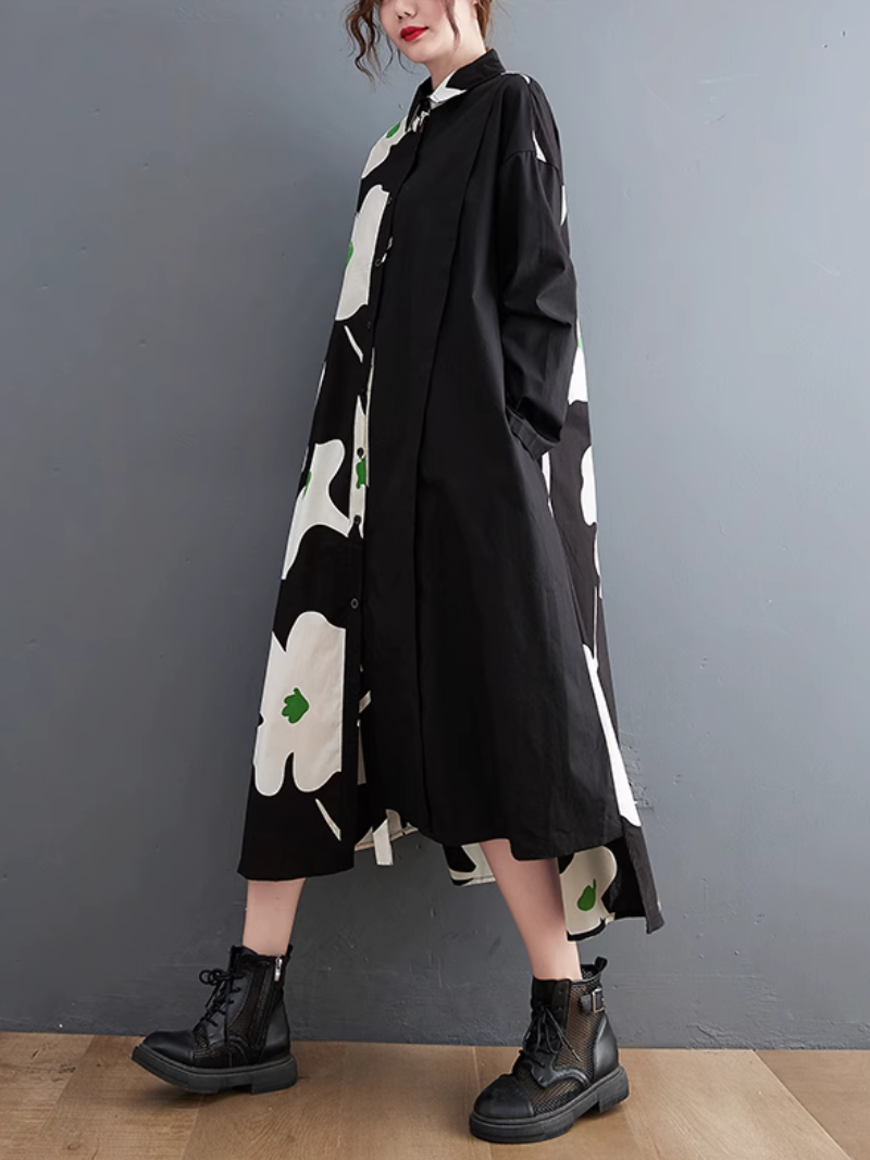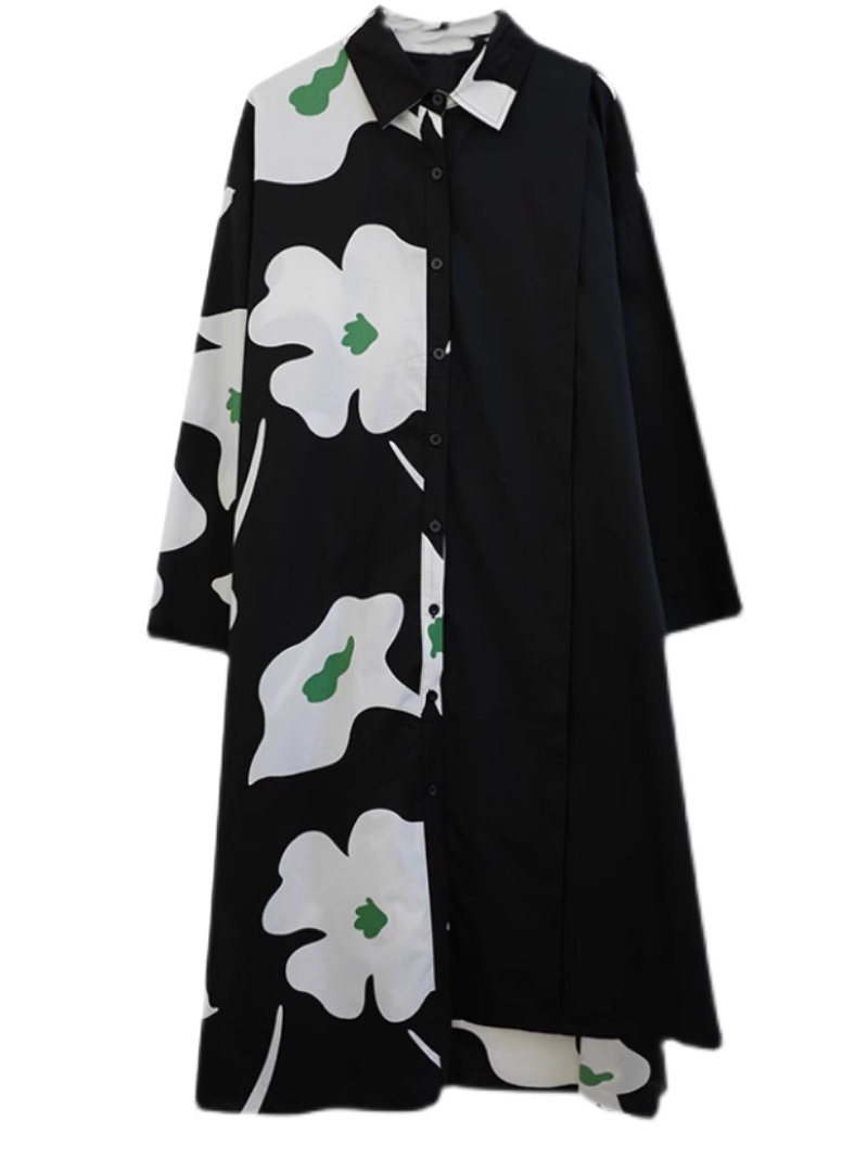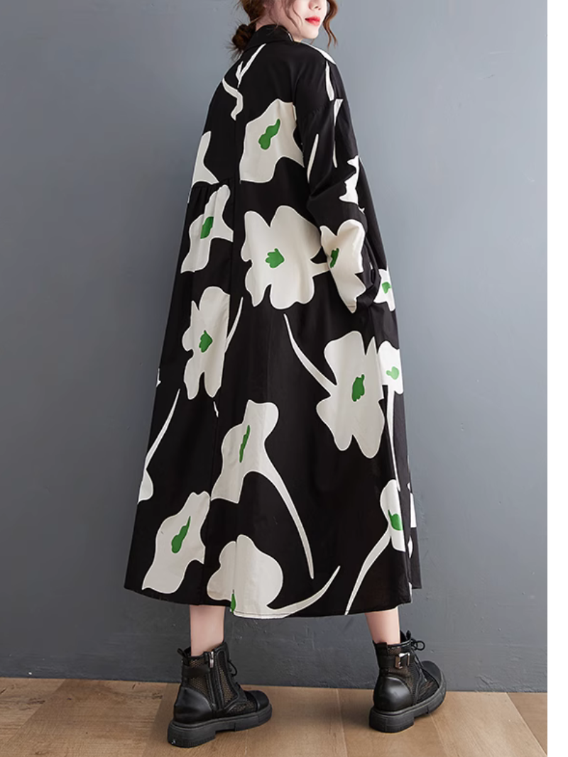 Women's Mid-Length Shirt A-Line Dress ââ‚?a perfect fusion of comfort and style. Crafted from a blend of high-quality cotton. it embodies luxury and ease. Designed with shirt sleeves and a loose waist. it's the epitome of laid-back charm. The dress boasts a unique color pattern and features convenient side pockets. The collar adds a refined touch to its relaxed design. Available in a free size. the dress measures 116cm in length. with a bust of 122cm. sleeves of 50cm. and a shoulder width of 58cm. Elevate your casual fashion game with this effortlessly chic A-line dress.