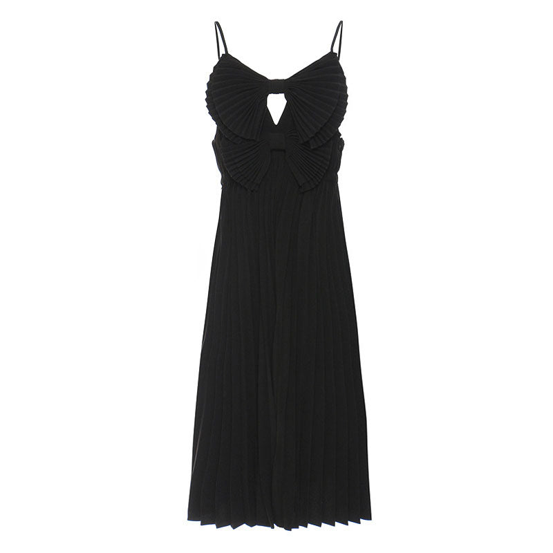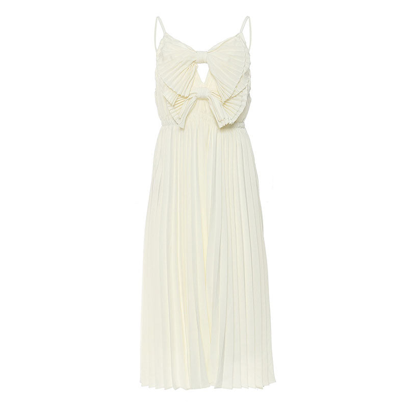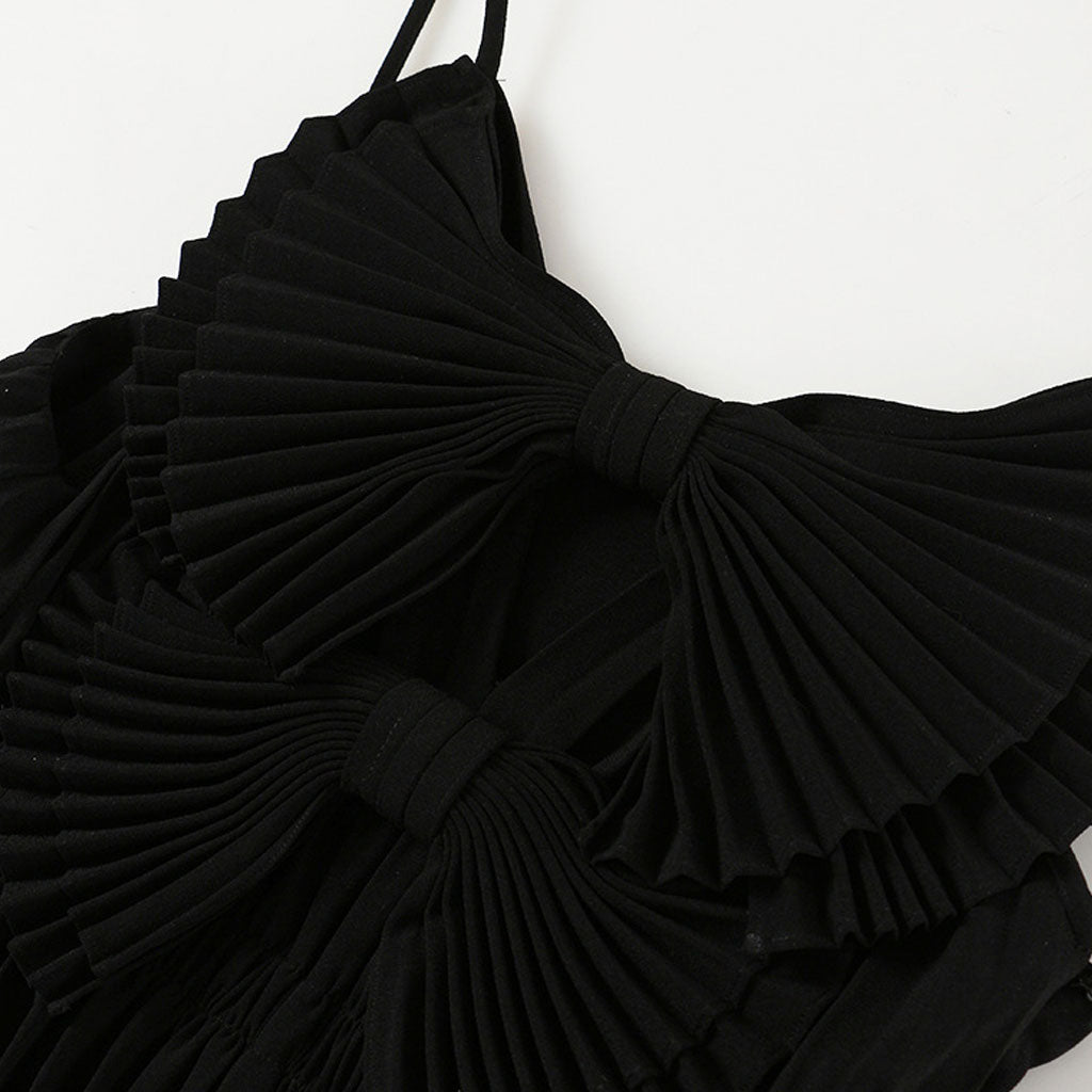 Cute V Neck Big Dual Bow Spaghetti Strap Pleated Midi Chiffon Slip Dress
