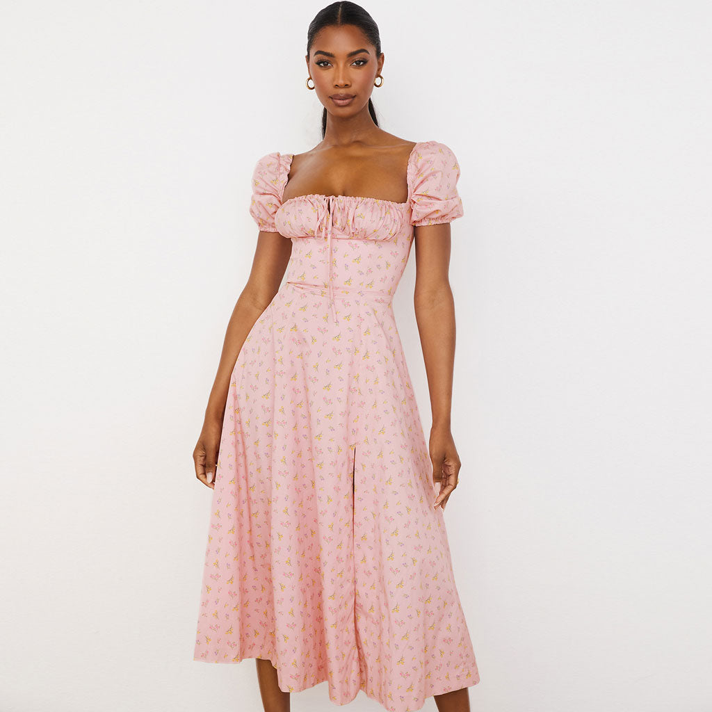 Daisy Printed Puff Sleeve High Slit Smock Maxi Sundress - Pink