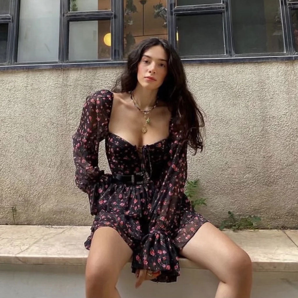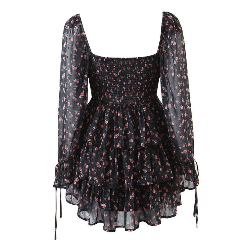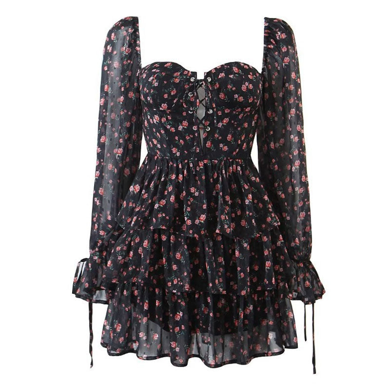 Ditsy Floral Sweetheart Lace Up Bishop Sleeve Tiered Mini Dress - Black