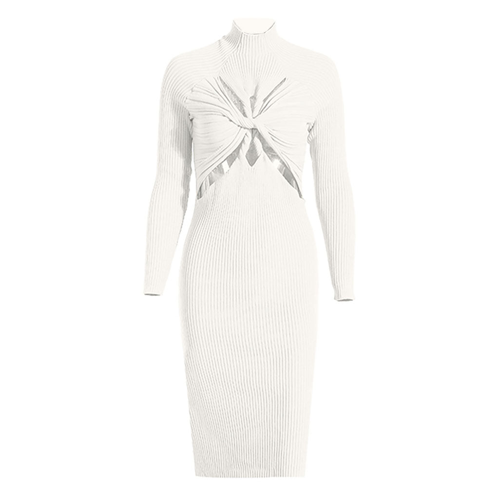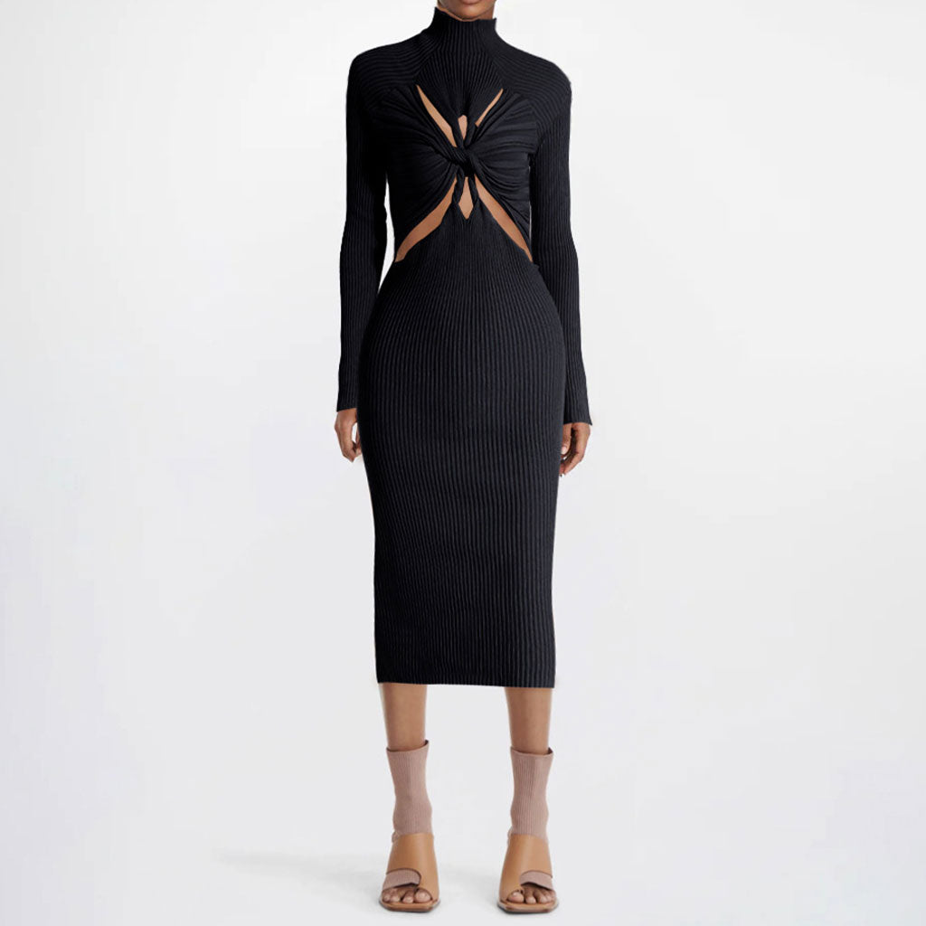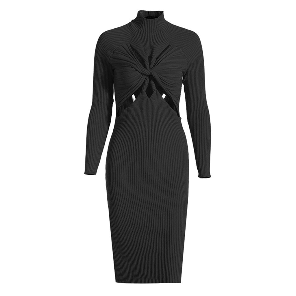 Edgy Twist Front CutOut High Neck Long Sleeve Rib Knit Midi Dress - Black