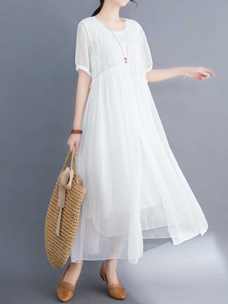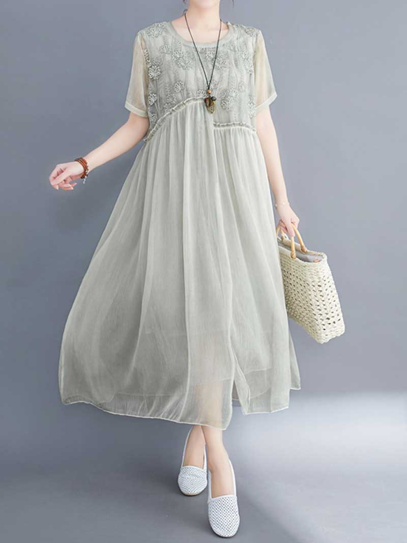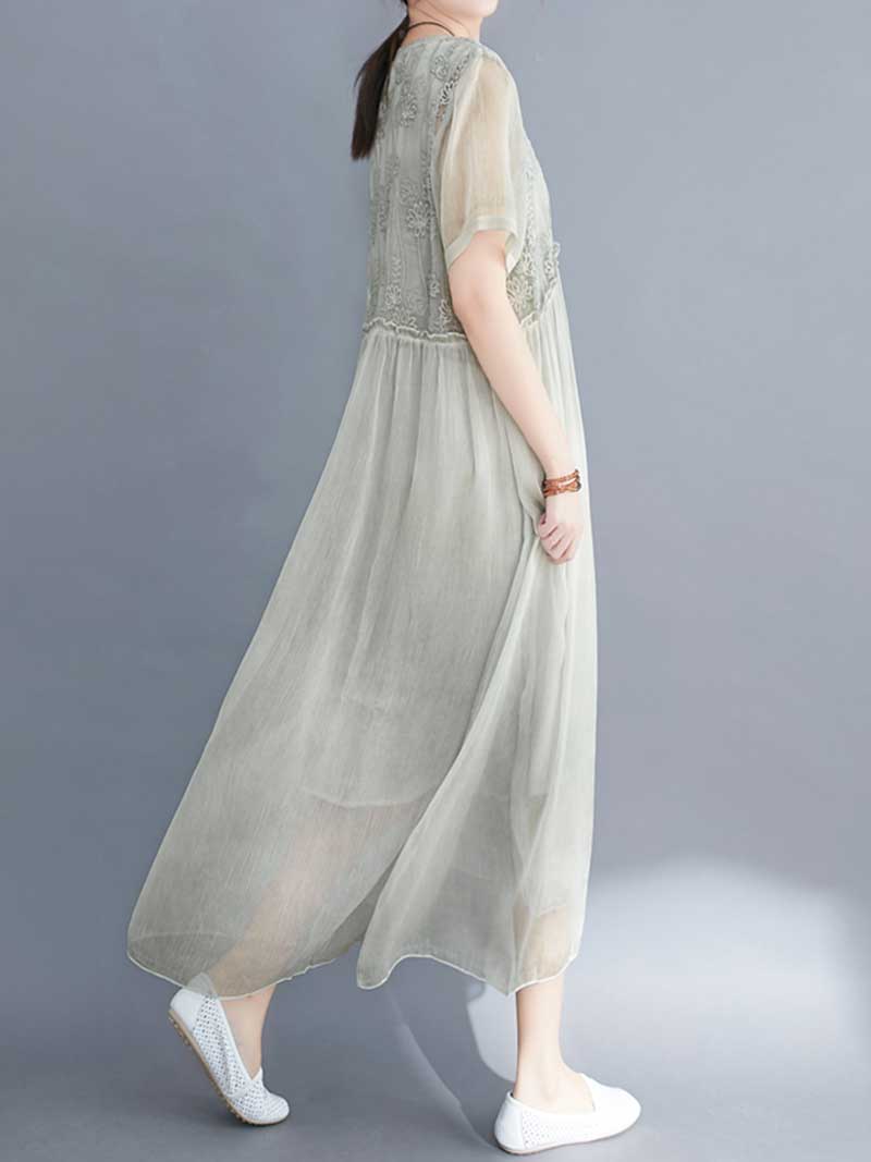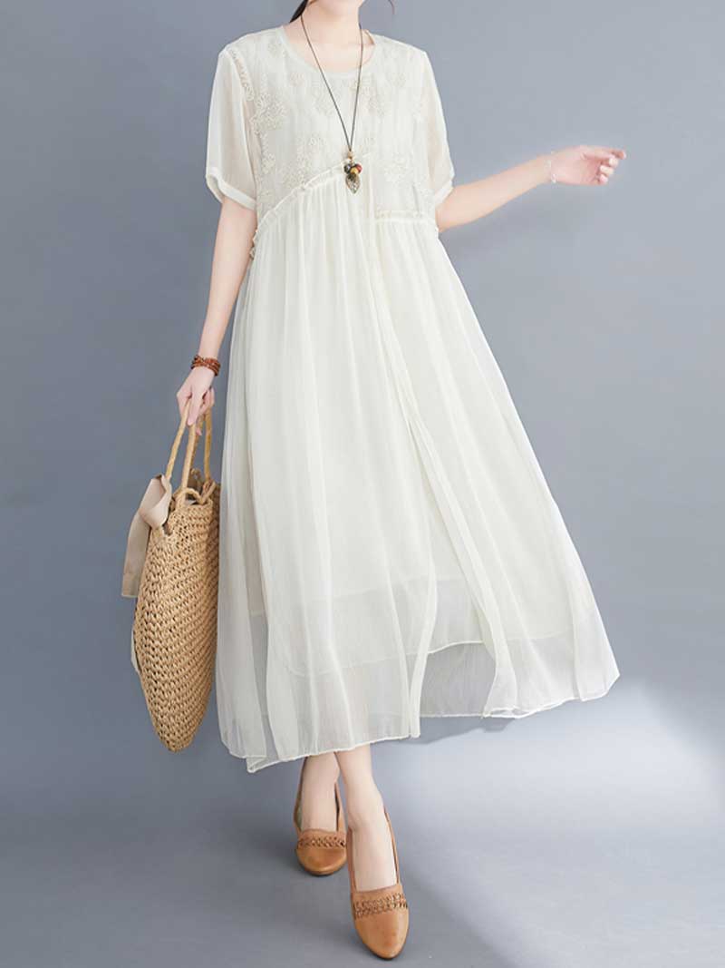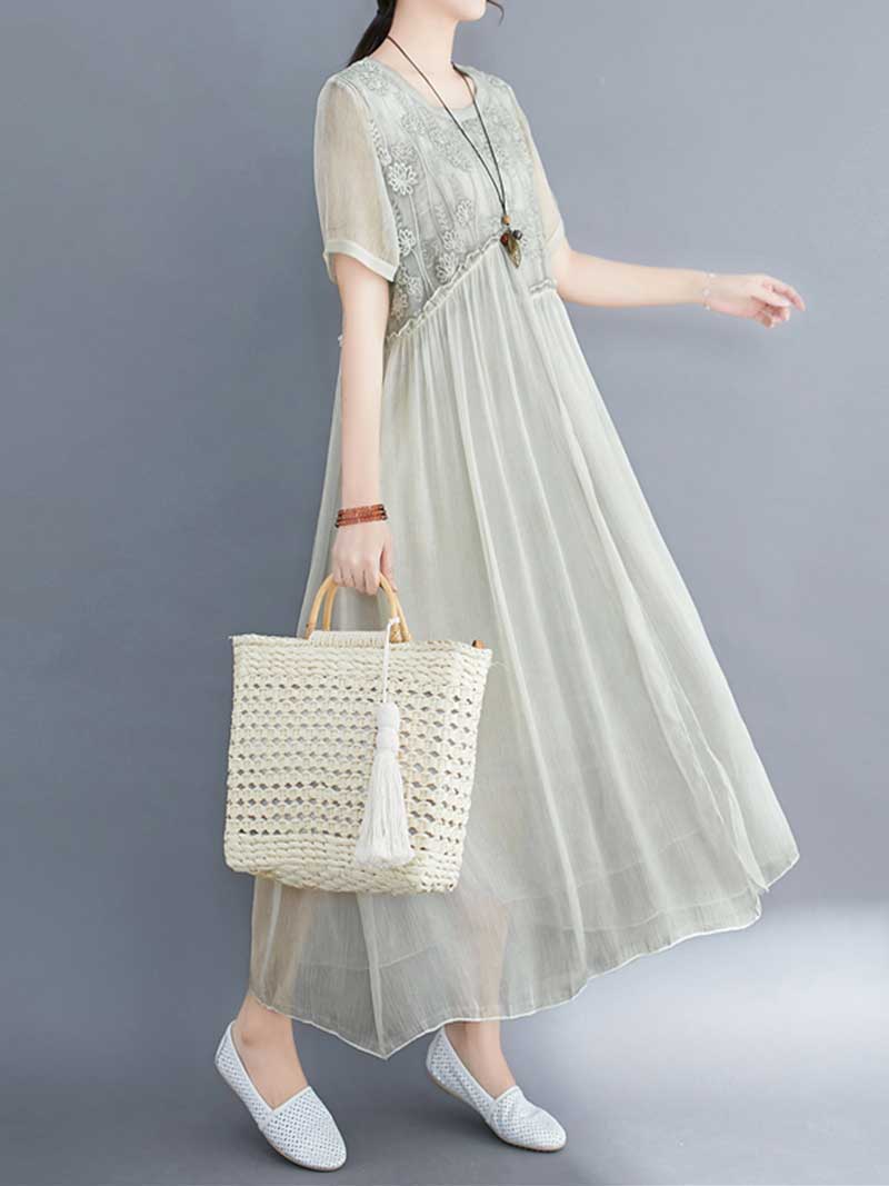 Embroidered Silk Round-Neck A-Line Dress