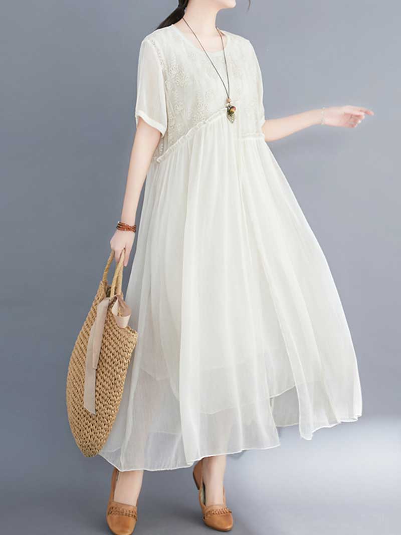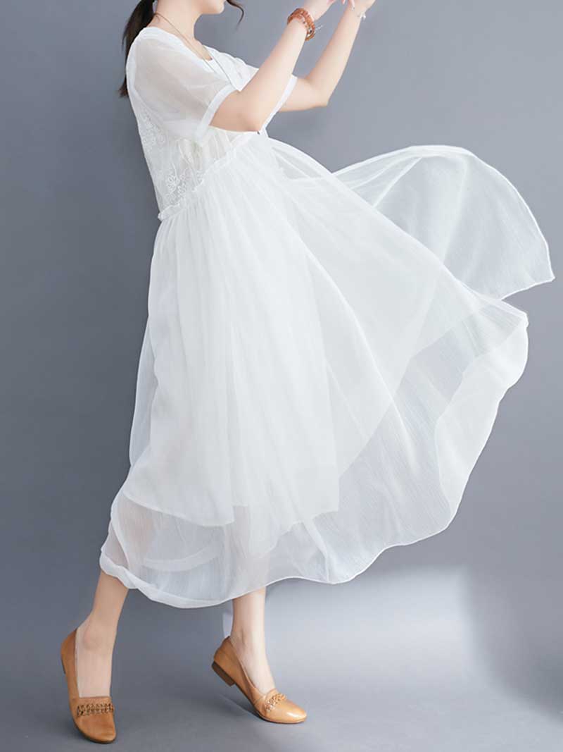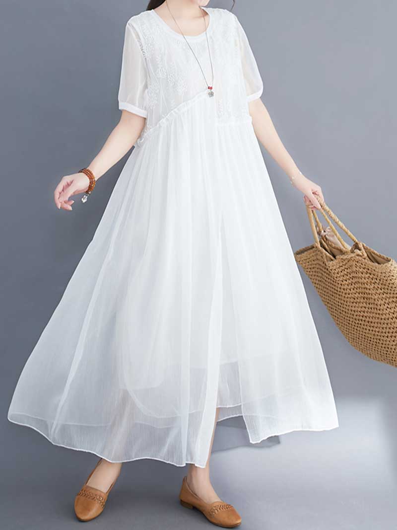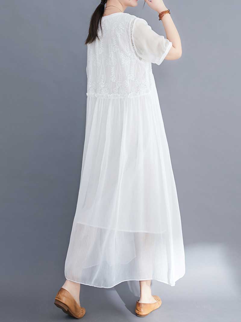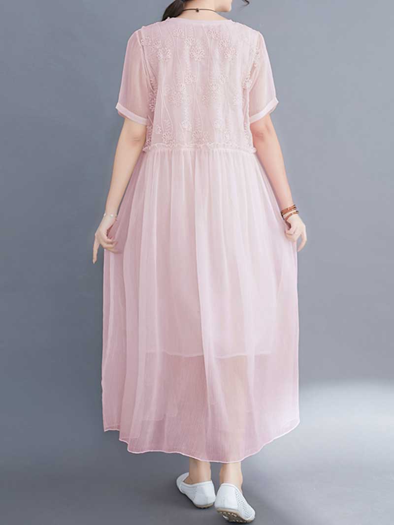 Embroidered Silk Round-Neck A-Line Dress