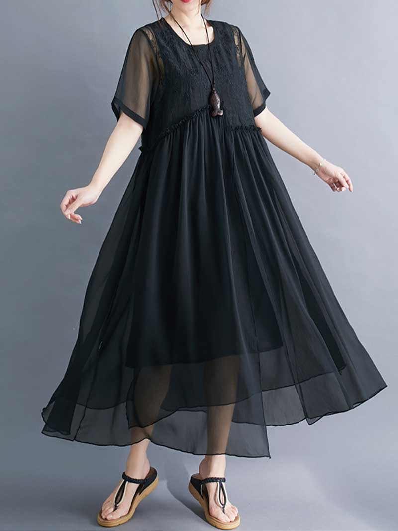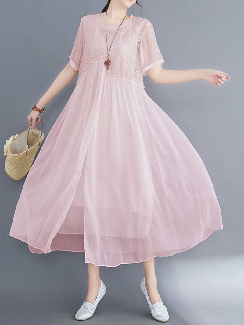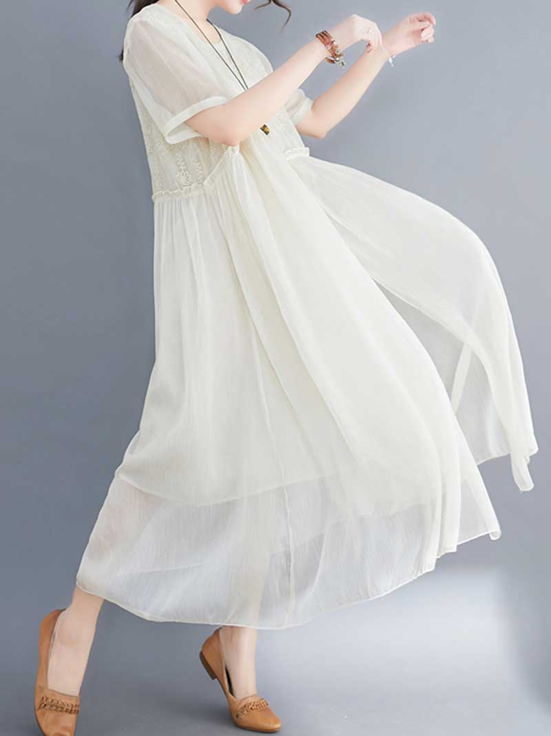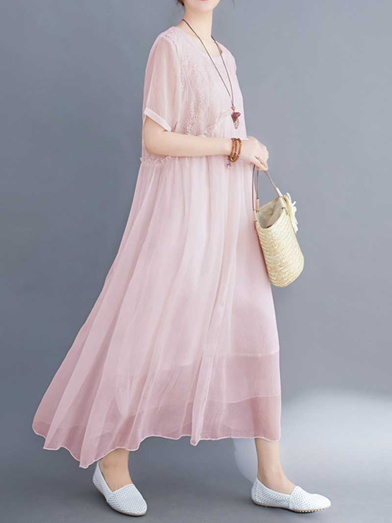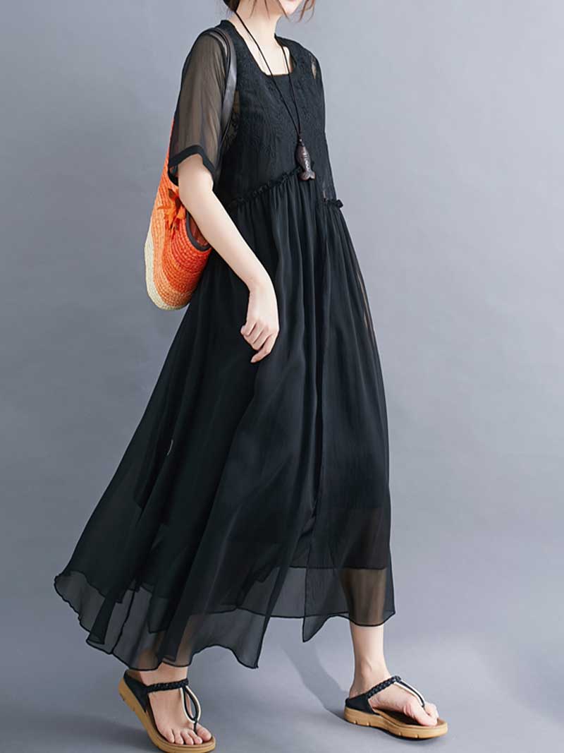 Embroidered Silk Round-Neck A-Line Dress