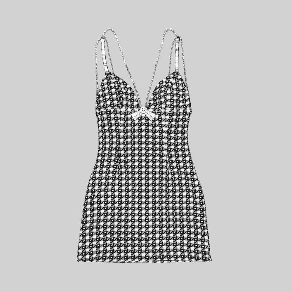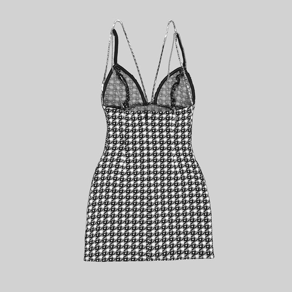 ESTEMA HOUNDSTOOTH V NECK Crystal BOW TIE Mini Dress