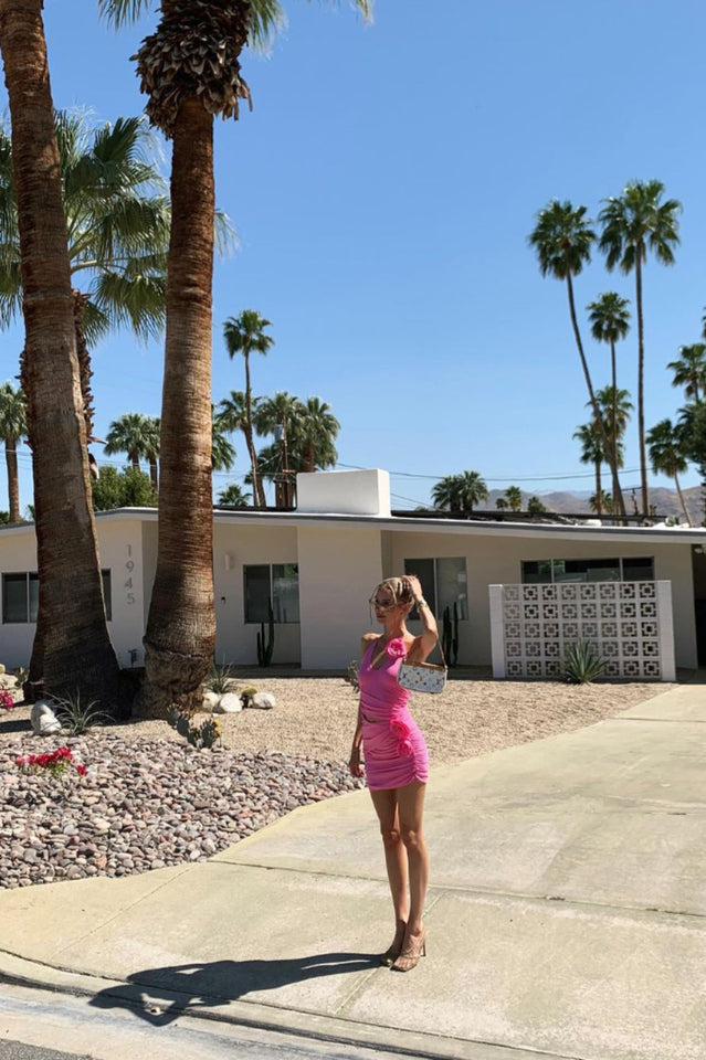 Show off your flirty side in this pink mini dress accentuated by 3D floral appliques. Strategic cut outs reveal a peek of skin while the slim fit highlights your silhouette. The short hemline lets you show off your legs. Slip into this fun and feminine dress for your next daytime soiree or date night!